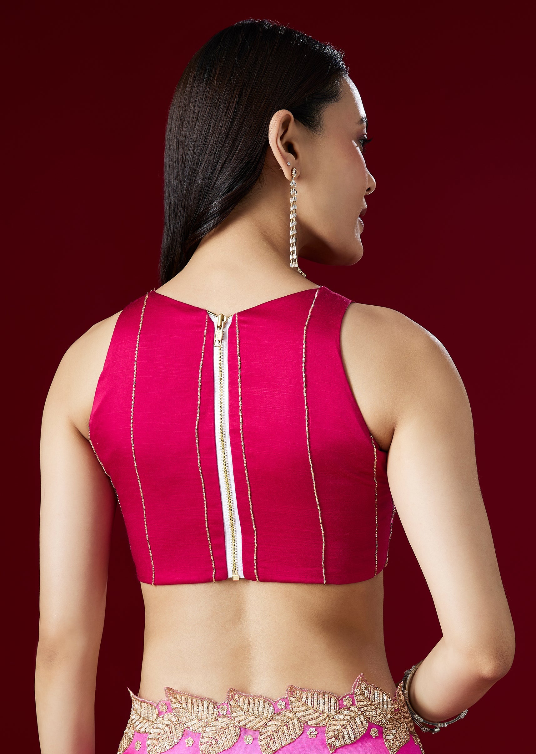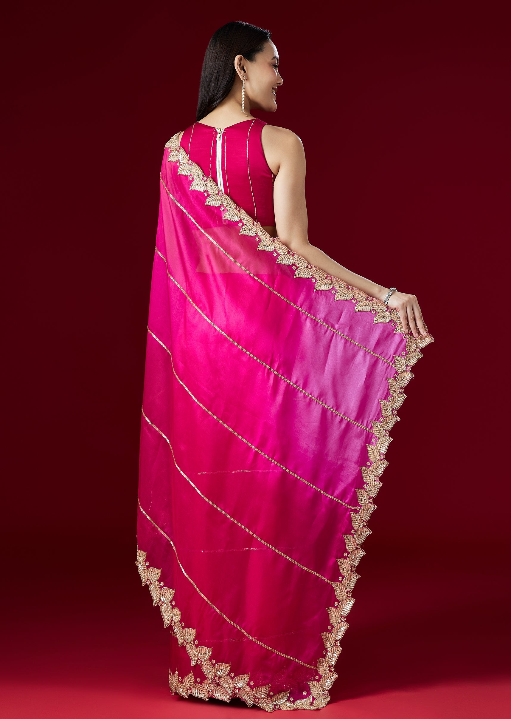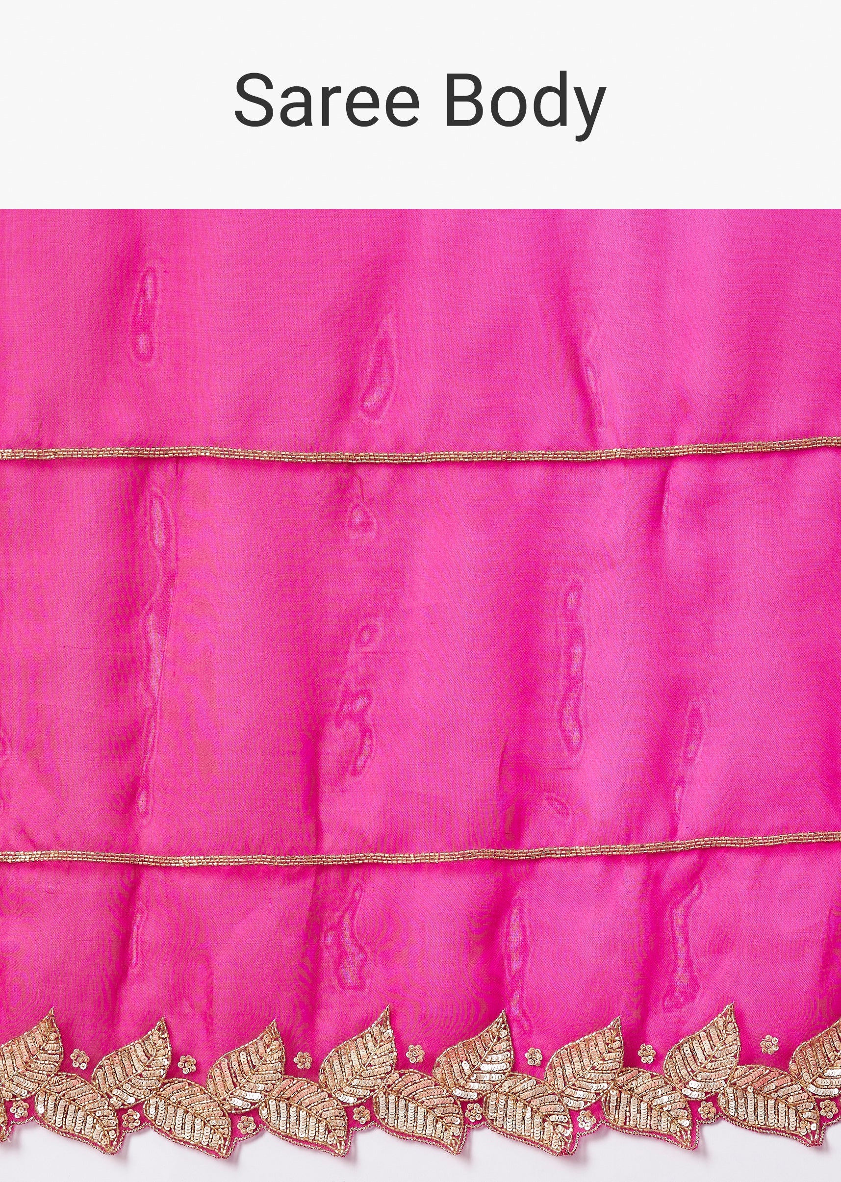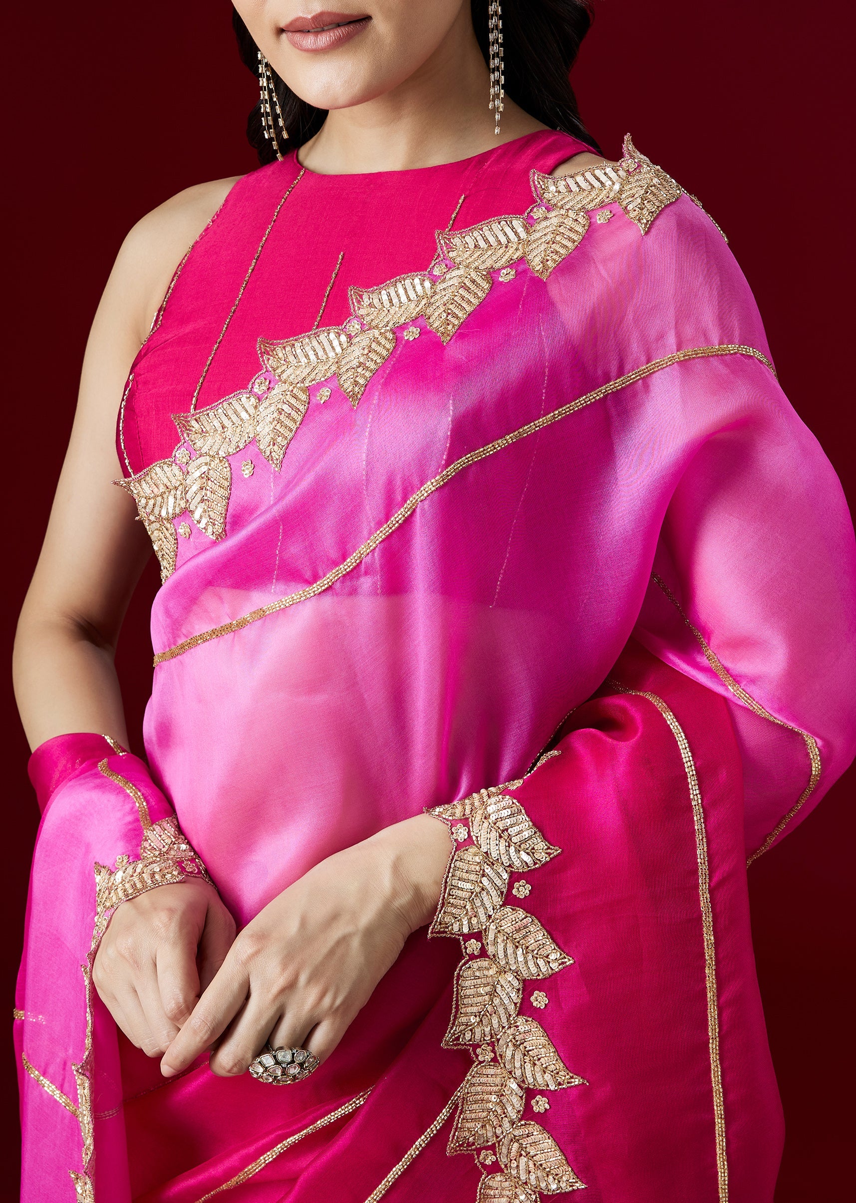 A stunning dual pink shaded organza silk saree featuring a cutwork border and leaf motif embroidery enhanced with cutdana and sequins. The embroidered stripes across the saree and blouse fabric... More Product Details