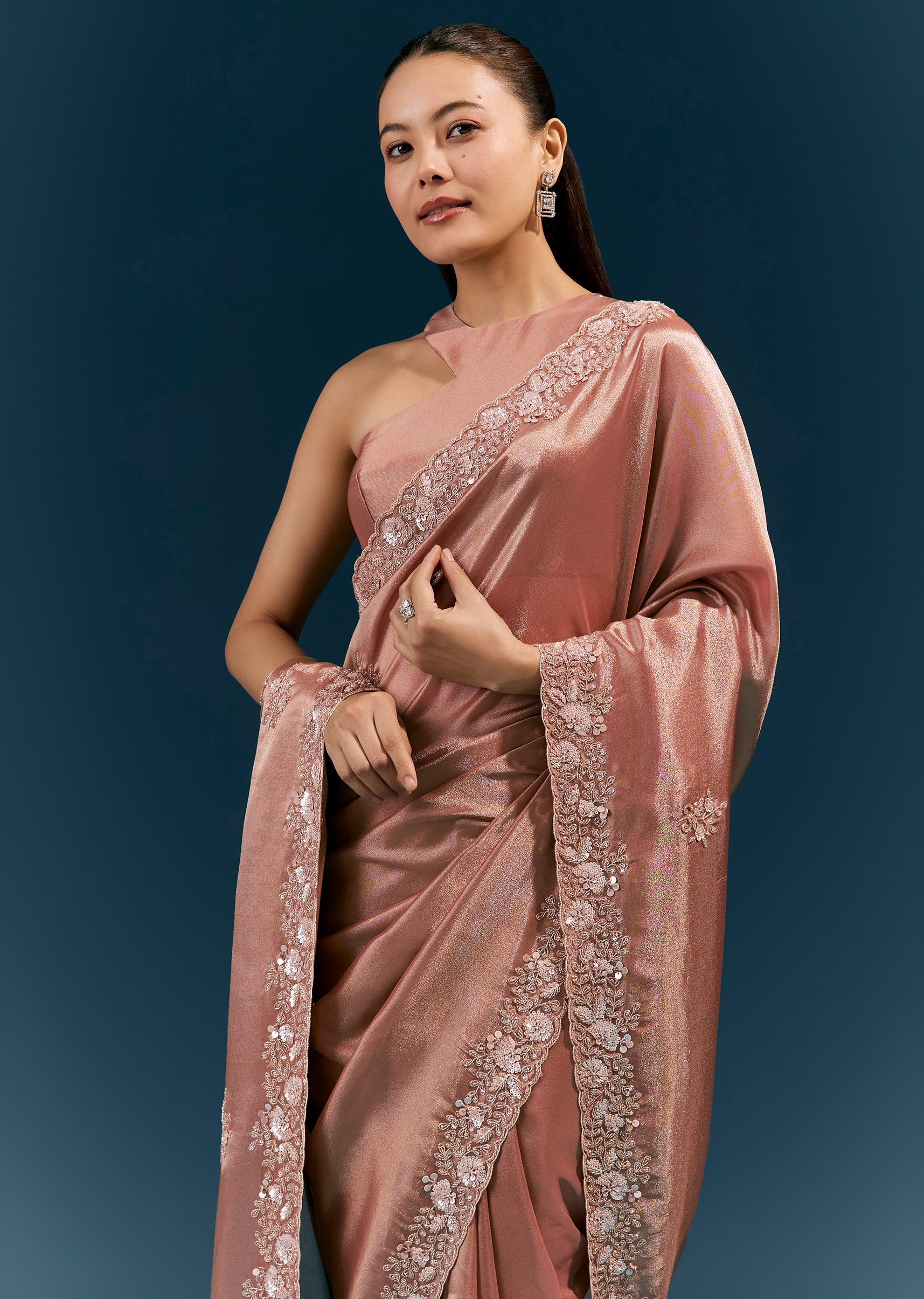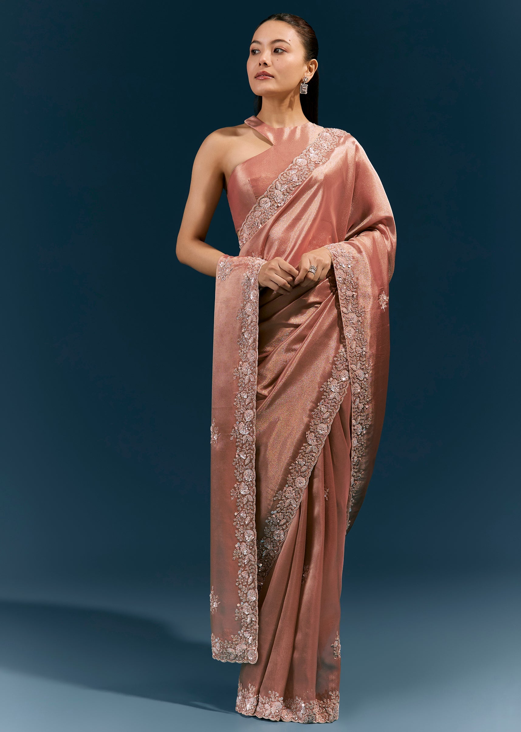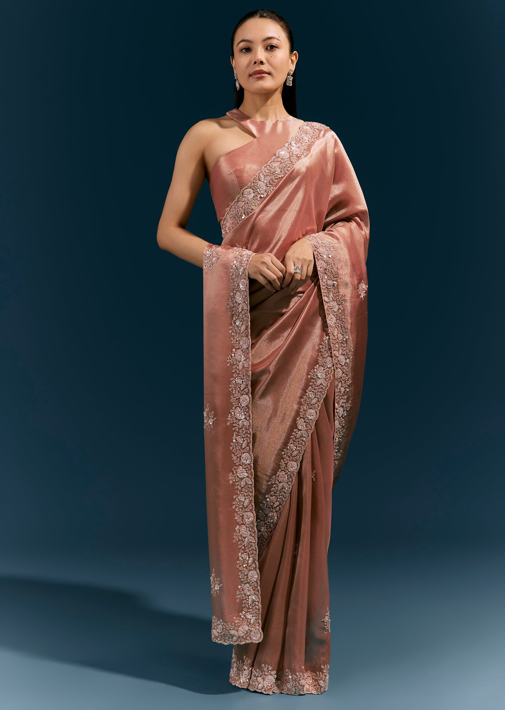 Dusky Beige Tissue Saree With Heavy Floral Embroidered Cutwork Border And Butti