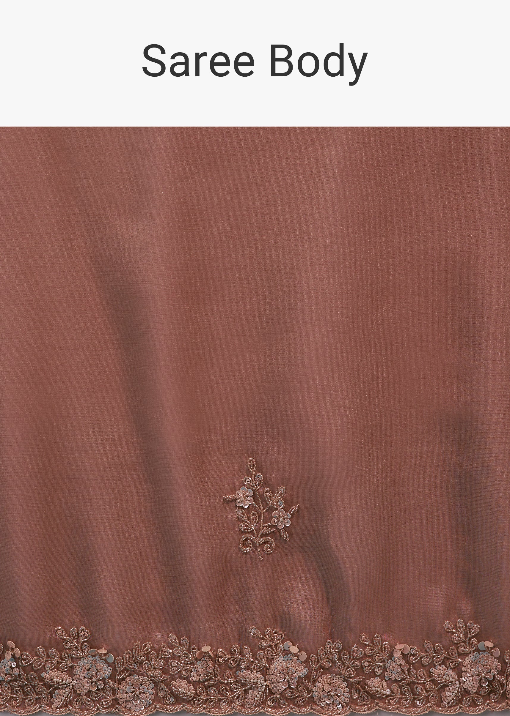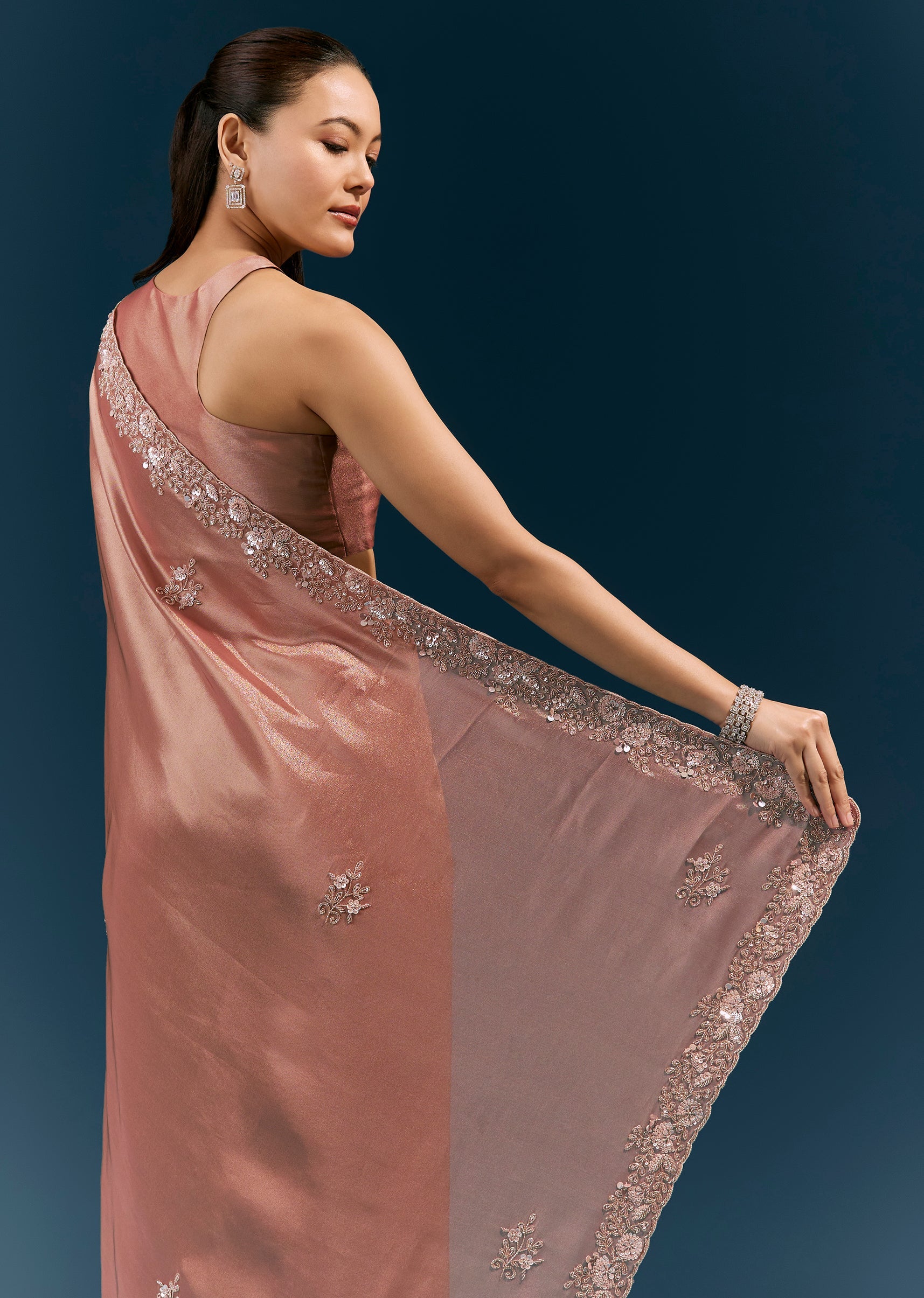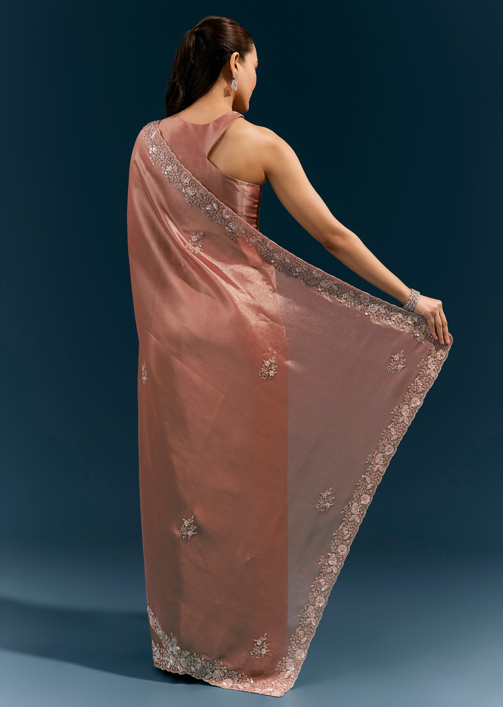 Dusky Beige Tissue Saree With Heavy Floral Embroidered Cutwork Border And Butti