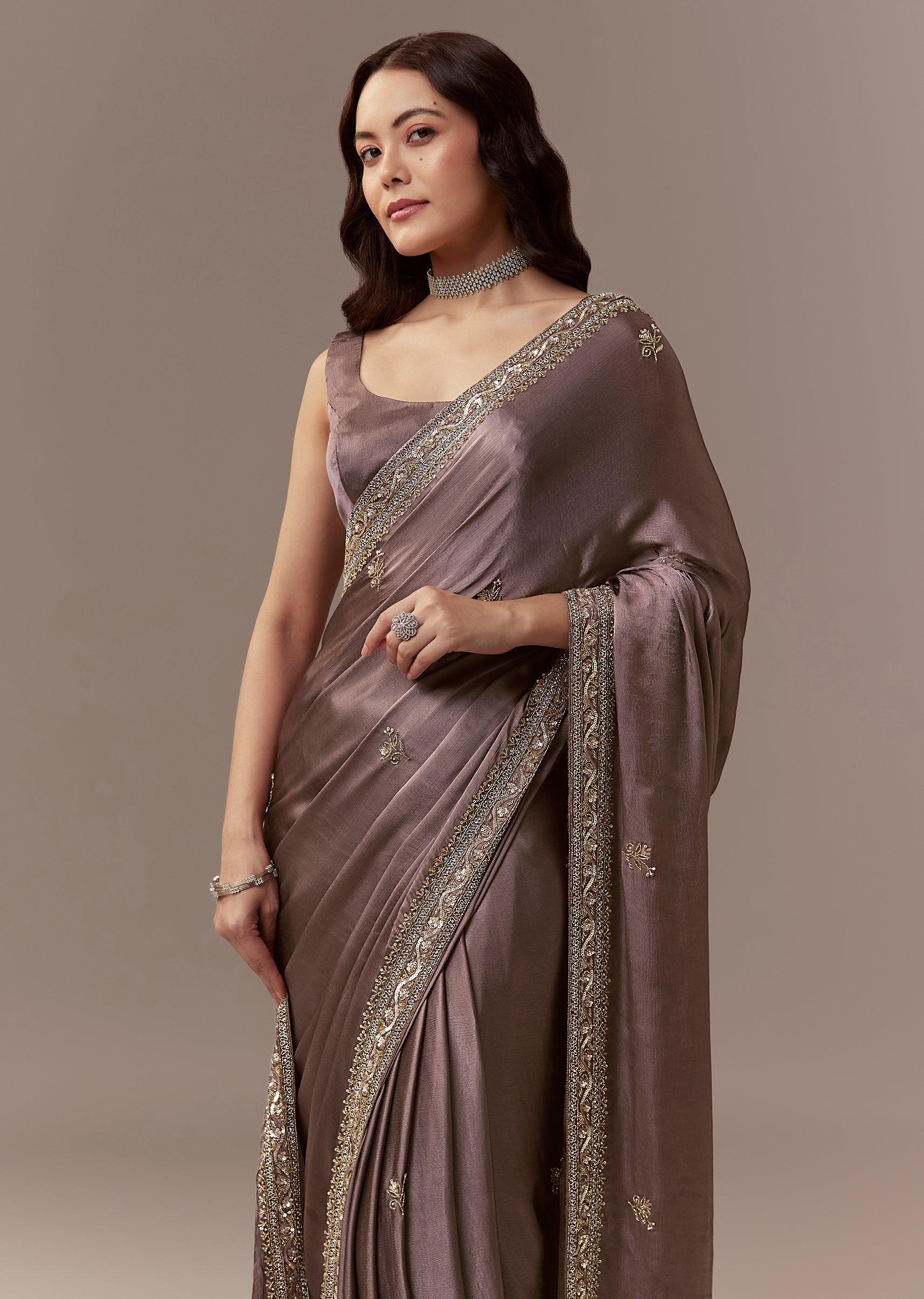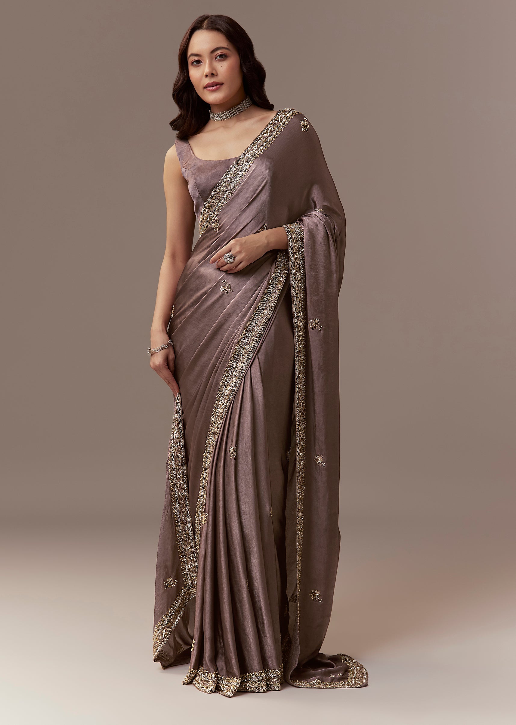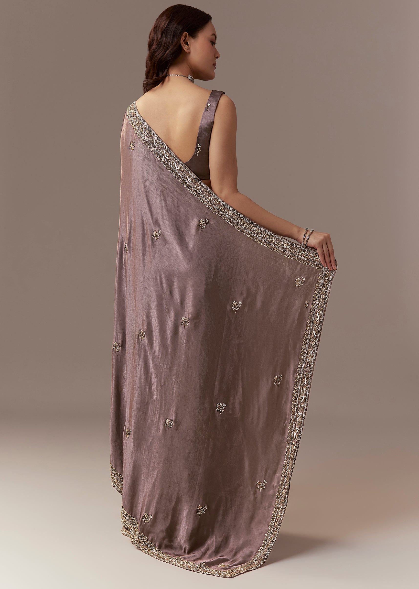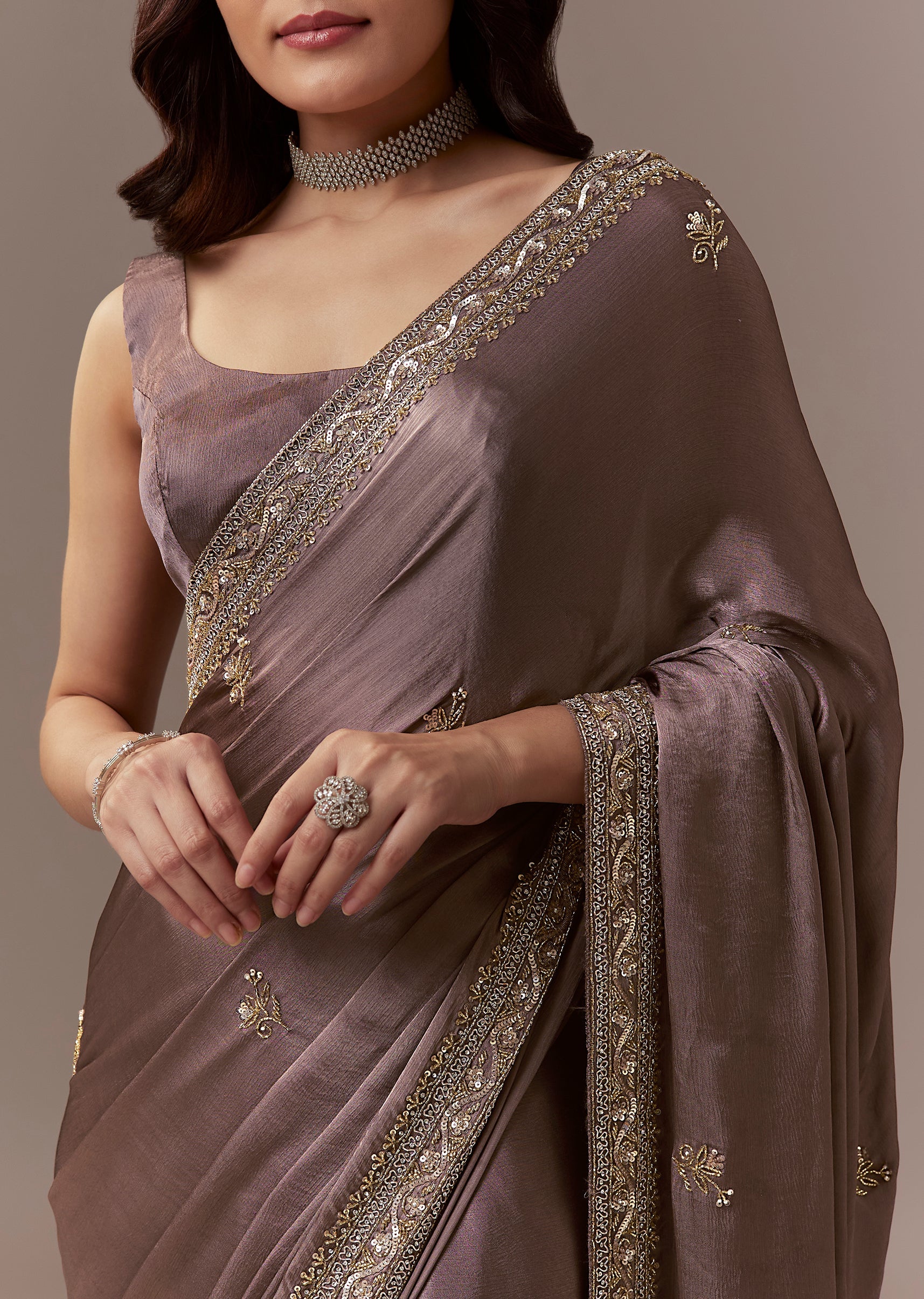 Dusky Brown Chinnon Saree With Cutdana Beads And Sequin Embroidery