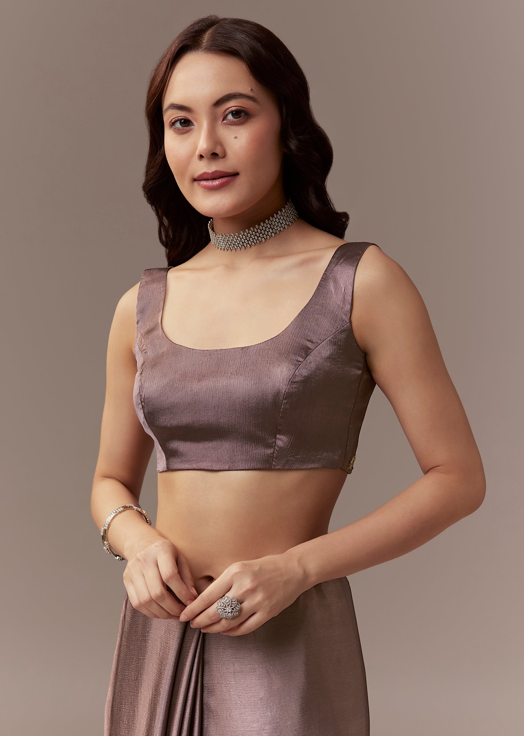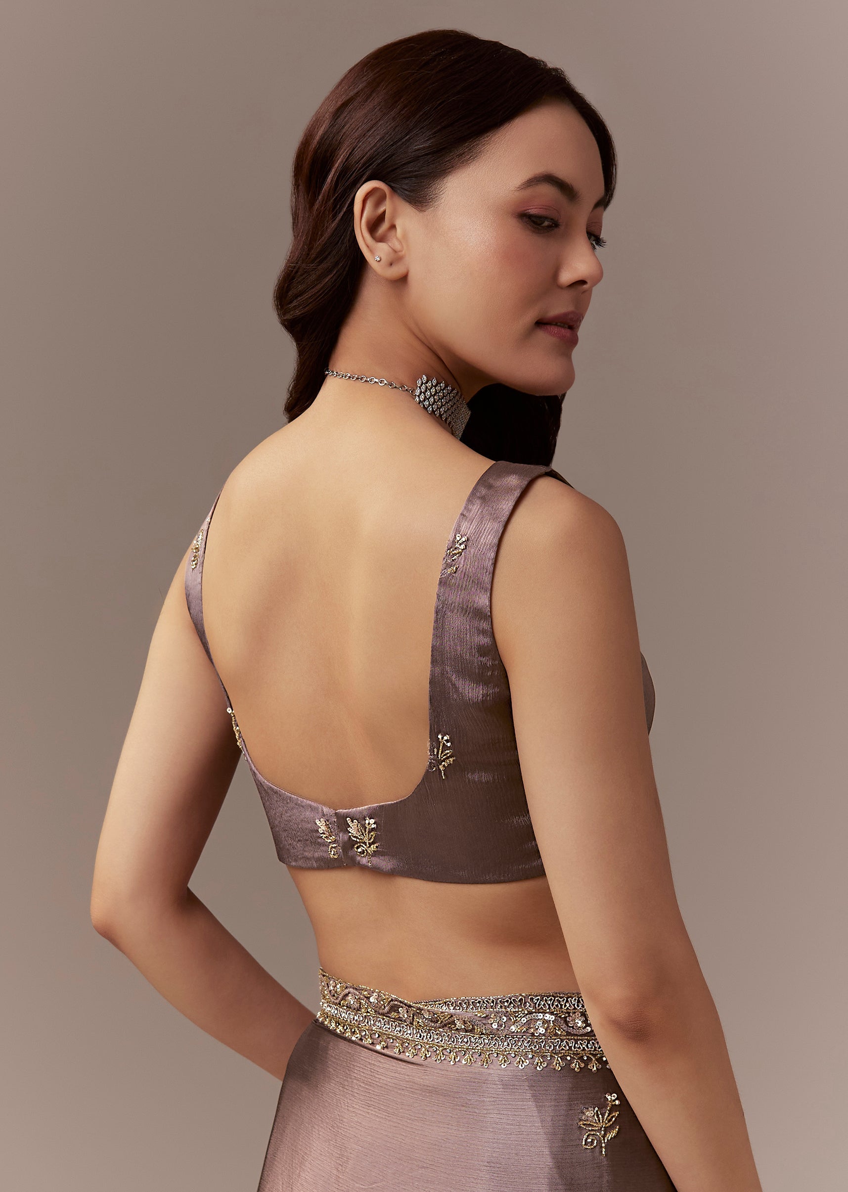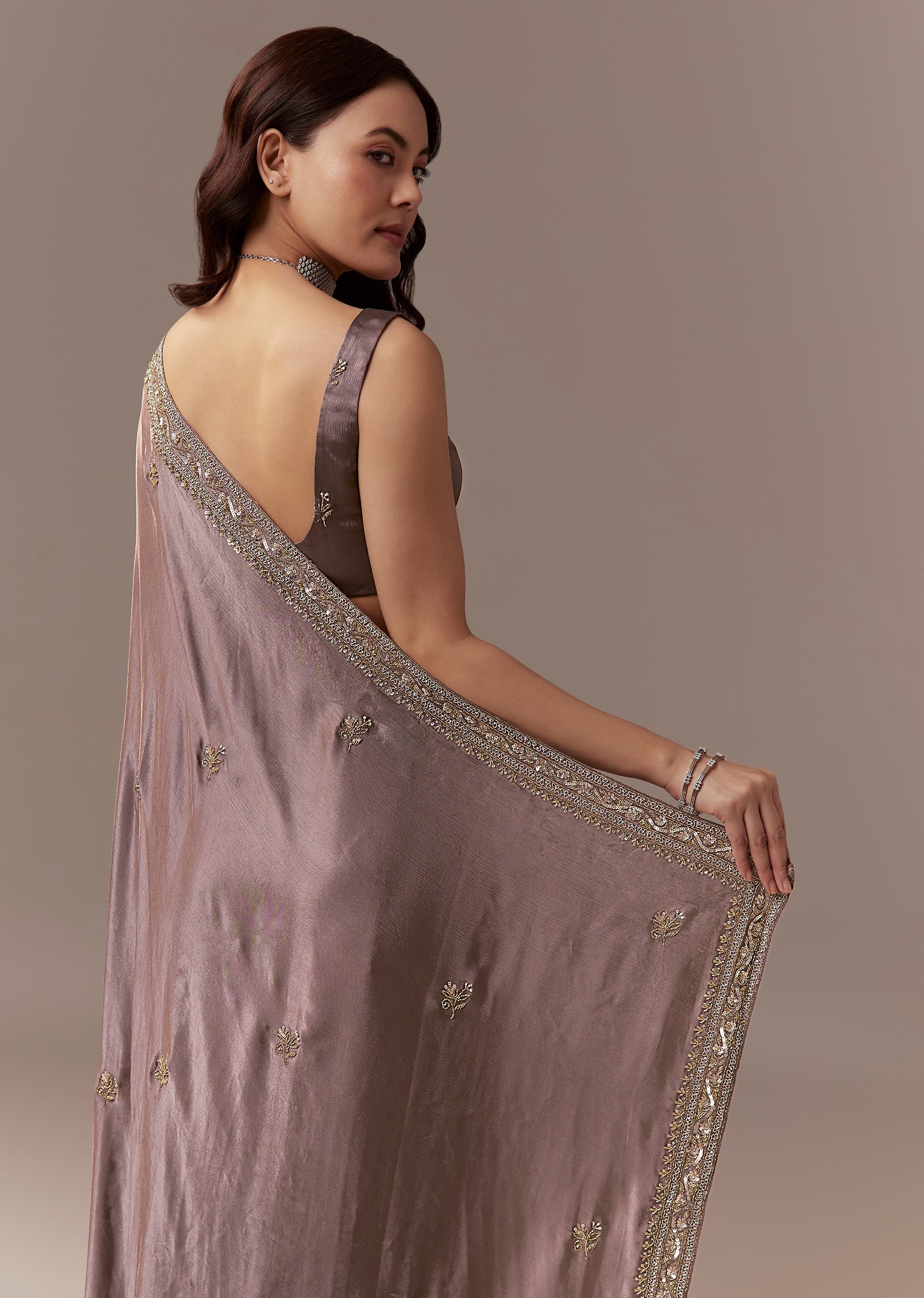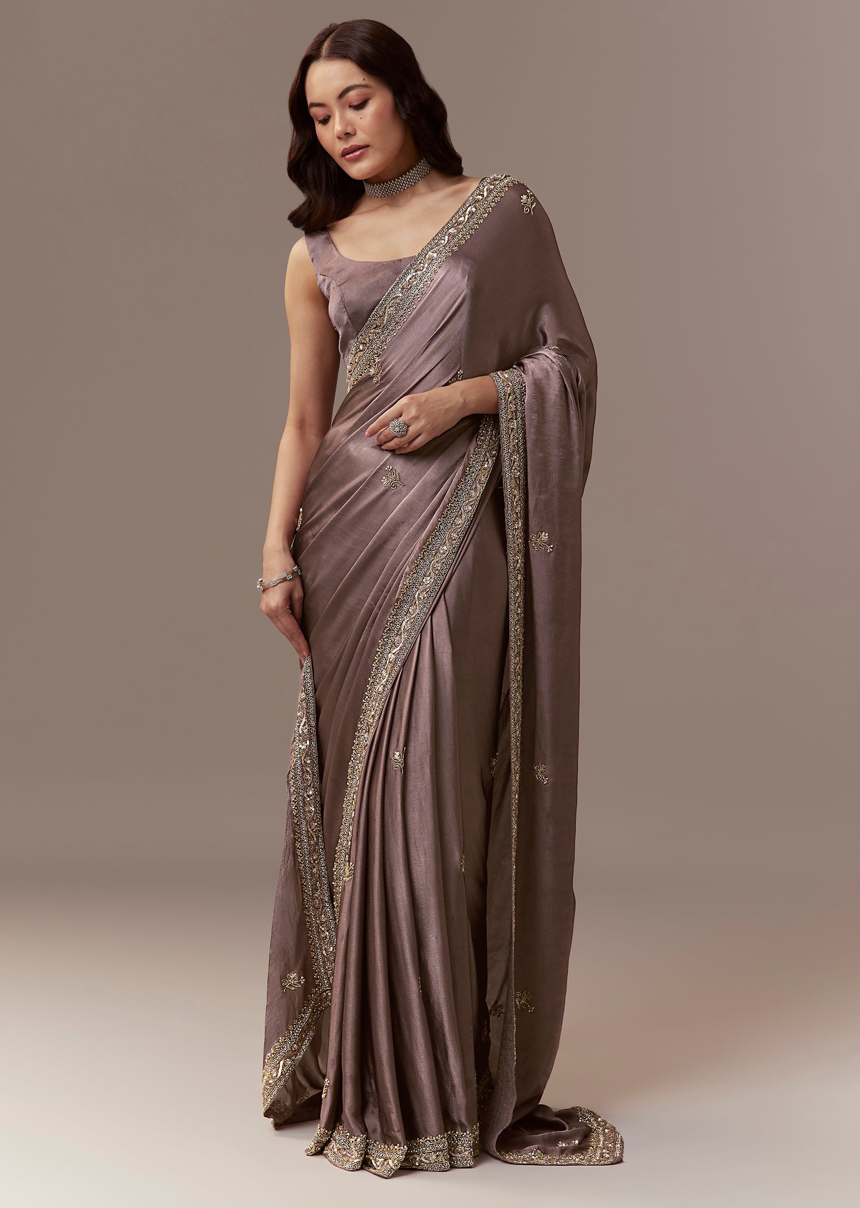 Dusky Brown Chinnon Saree With Cutdana Beads And Sequin Embroidery