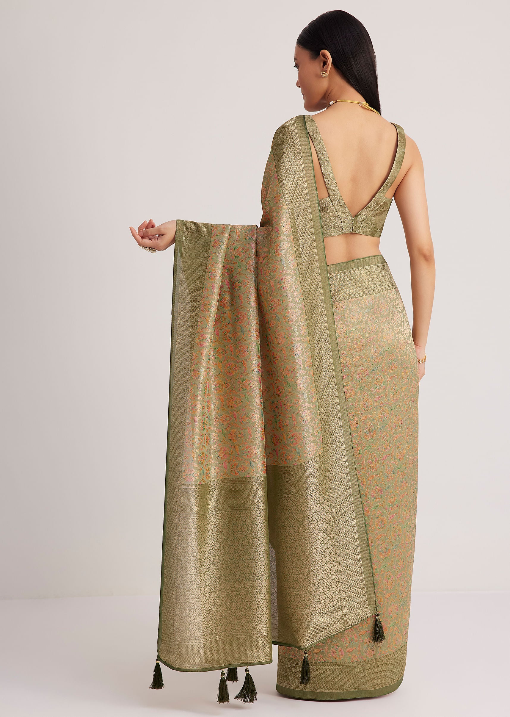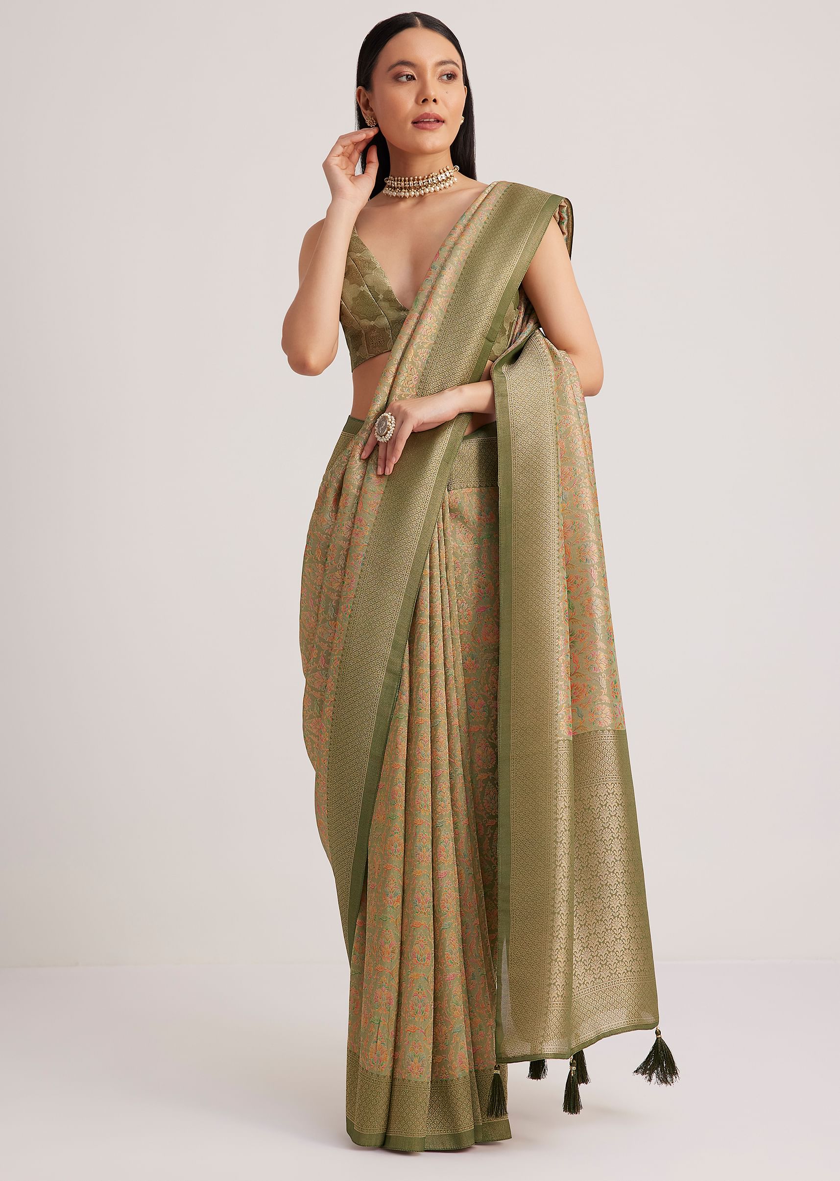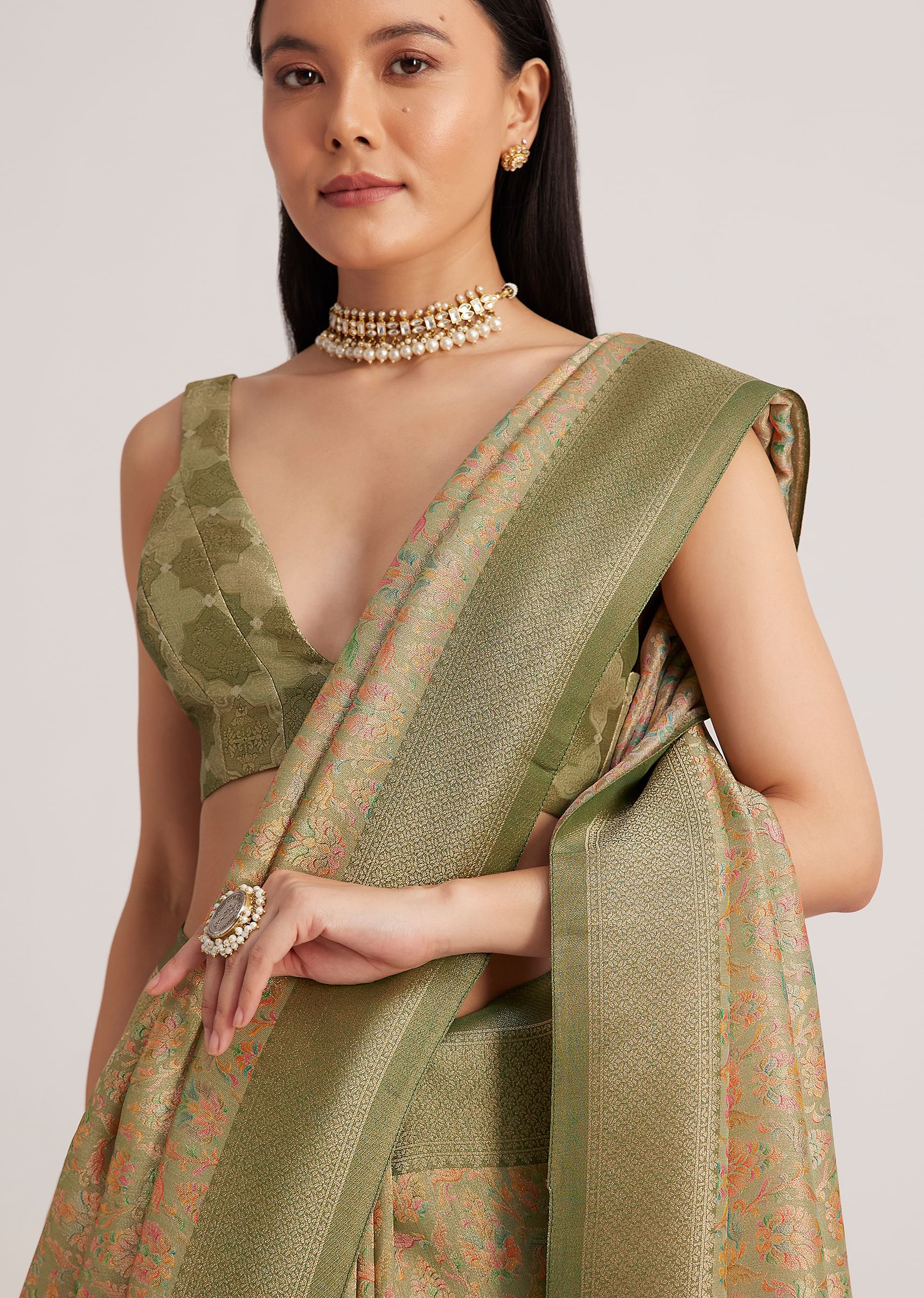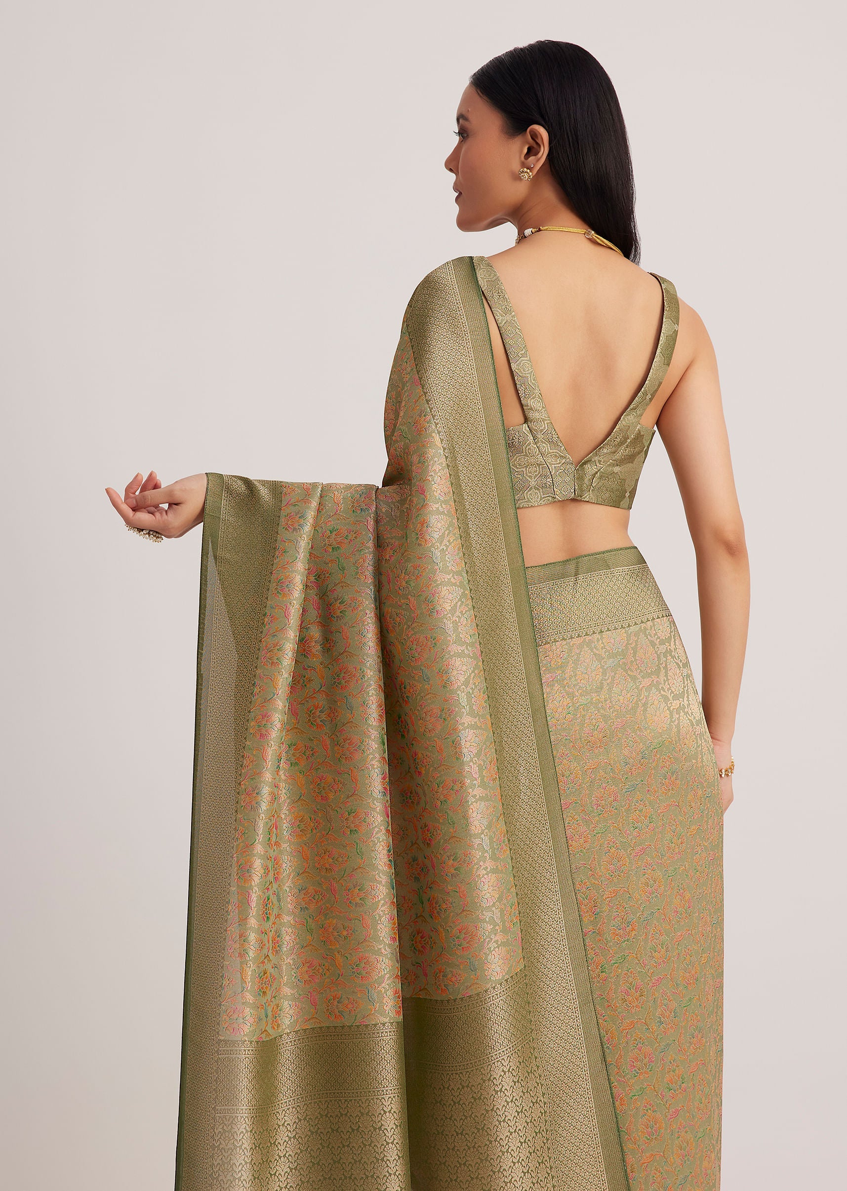 The dusky green saree pairs well with vintage-inspired jewelry and a soft, neutral makeup look. Let the fabric's elegance shine.