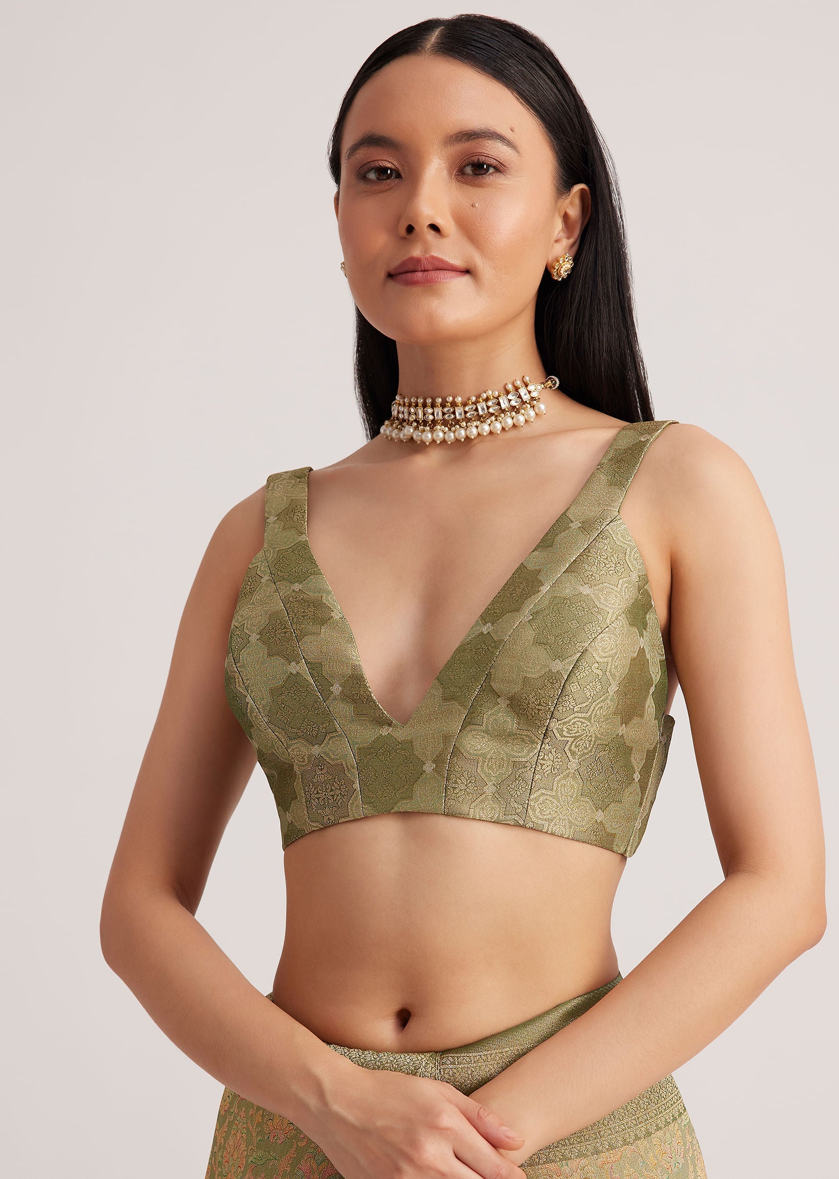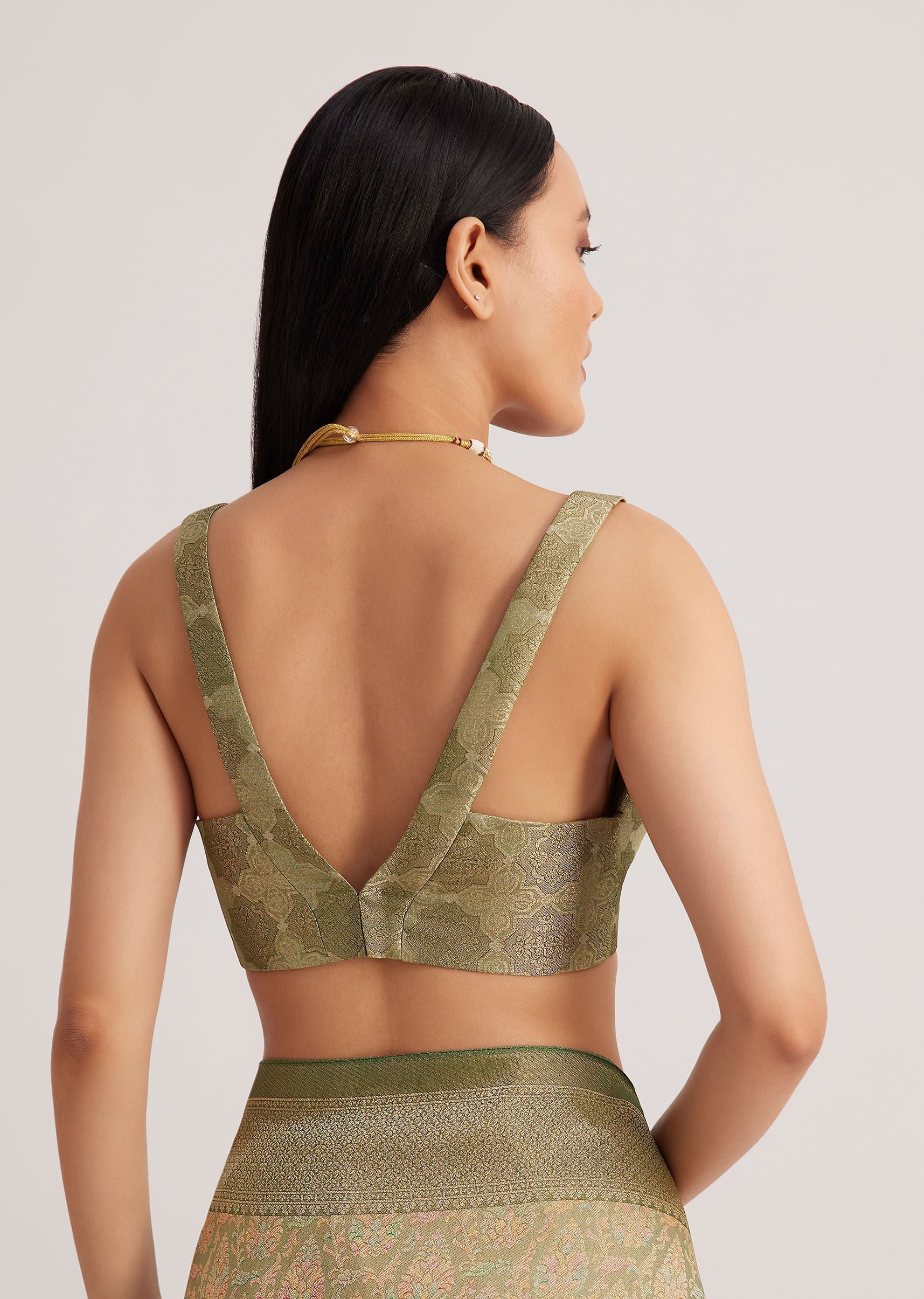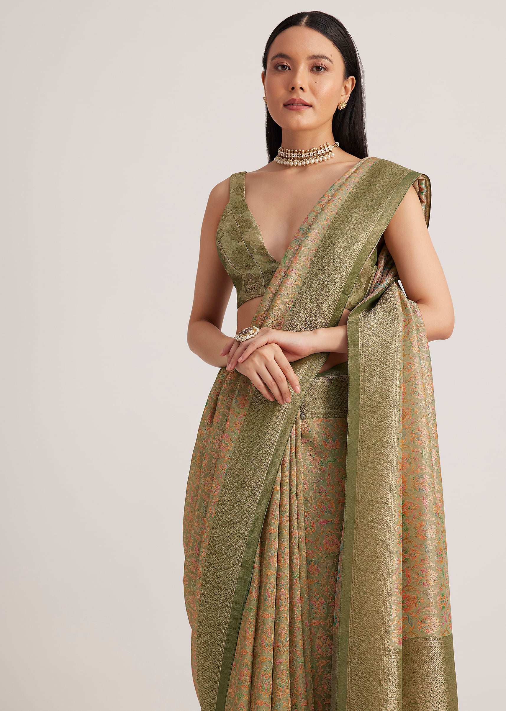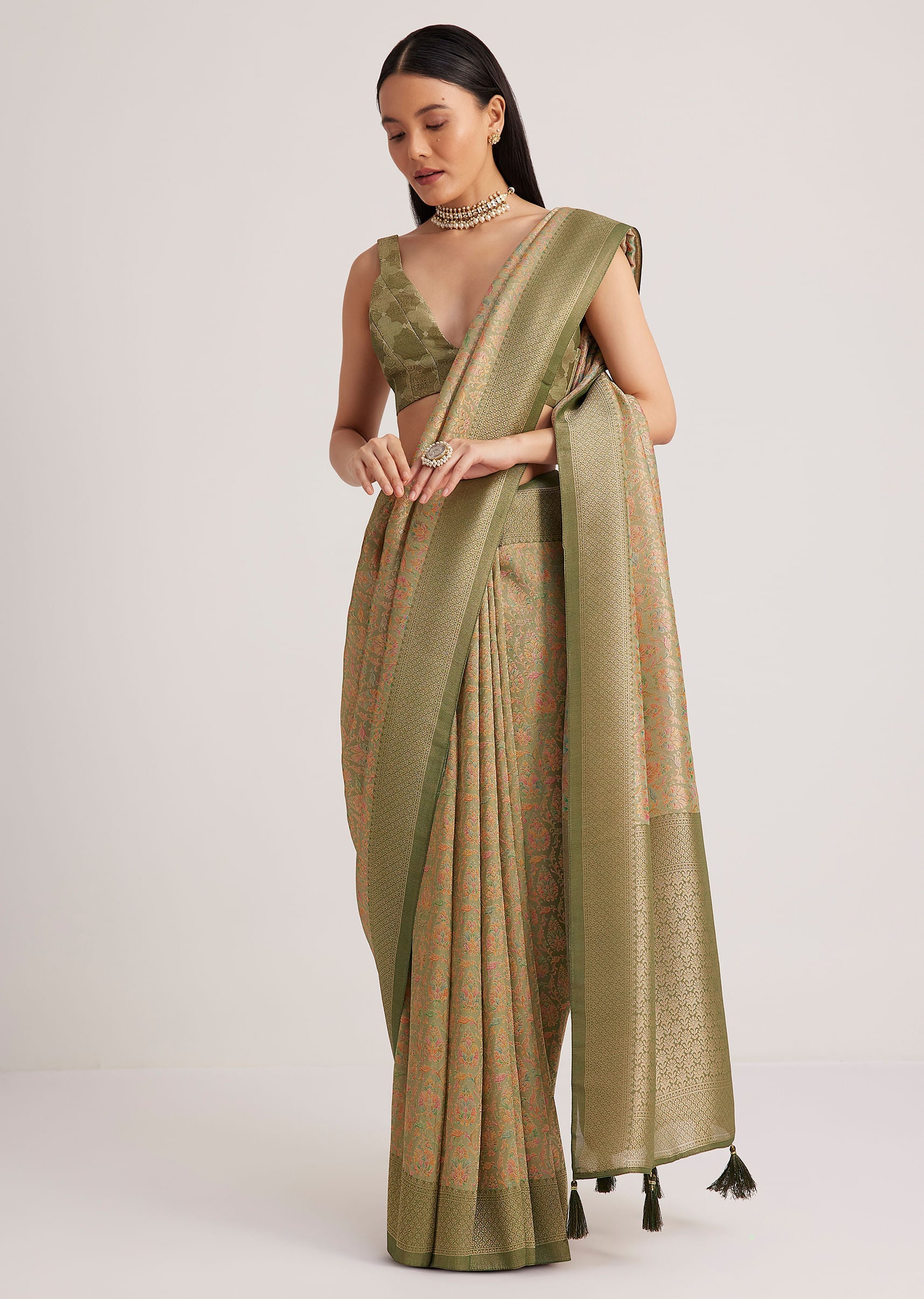 The dusky green saree pairs well with vintage-inspired jewelry and a soft, neutral makeup look. Let the fabric's elegance shine.
