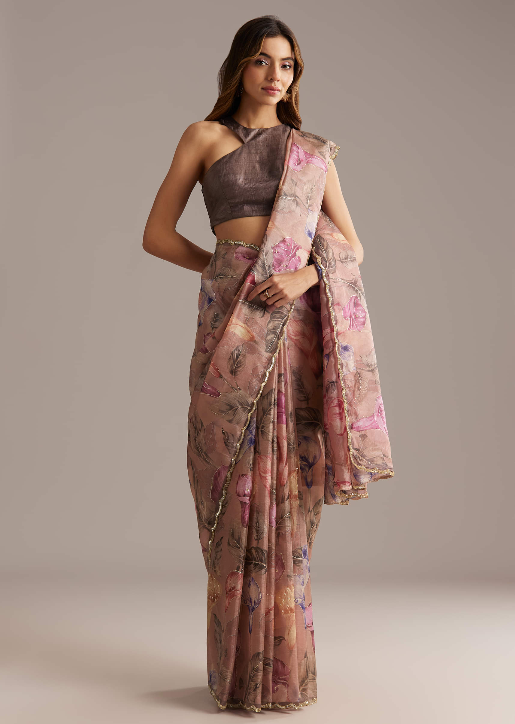 Dusky Peach Crush Tissue Saree With Floral Print And Zari Embroidery