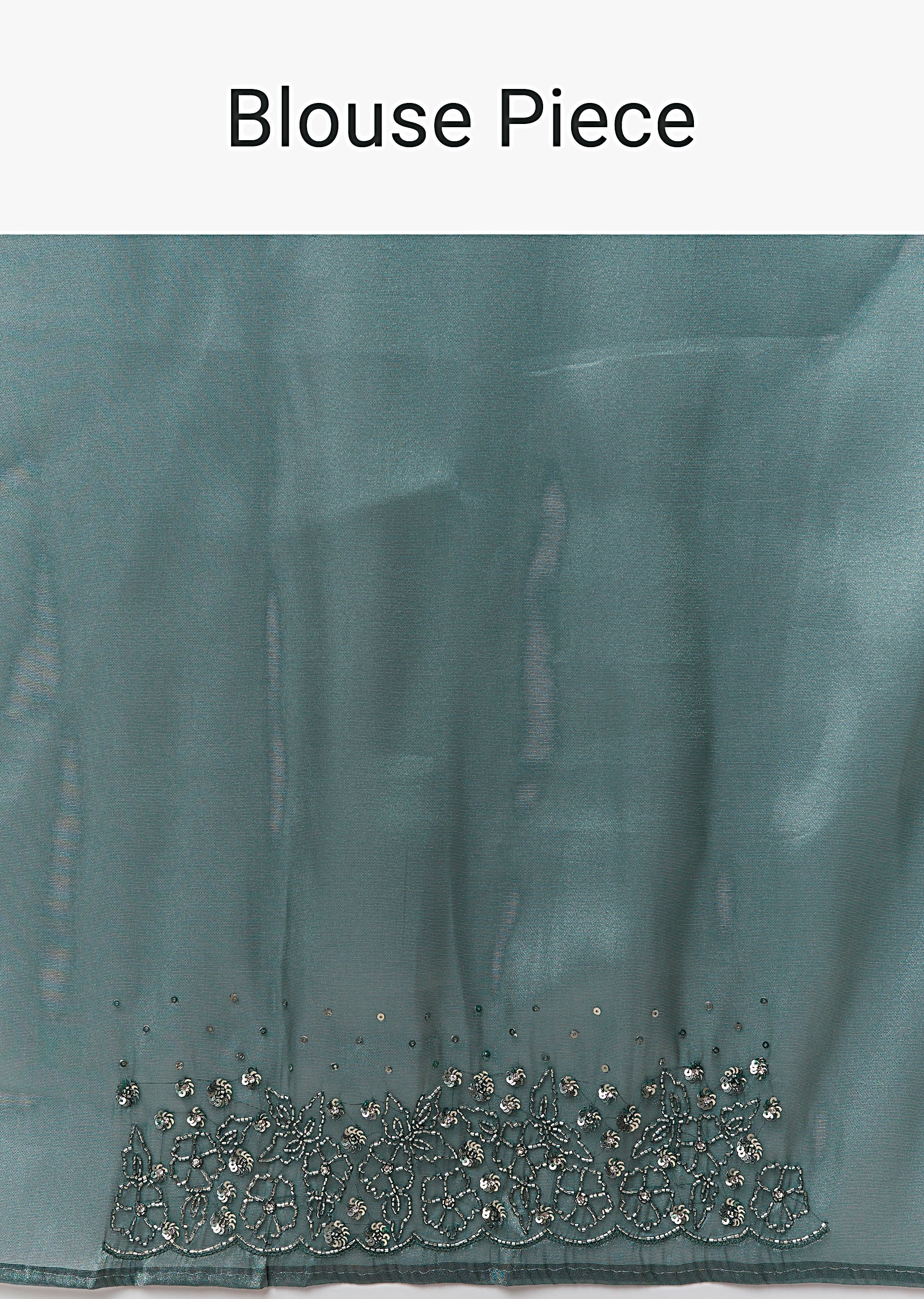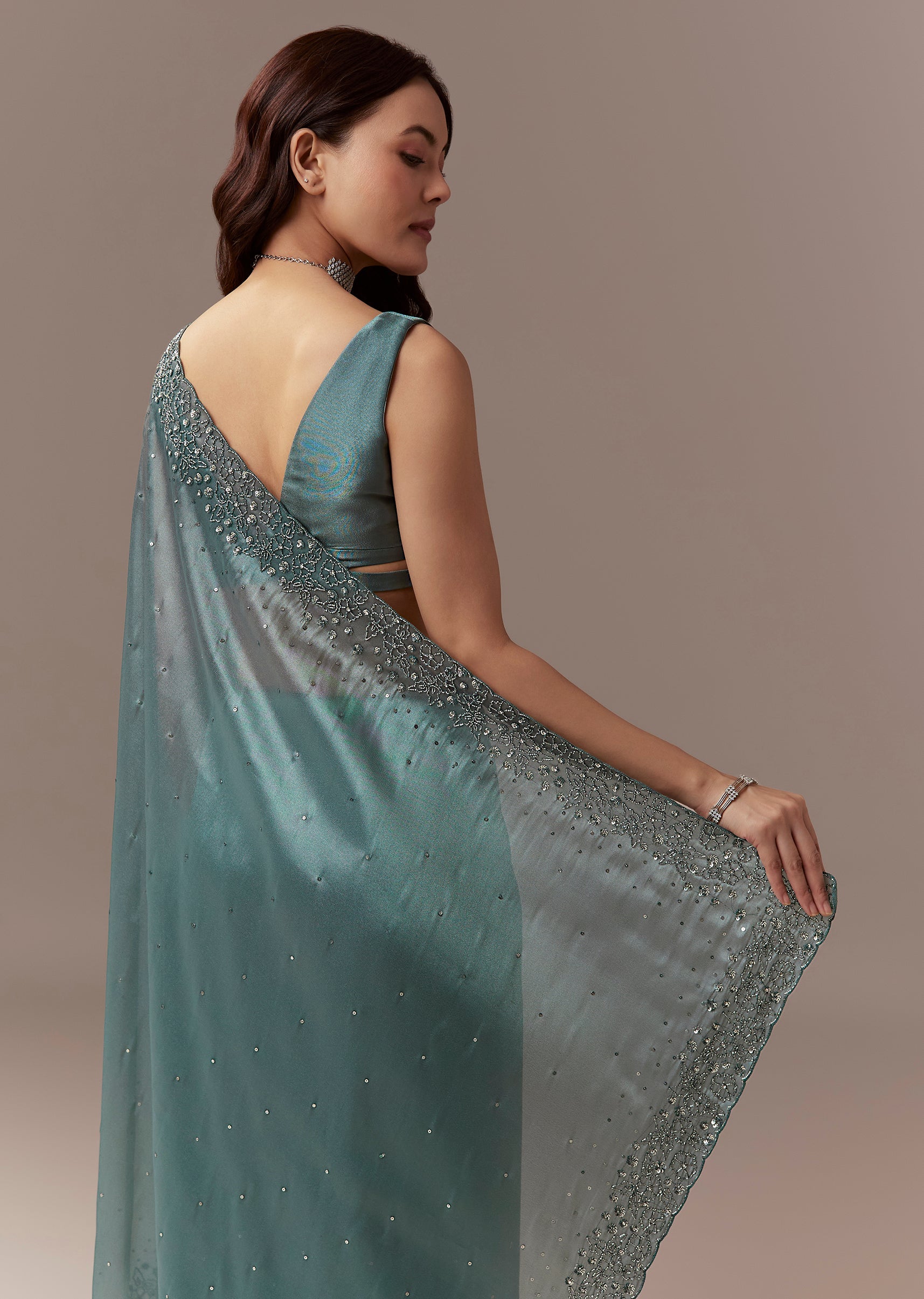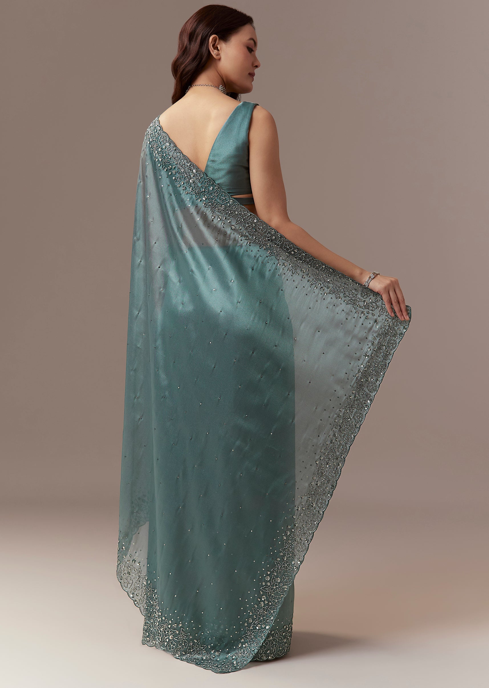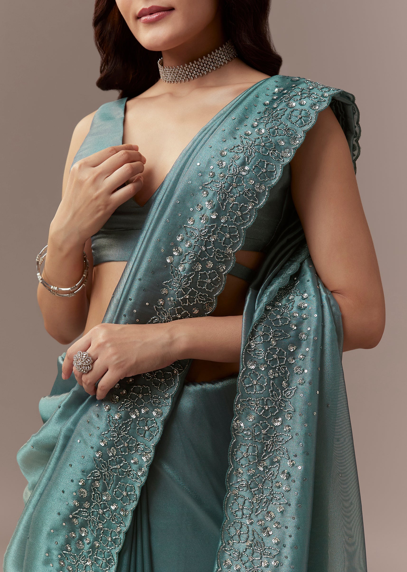 Dusky Teal Tissue Saree With Cutdana And Sequin Embroidery