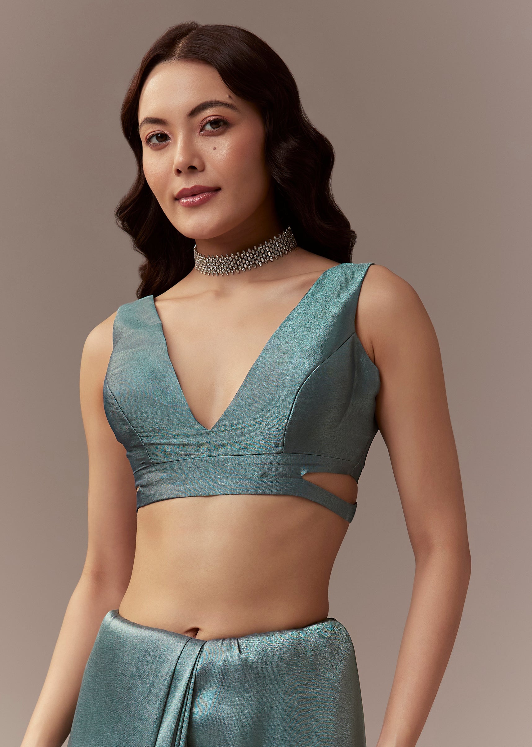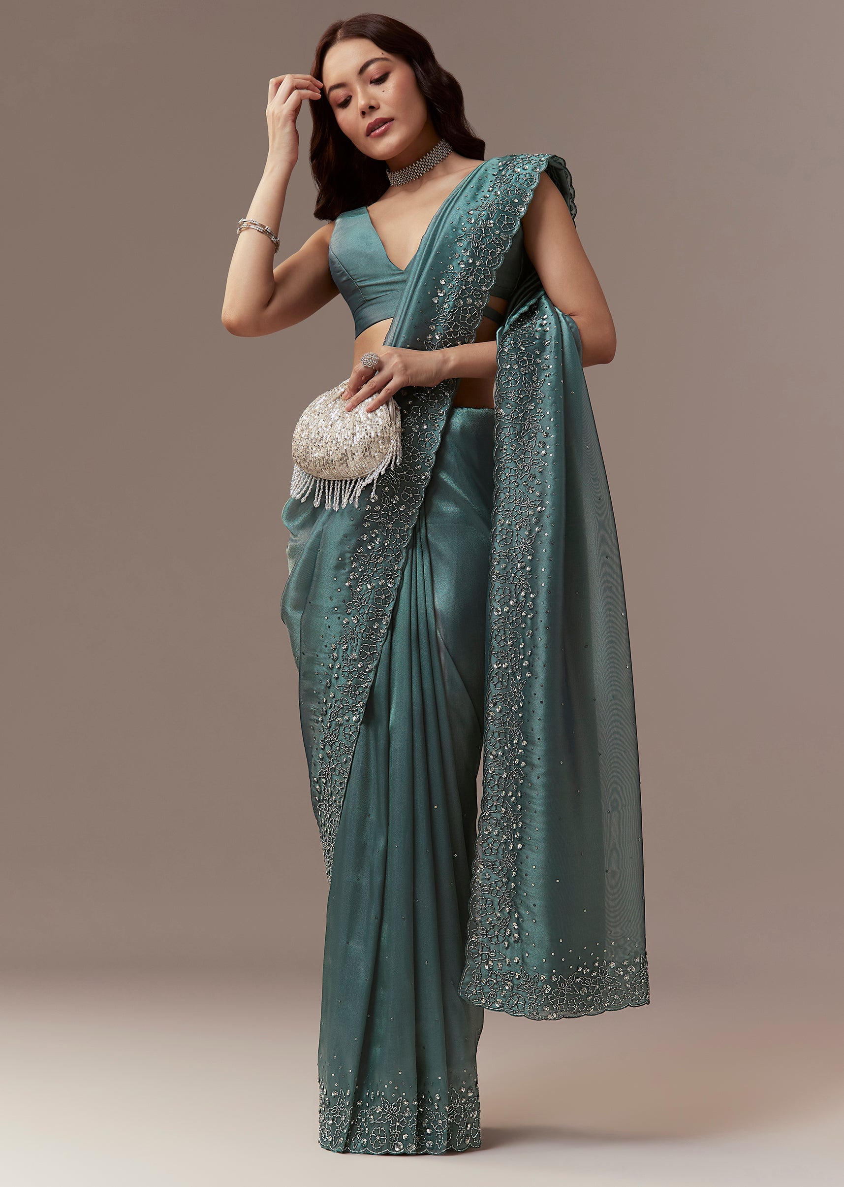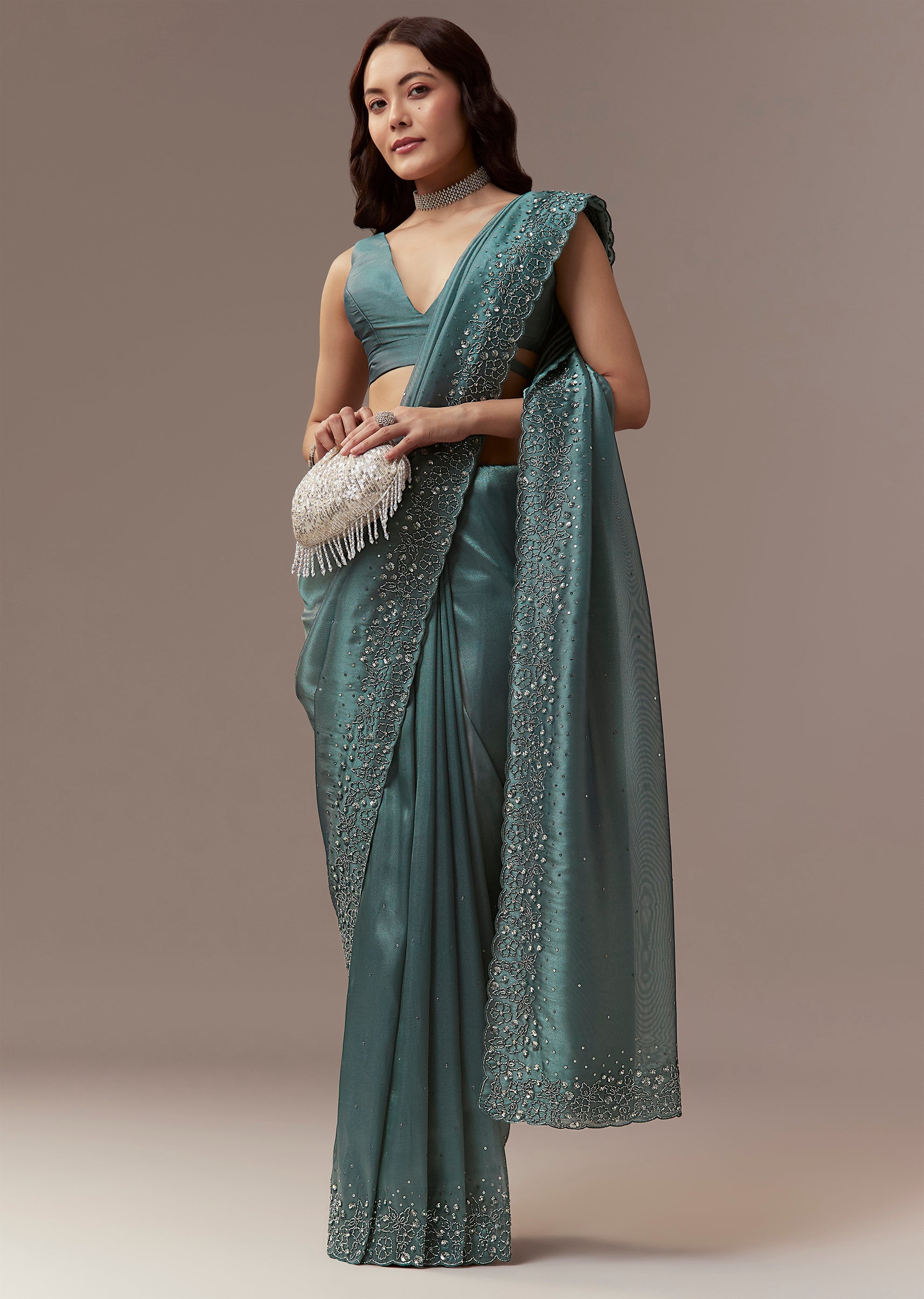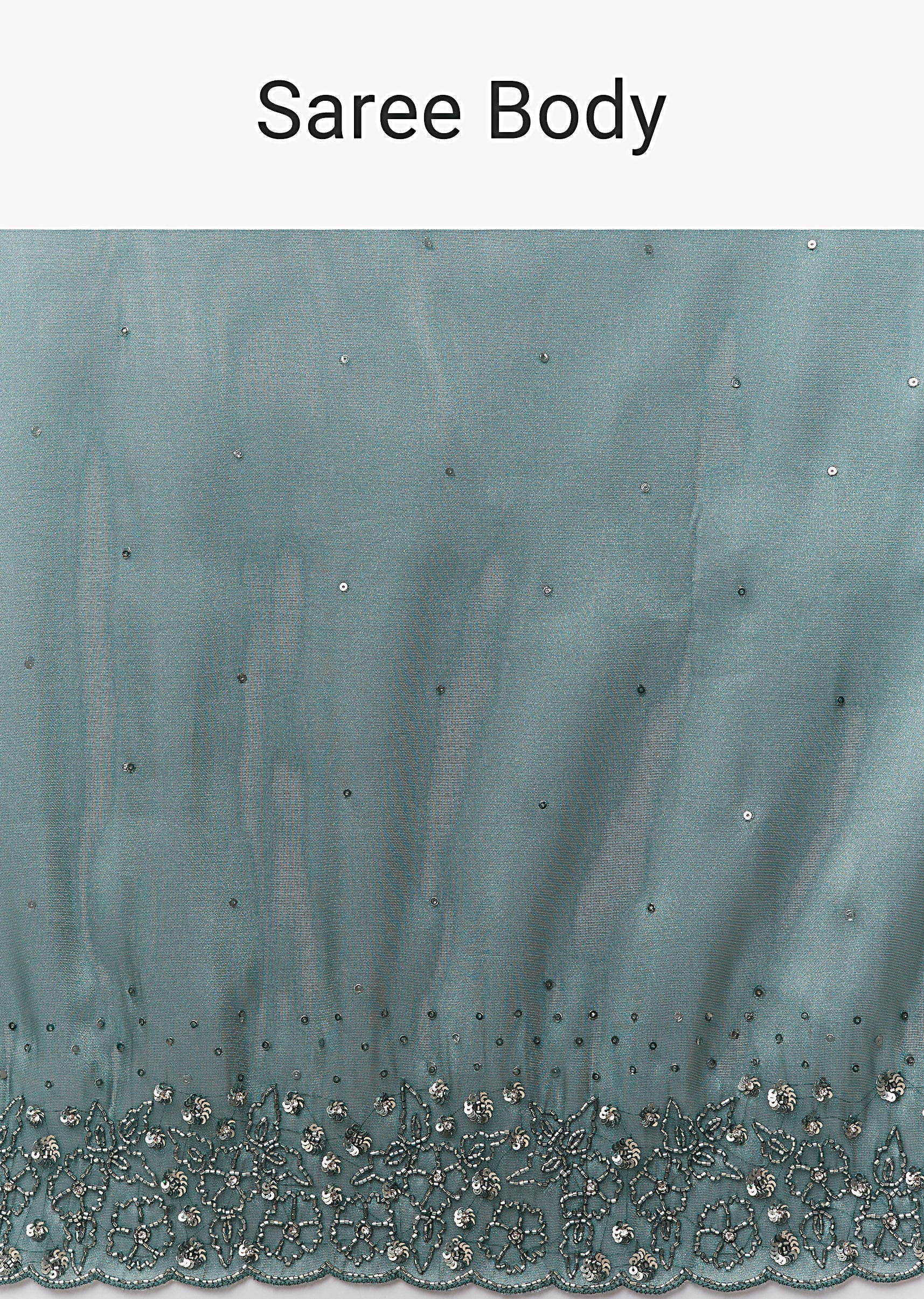 Dusky Teal Tissue Saree With Cutdana And Sequin Embroidery