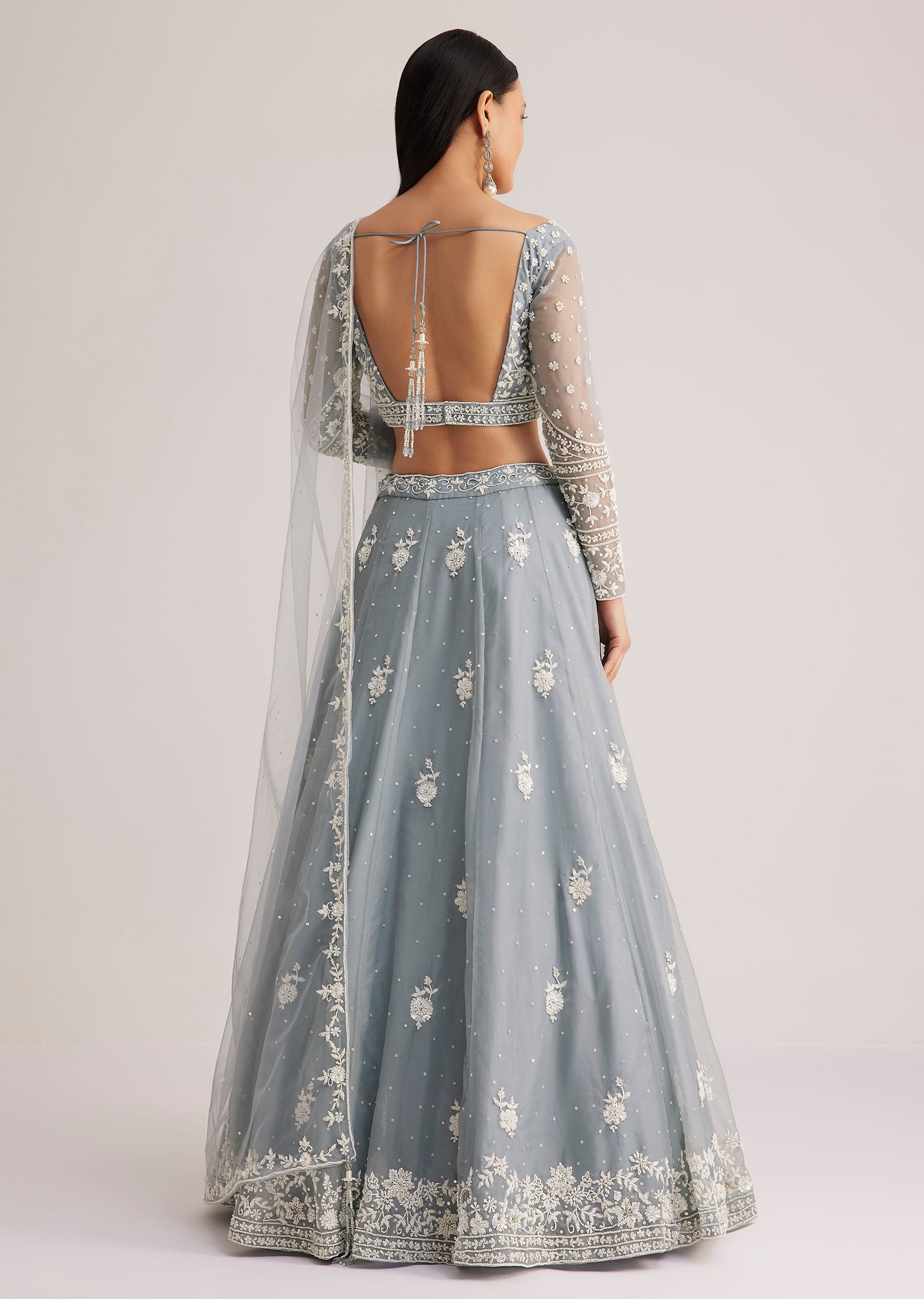 Radiate Timeless Charm With This Dusty Blue Lehenga Set Featuring Intricate White Floral Embroidery And Delicate Sequin Accents. Perfect For Wedding Receptions Engagement Ceremonies Or Festive Evening Celebrations This Ensemble Includes A Beautifully Detailed Blouse With Sheer Sleeves And A Flowy Lehenga Adorned With Exquisite Motifs. The Sheer Dupatta With An Ornate Border Completes The Look Adding A Graceful And Ethereal Vibe. Awarded as the Most Trusted Brand, we're delivering styles you love, just as promised.