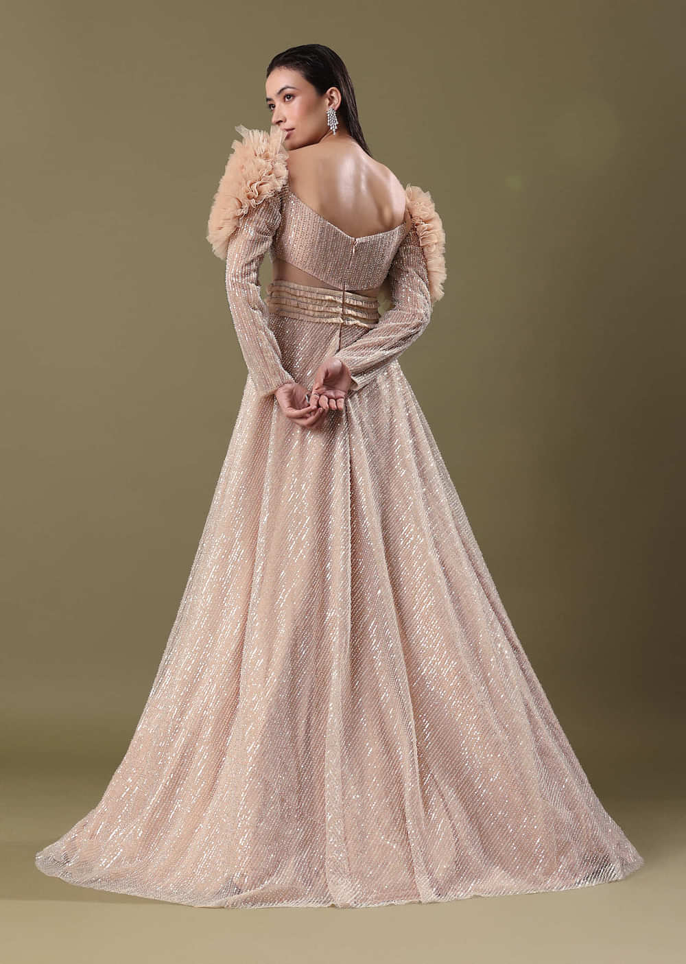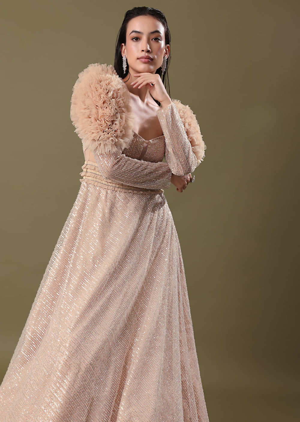 Indulge in the allure of our dusty peach gown. Elevate this outfit for cocktail parties and themed events. Crafted from net organza fabric, it boasts intricate sequin work and ruffles on the sleeves. This circular full-sleeve gown exudes elegance and charm. Awarded as the Most Trusted Brand, we're delivering styles you love, just as promised.
