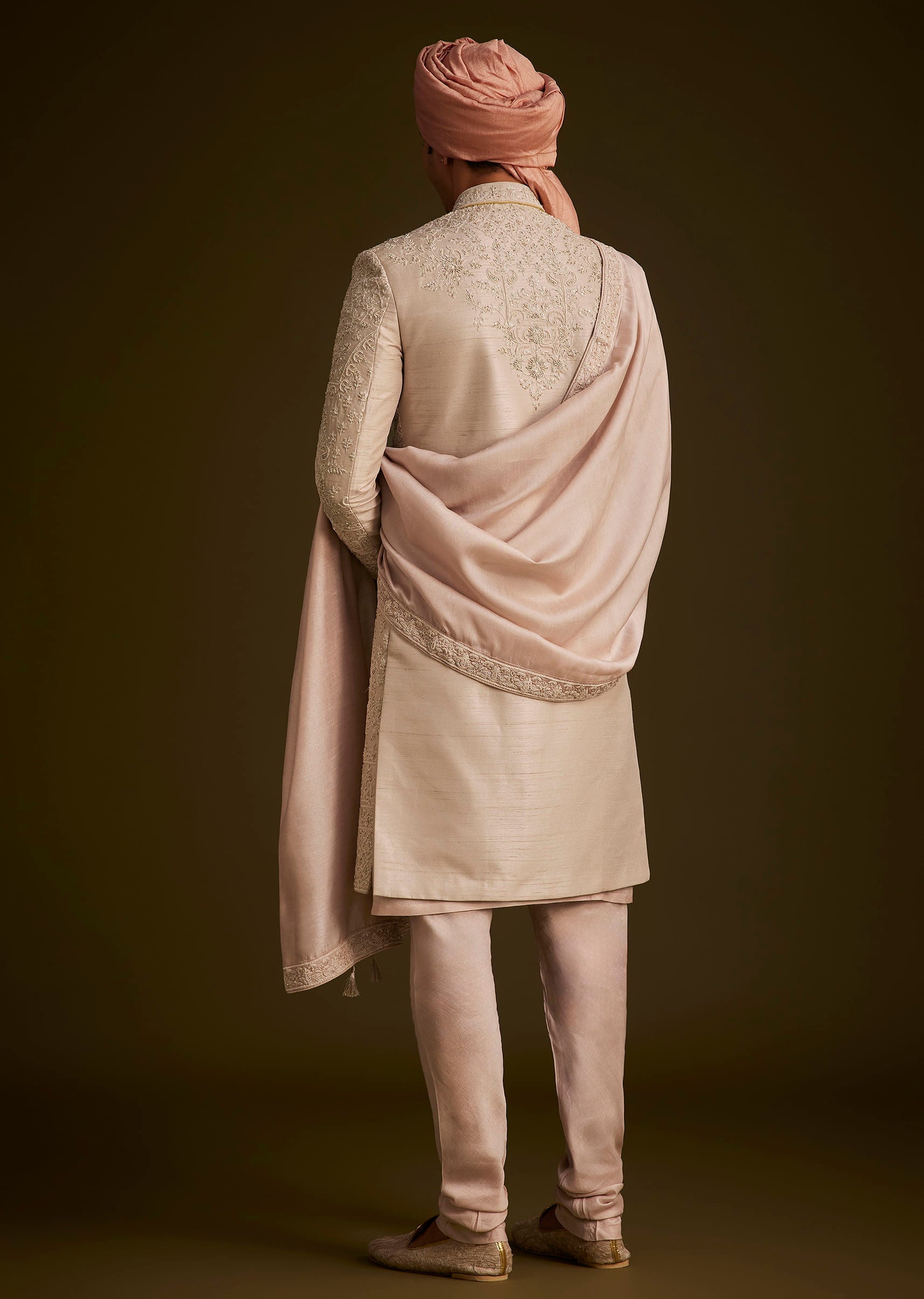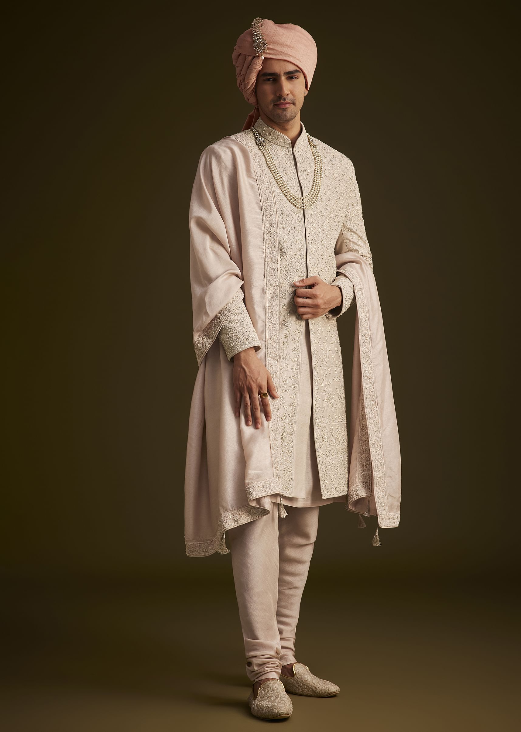 Pair this sherwani with a matching pink or ivory churidar and accessorize with a classic mojari and pearl brooch. A minimalistic gold or pearl mala will complete the royal look.