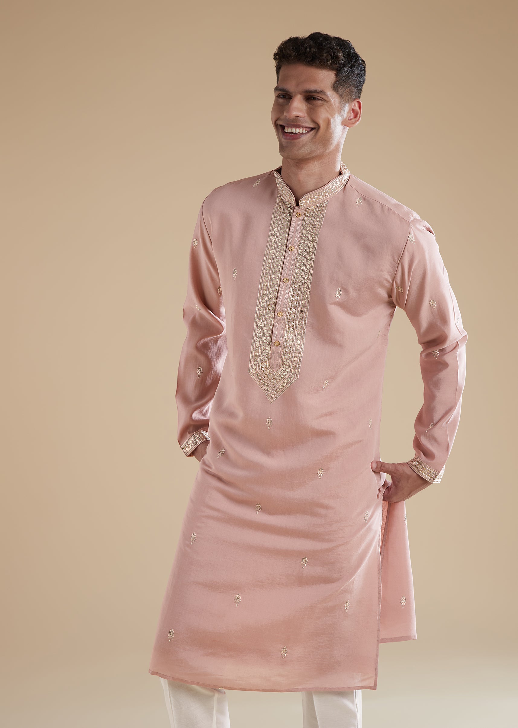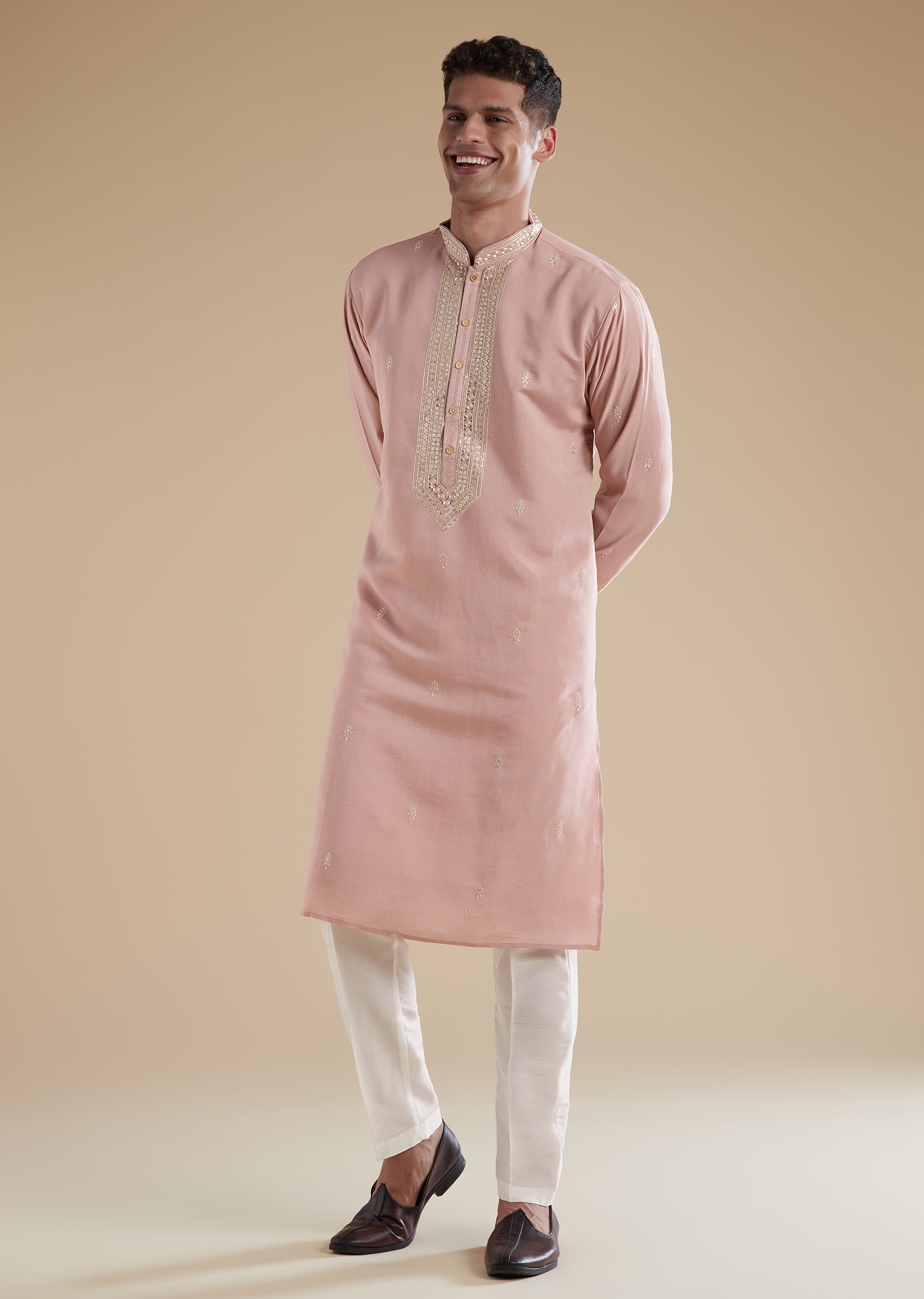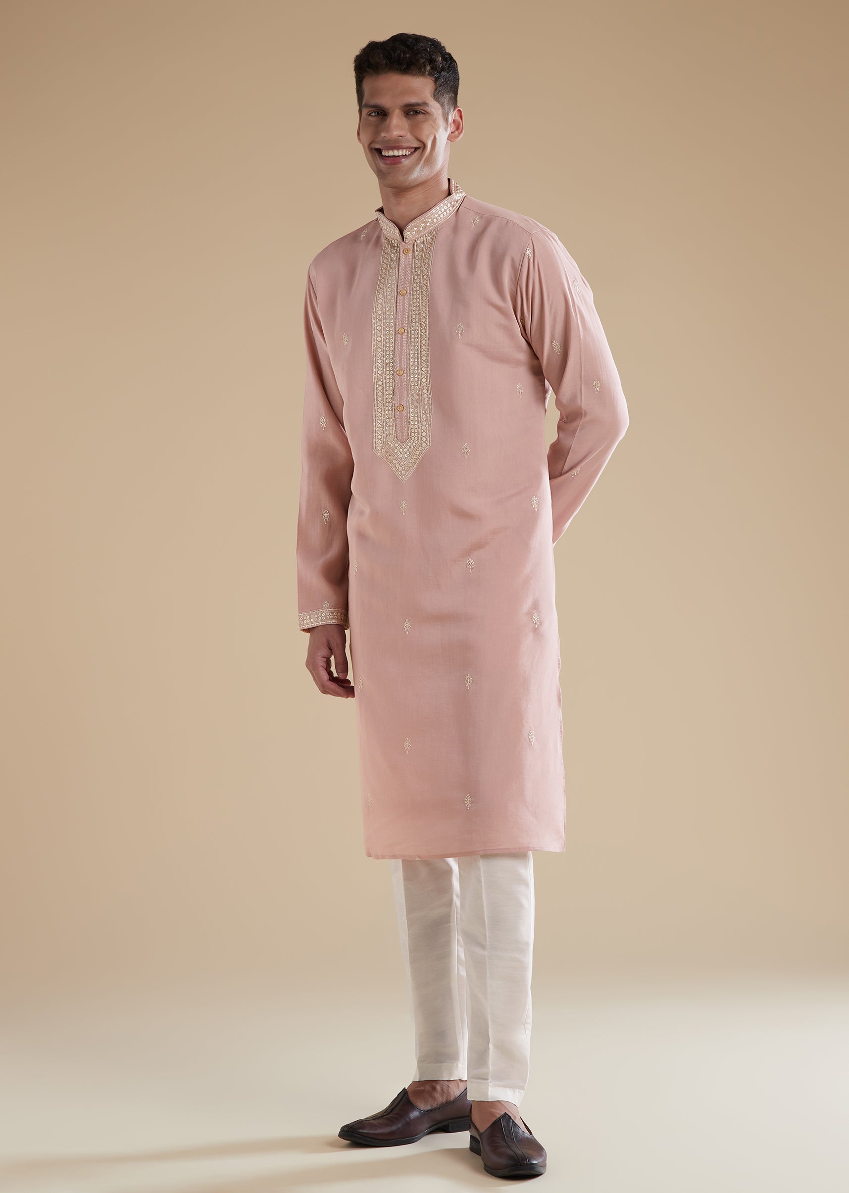 This dusty pink mens kurta set is crafted in luxurious silk with art silk as the secondary fabric, giving it a soft sheen and a refined pastel appeal. The kurta... More Product Details