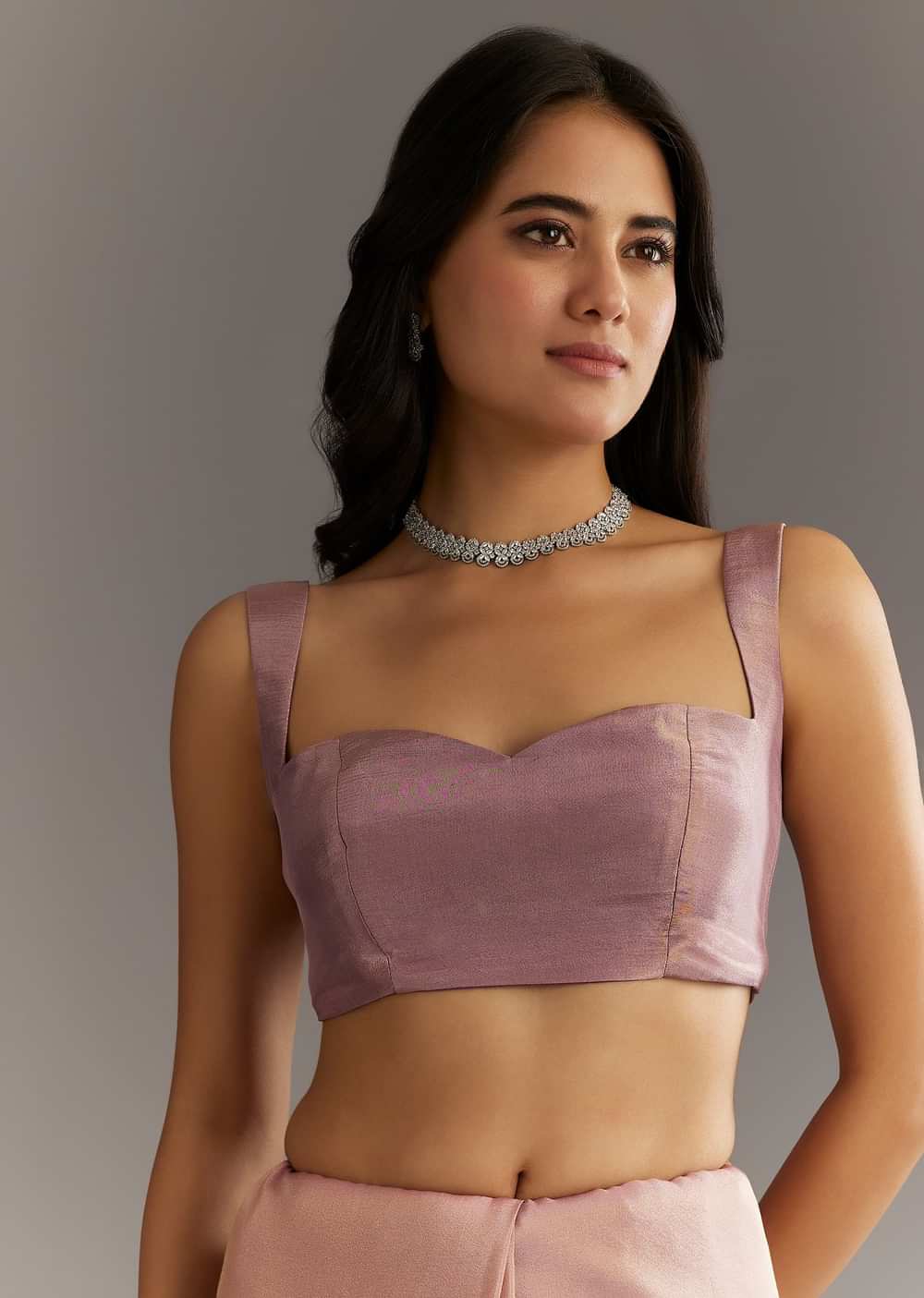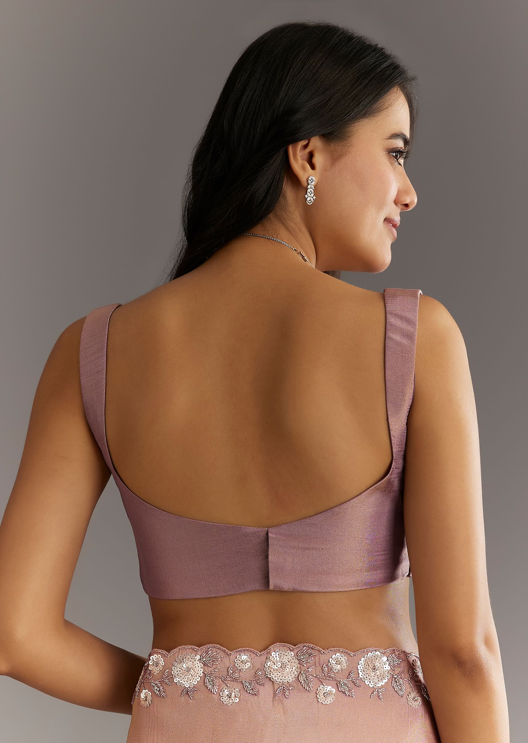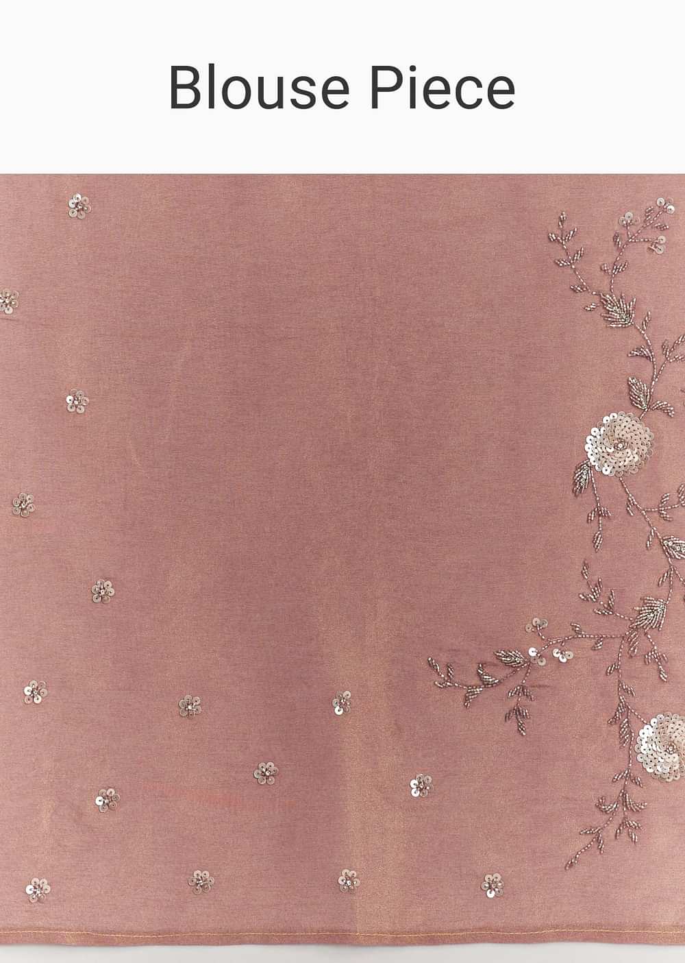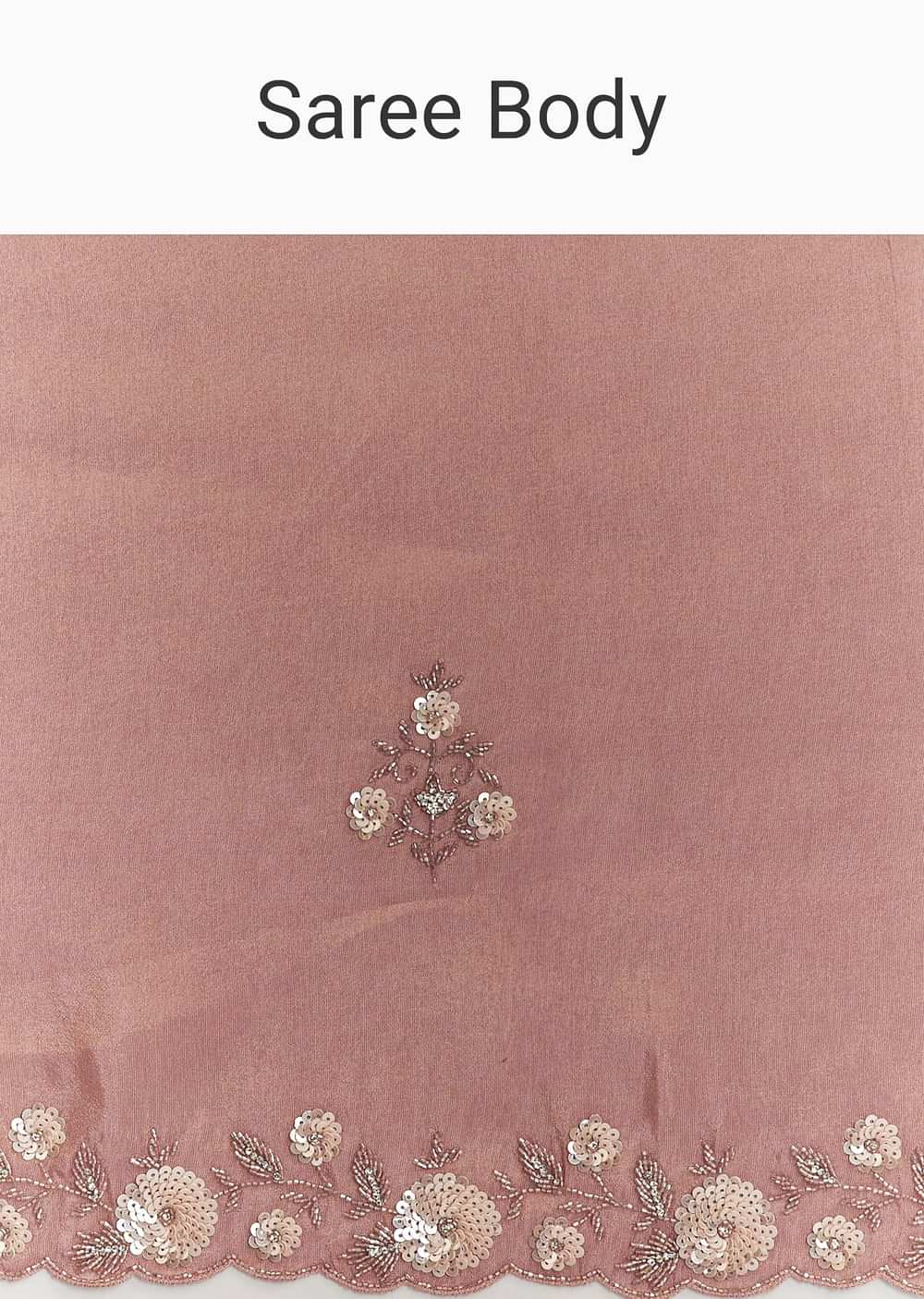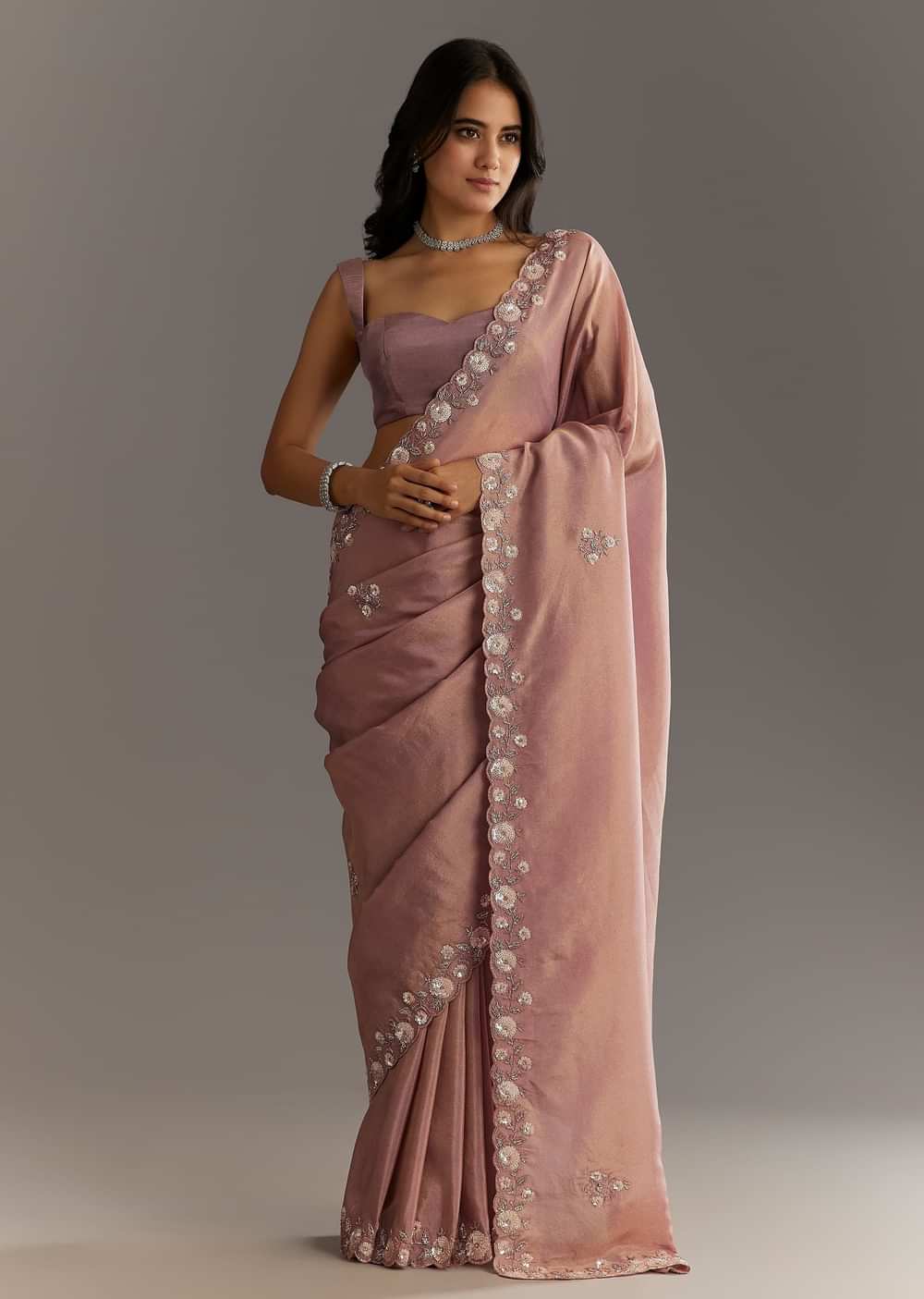 Dusty Rose Tissue Saree With Floral Embroidered Scallop Border