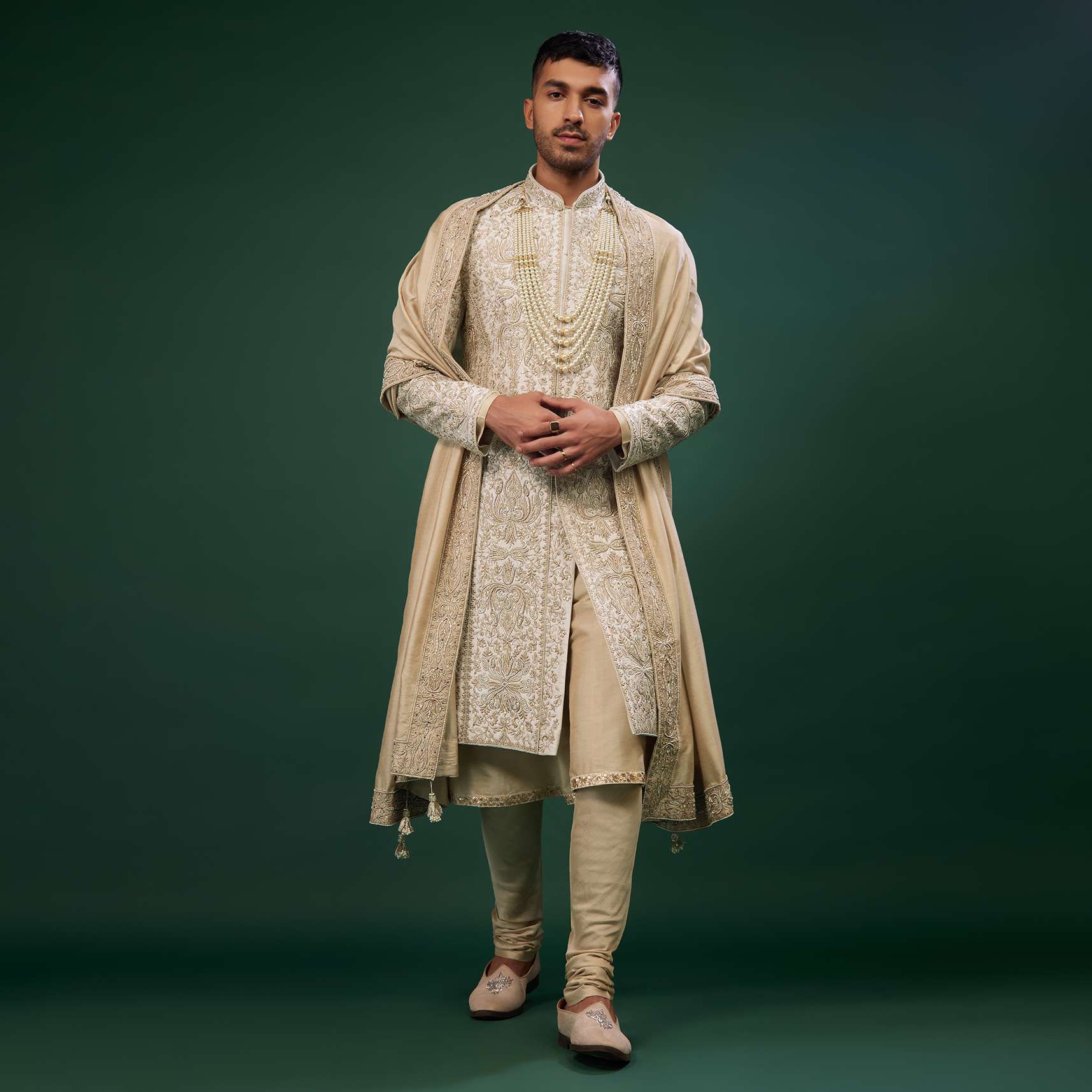 An elegant egret white sherwani set fabricated in raw silk.The sherwani is crafted in beads, cut dana, and thread embroidery, has full sleeves and a mandarin collar with a front closure.It comes with a beige inner kurta, stole, matching churidar, and a multilayered pearl mala.Buttons and Accessories may vary in color, shape and size. Awarded as the Most Trusted Brand, we're delivering styles you love, just as promised.