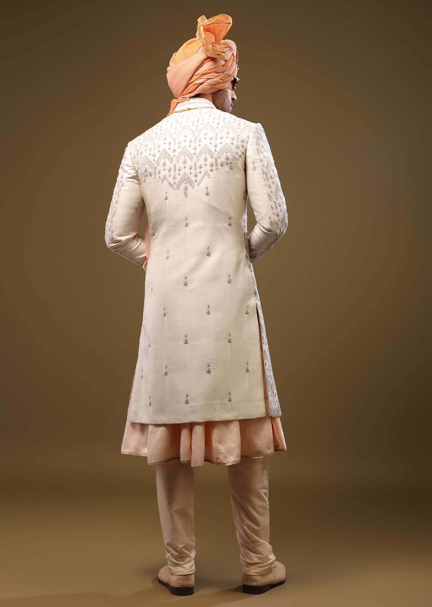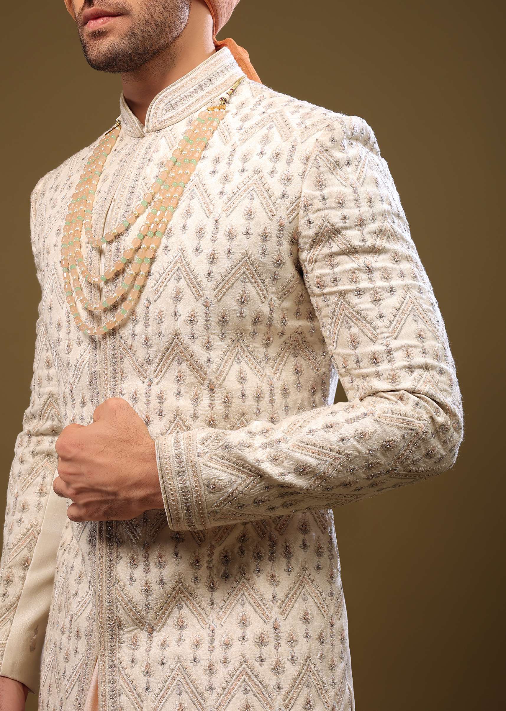 An elegant egret white sherwani set fabricated in silk, and is crafted in zardozi, beads, stones, and zari embroidery.It has a full sleeves and a mandarin collar with a front... More Product Details