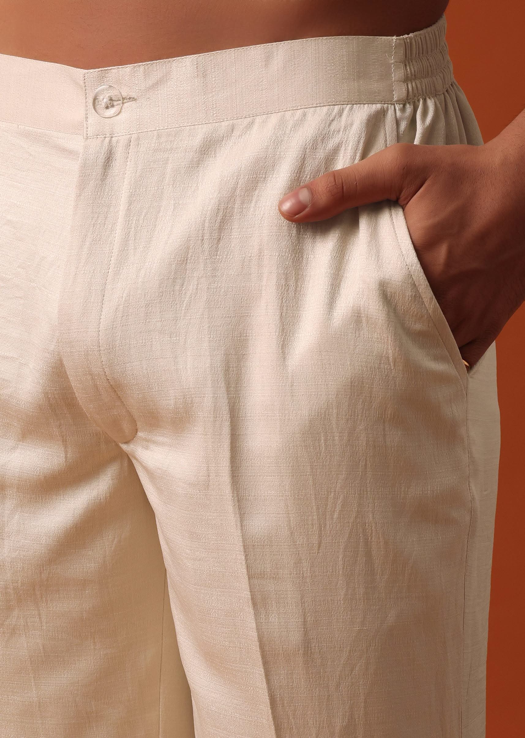 Elevate your festive attire with our Beige Silk Blend Jacket Kurta Set. It features intricate selfwork embroidery on the jacket. This ensemble including a jacket kurta and bottom is an ideal choice for any celebration. The delicate selfwork on the jacket adds a touch of timeless charm to your festive look. Awarded as the Most Trusted Brand, we're delivering styles you love, just as promised.
