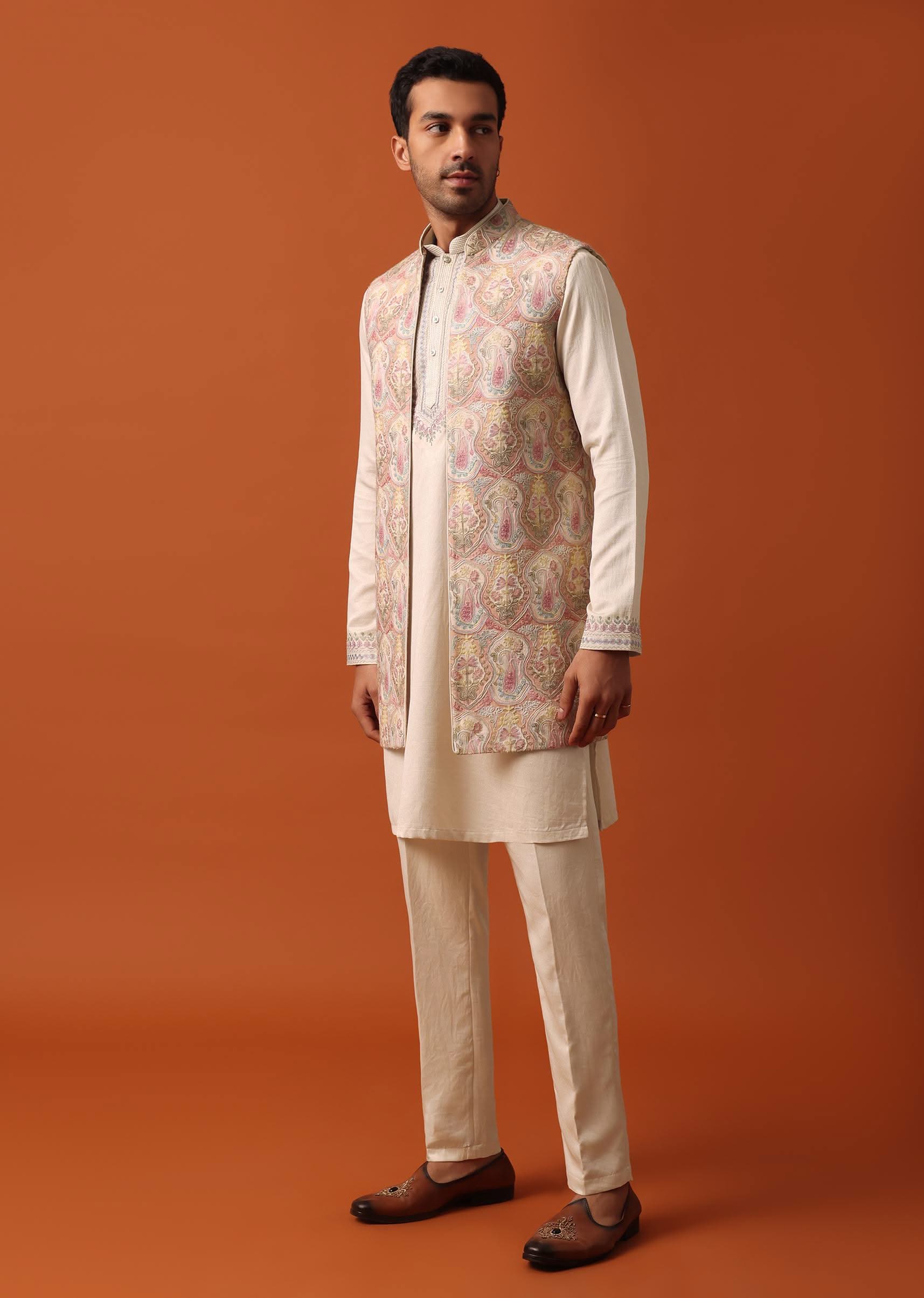 Elevate your festive attire with our Beige Silk Blend Jacket Kurta Set. It features intricate selfwork embroidery on the jacket. This ensemble including a jacket kurta and bottom is an... More Product Details