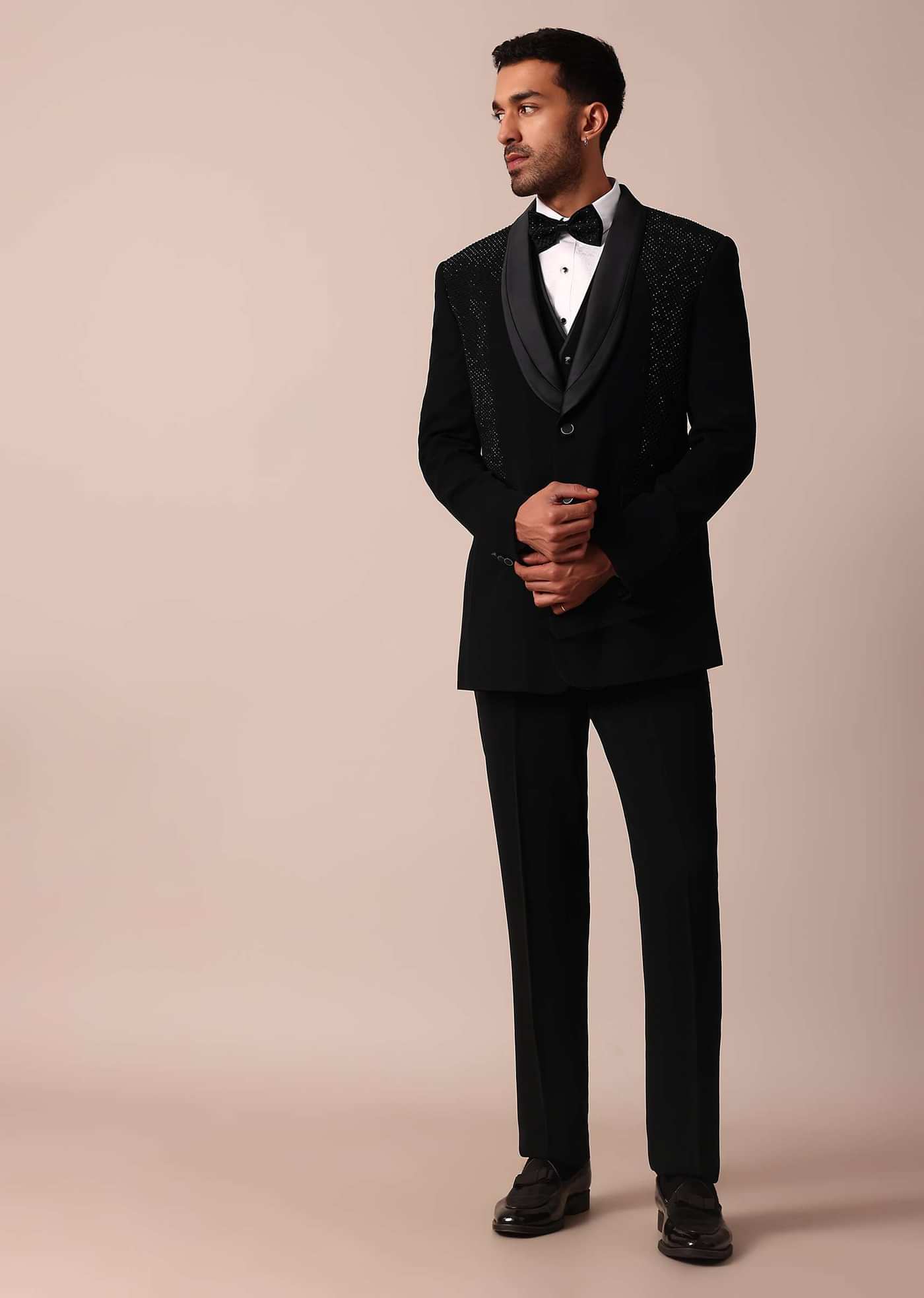 Make a statement at weddings or receptions in our Elegant Black Polyester Tuxedo. It features intricate embroidery on the blazer for a touch of sophistication. This ensemble offers a timeless... More Product Details