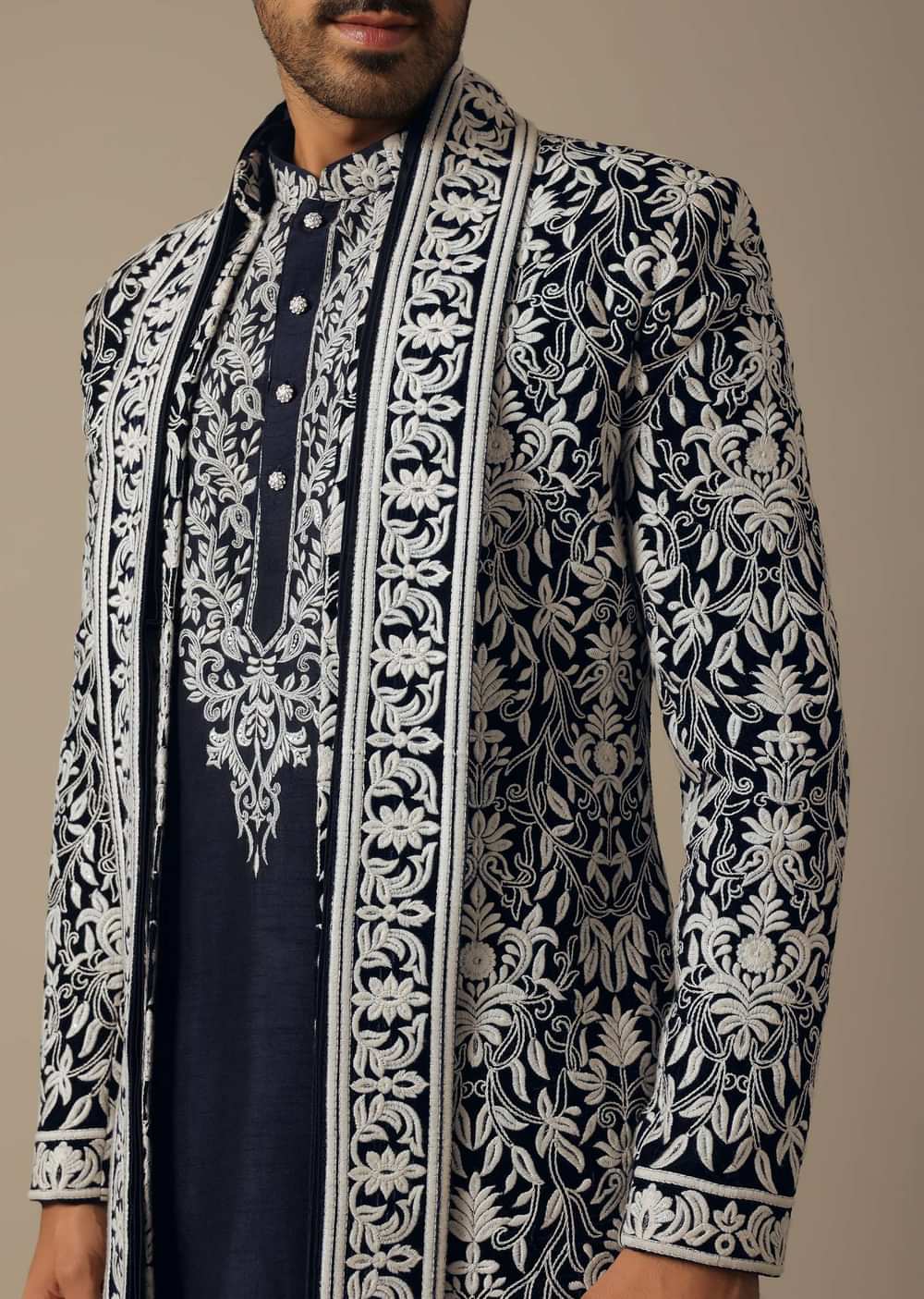 Pair this regal ensemble with minimal accessories to let the detailed embroidery shine, and consider a classic watch for a touch of sophistication.Fit Tips:For a tailored fit, ensure the mandarin collar sits comfortably, allowing you to exude confidence and charm throughout the festivities.