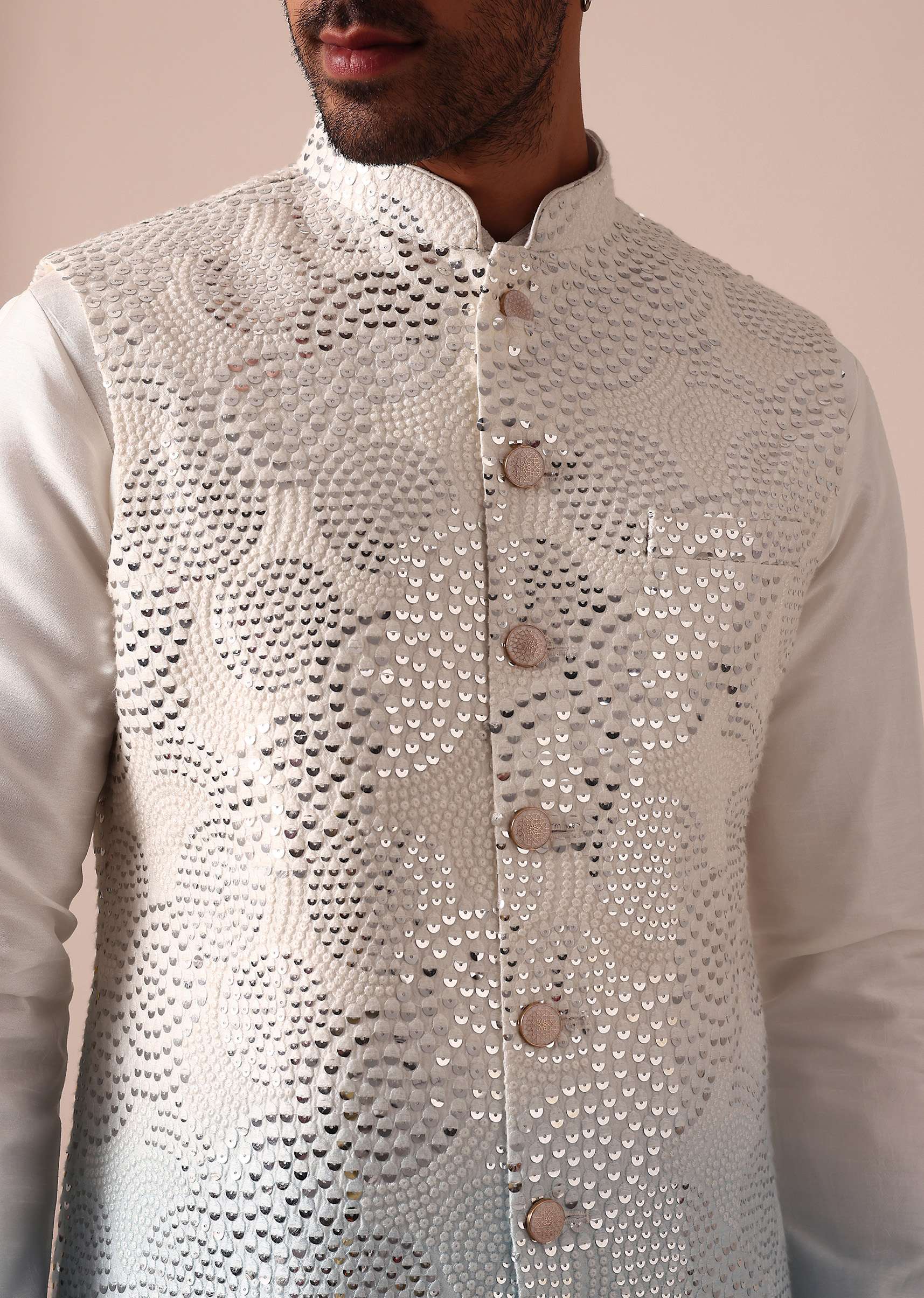 Illuminate any Sangeet night with our Radiant Blue Silk Jacket Kurta Set. It is adorned with sequins embroidery all over and a captivating ombre pattern. This set includes one jacket,... More Product Details