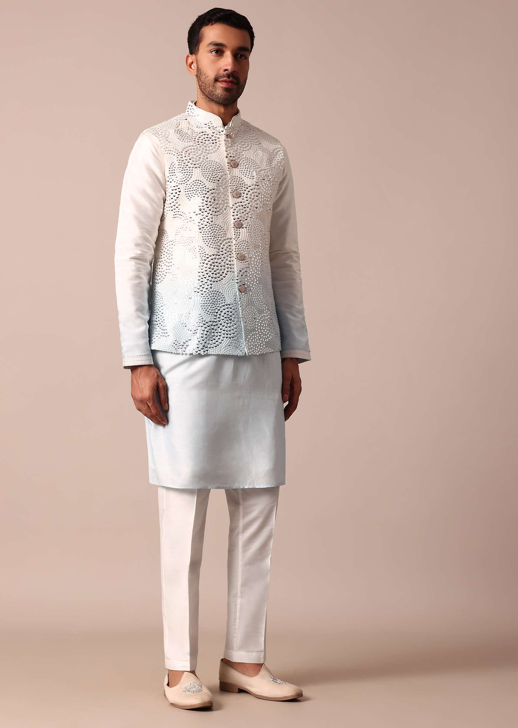 Elegant Blue Ombre Silk Jacket Kurta Set For Men