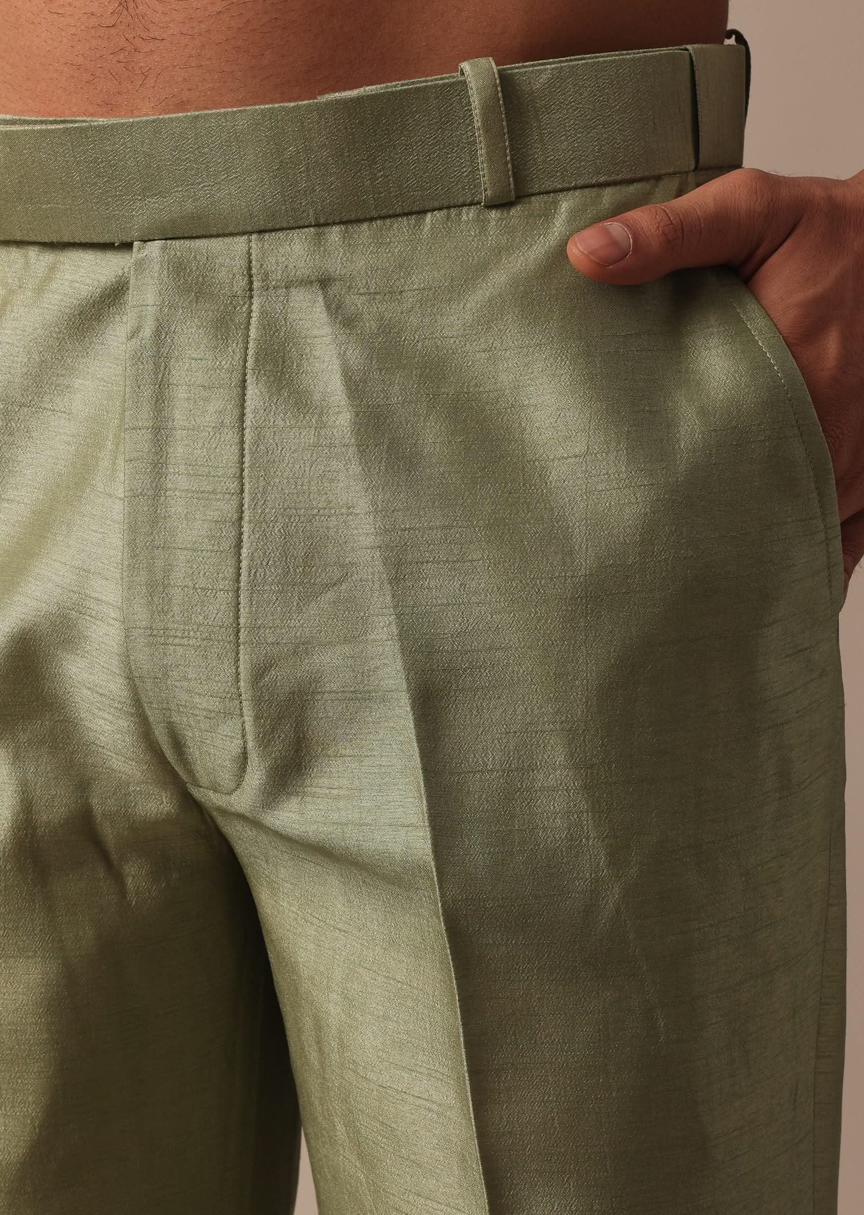 Elevate your Sangeet look with our Elegant Green Silk Indowestern Set. It features striking self work. Also it showcases intricate cutdana embroidery and zari work on the collar. This ensemble including an Indowestern kurta and bottom ensures a perfect blend of tradition and contemporary style. Awarded as the Most Trusted Brand, we're delivering styles you love, just as promised.