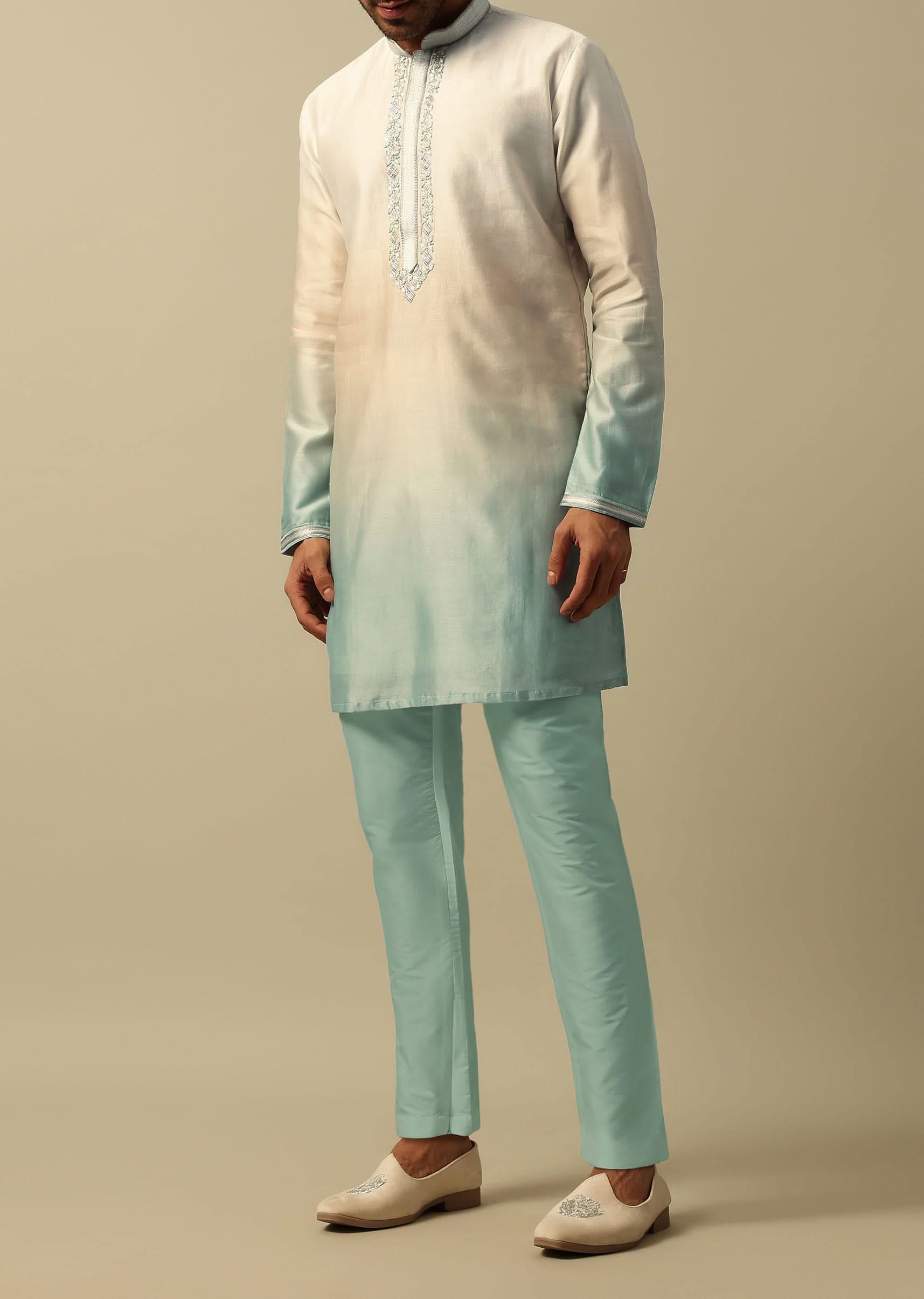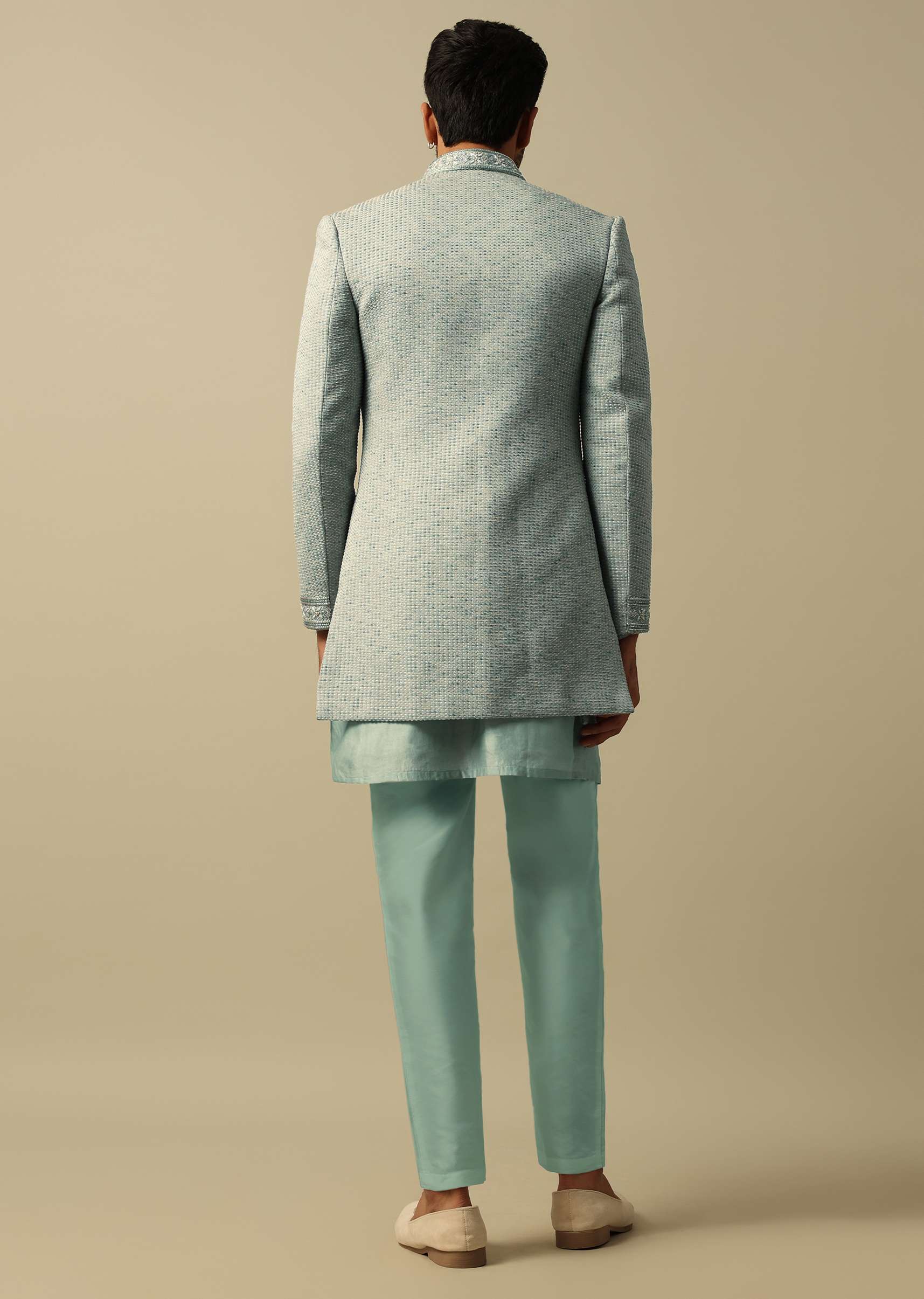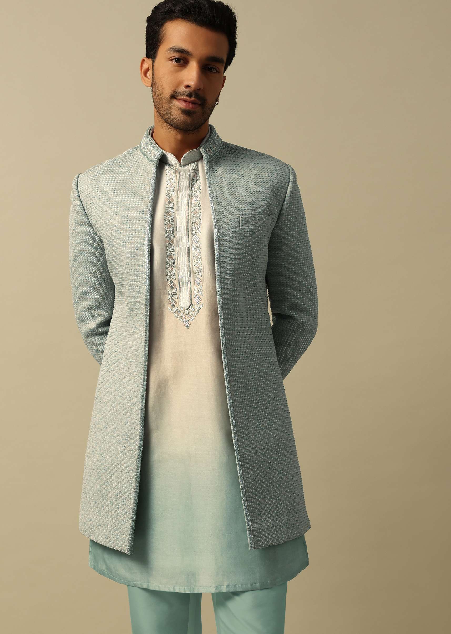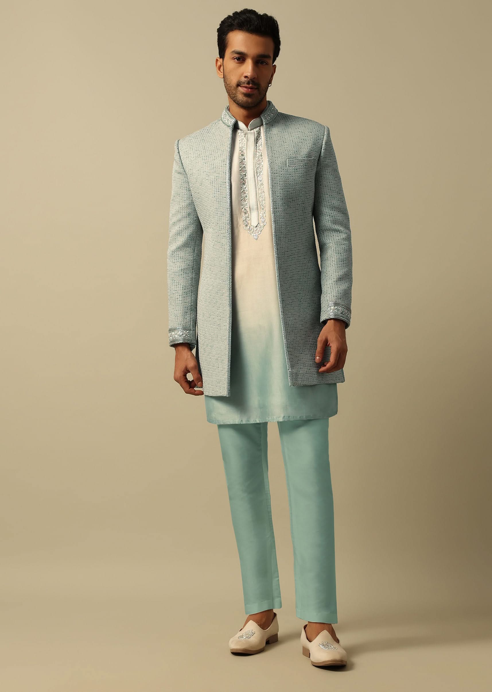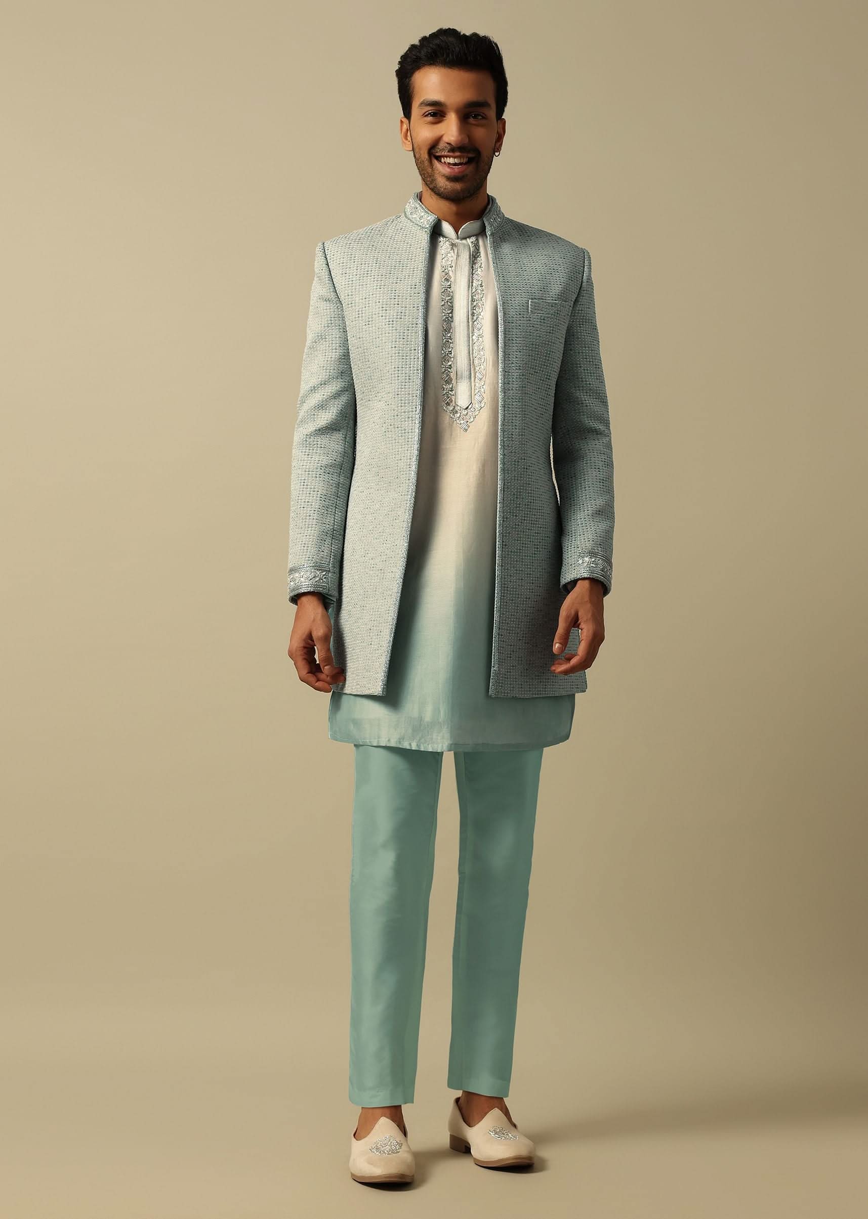 Make a stylish statement at your reception in our Elegant Green Ombre Indowestern. The kurta features exquisite embroidery on the yoke, enhancing its sophistication. Crafted from premium Jacquard fabric, the... More Product Details