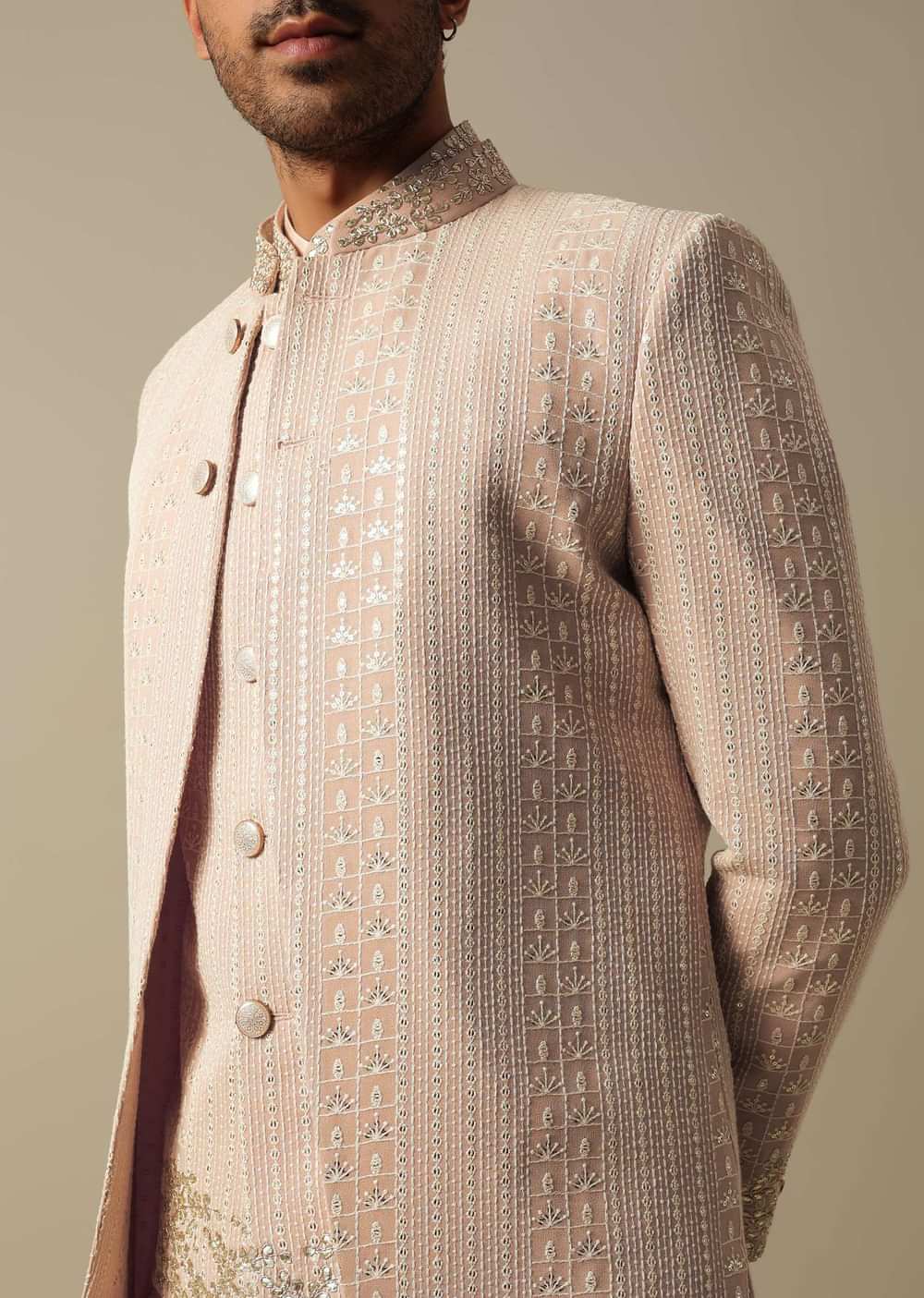 Make a statement at weddings and receptions with our sophisticated Indowestern ensemble for men. This set in enchanting peach georgette features meticulous embroidery detailing on the neckline and sleeves This set is adorned with threadwork and sequins. The pack includes a sherwani jacket kurta and pant for a complete outfit. Awarded as the Most Trusted Brand, we're delivering styles you love, just as promised.