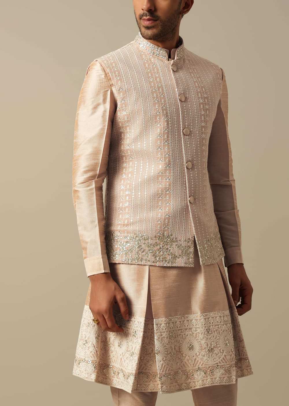 Make a statement at weddings and receptions with our sophisticated Indowestern ensemble for men. This set in enchanting peach georgette features meticulous embroidery detailing on the neckline and sleeves This... More Product Details
