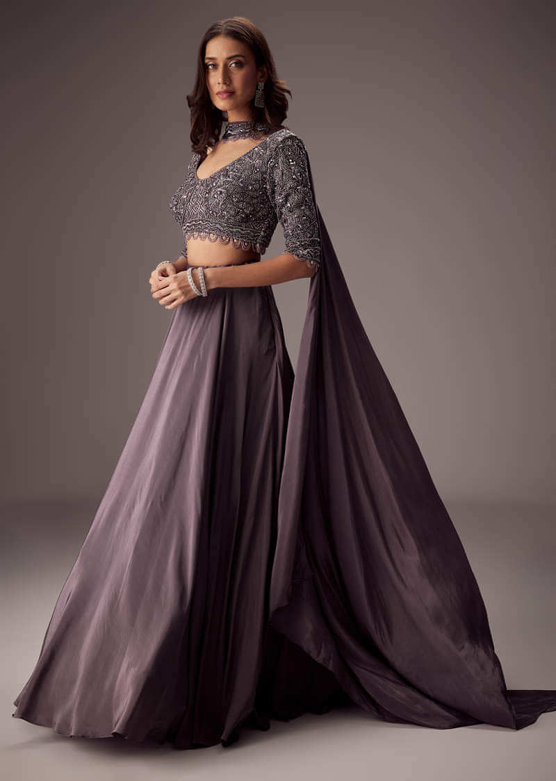 In pastel-toned satin and satin organza, this lehenga features a V-neckline blouse and a voluminous double circular skirt. The choker-style dupatta brings a modern edge to the overall festive look,... More Product Details