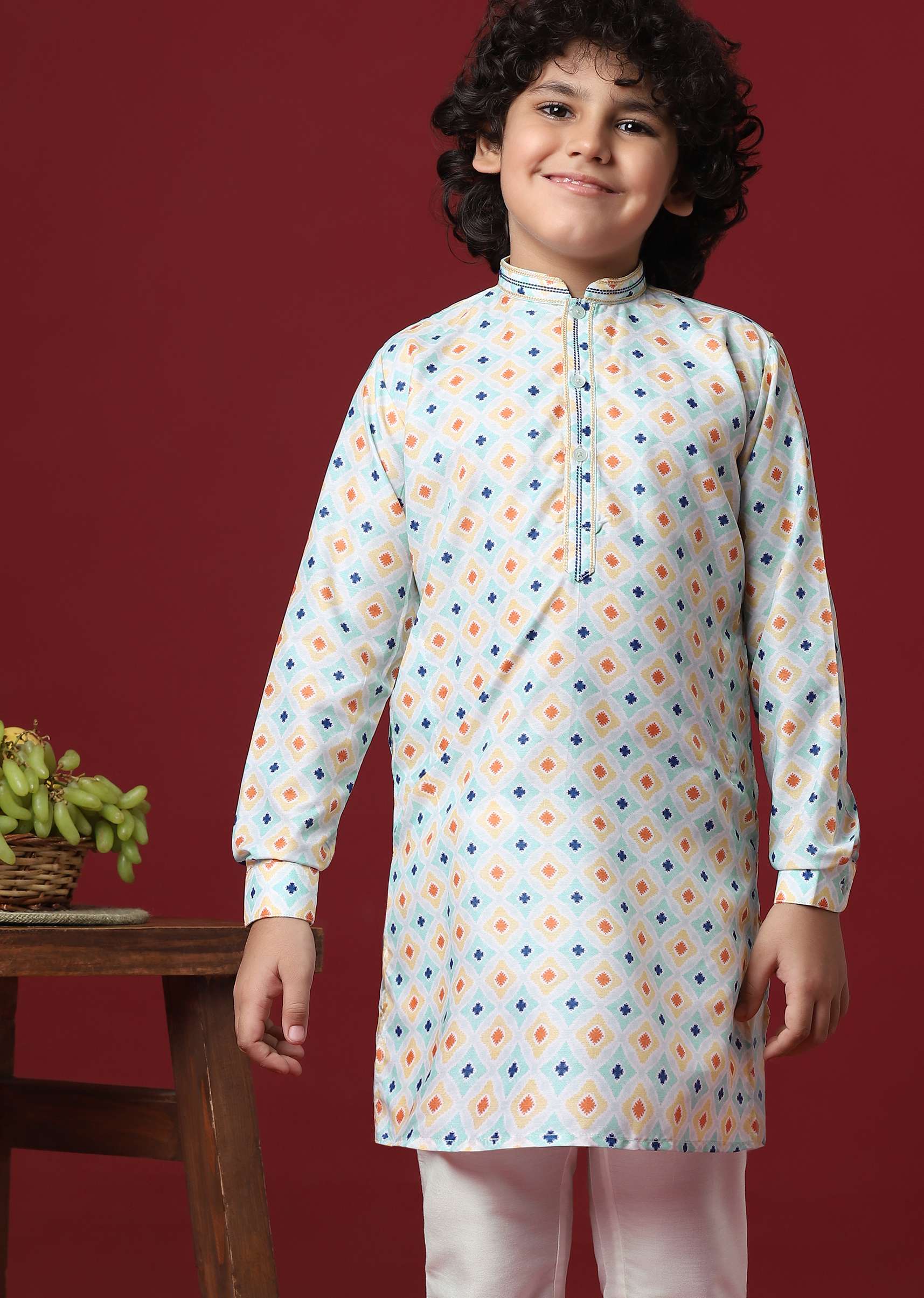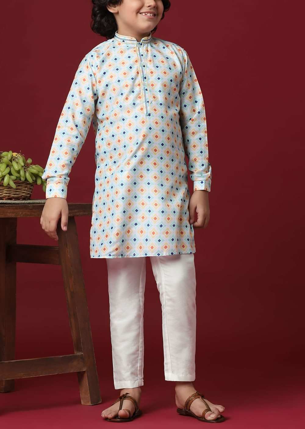 Embrace sophistication with our Elegant White Silk Kurta Set featuring a subtle print. The full-sleeved Kurta, adorned with a Mandarin Collar, pairs seamlessly with comfortable pants. This outfit is crafted from luxurious silk. It combines comfort and style for your little one's special celebrations. Awarded as the Most Trusted Brand, we're delivering styles you love, just as promised.