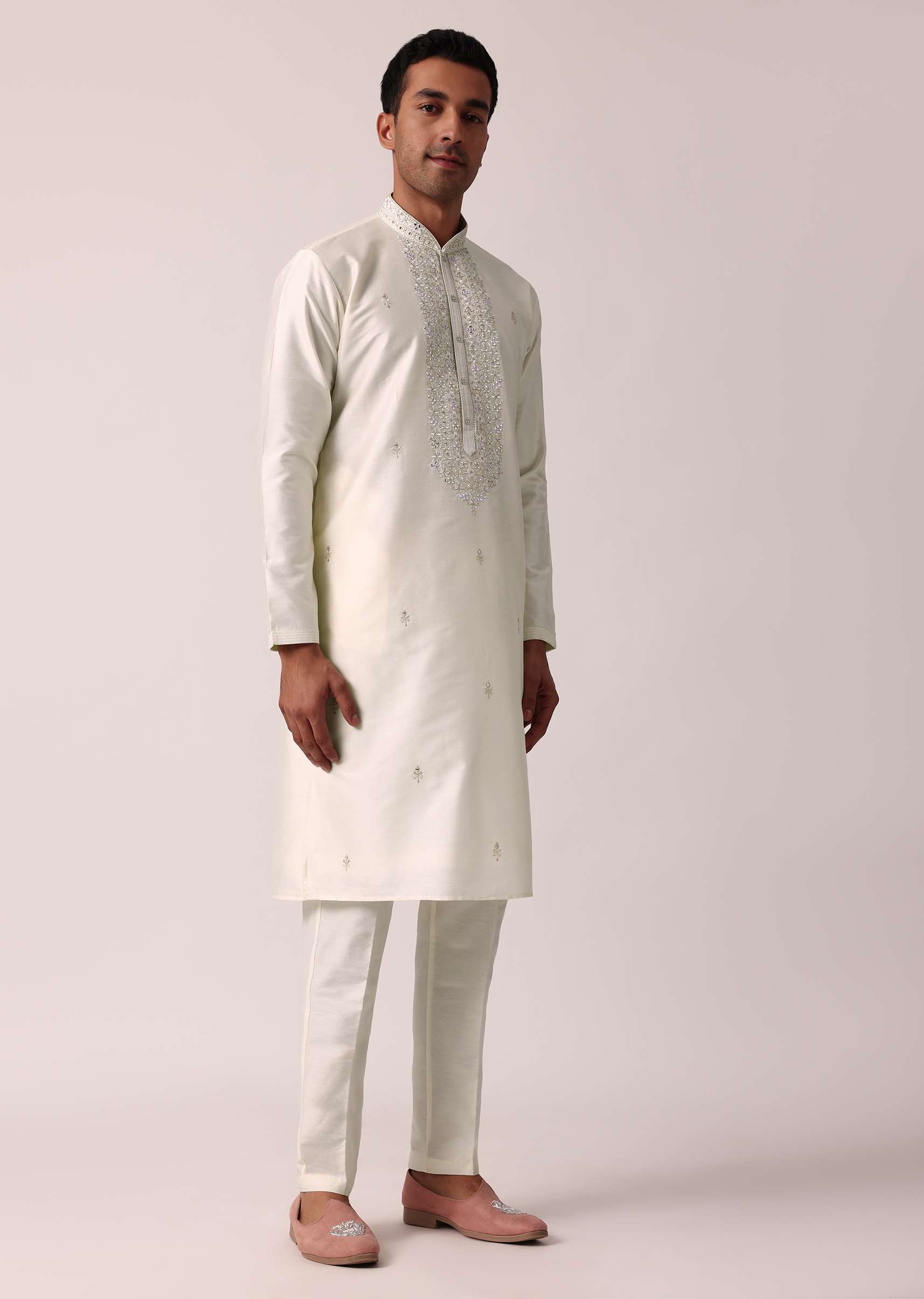 Embrace timeless elegance with our Elegant White Silk Kurta Set. It features intricate hand embroidery. The kurta, designed with a Mandarin collar and full sleeves, is a perfect choice for festive occasions. The pack includes one kurta and one bottom, ensuring a refined and complete look for your celebration. Awarded as the Most Trusted Brand, we're delivering styles you love, just as promised.
