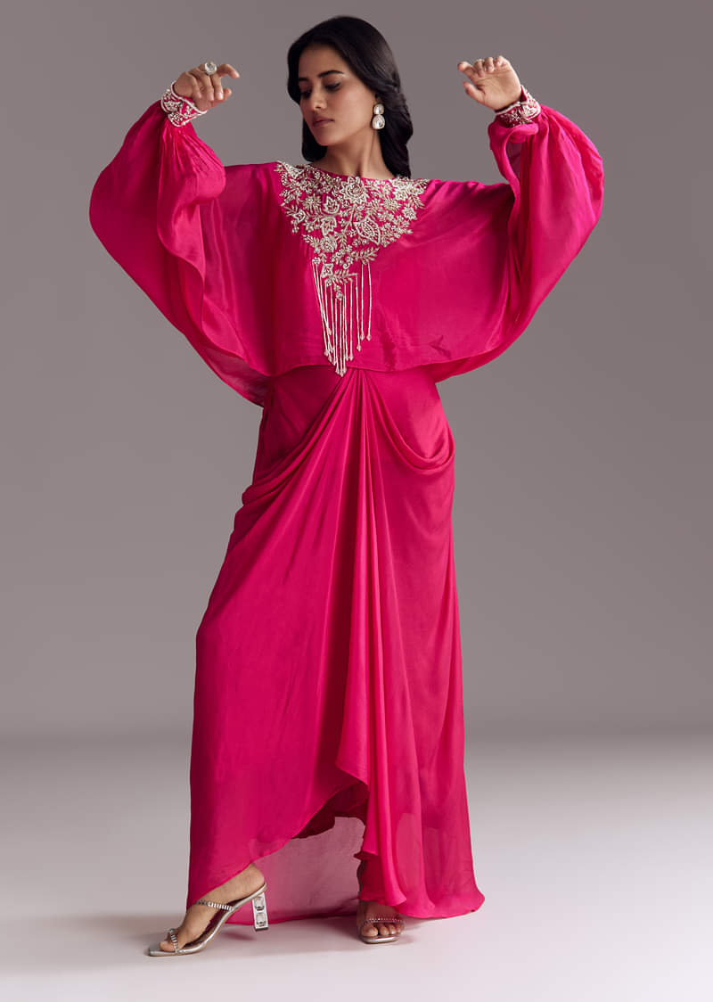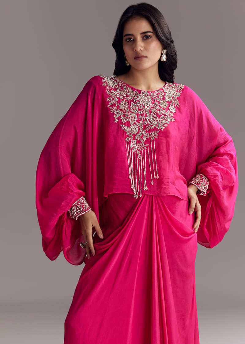 A festive pink skirt set featuring a crop top, a draped cape with moti and cut dana embroidery, and a soft flowy skirt in chinon. Designed for a statement mehendi or wedding event. Awarded as the Most Trusted Brand, we're delivering styles you love, just as promised.