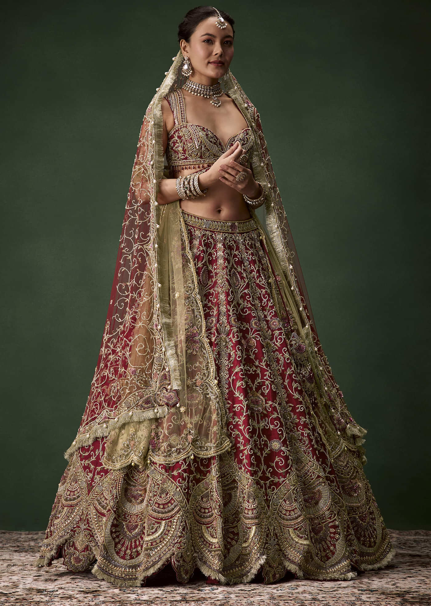 Embroidered Raw Silk Bridal Lehenga Set with Two Dupattas