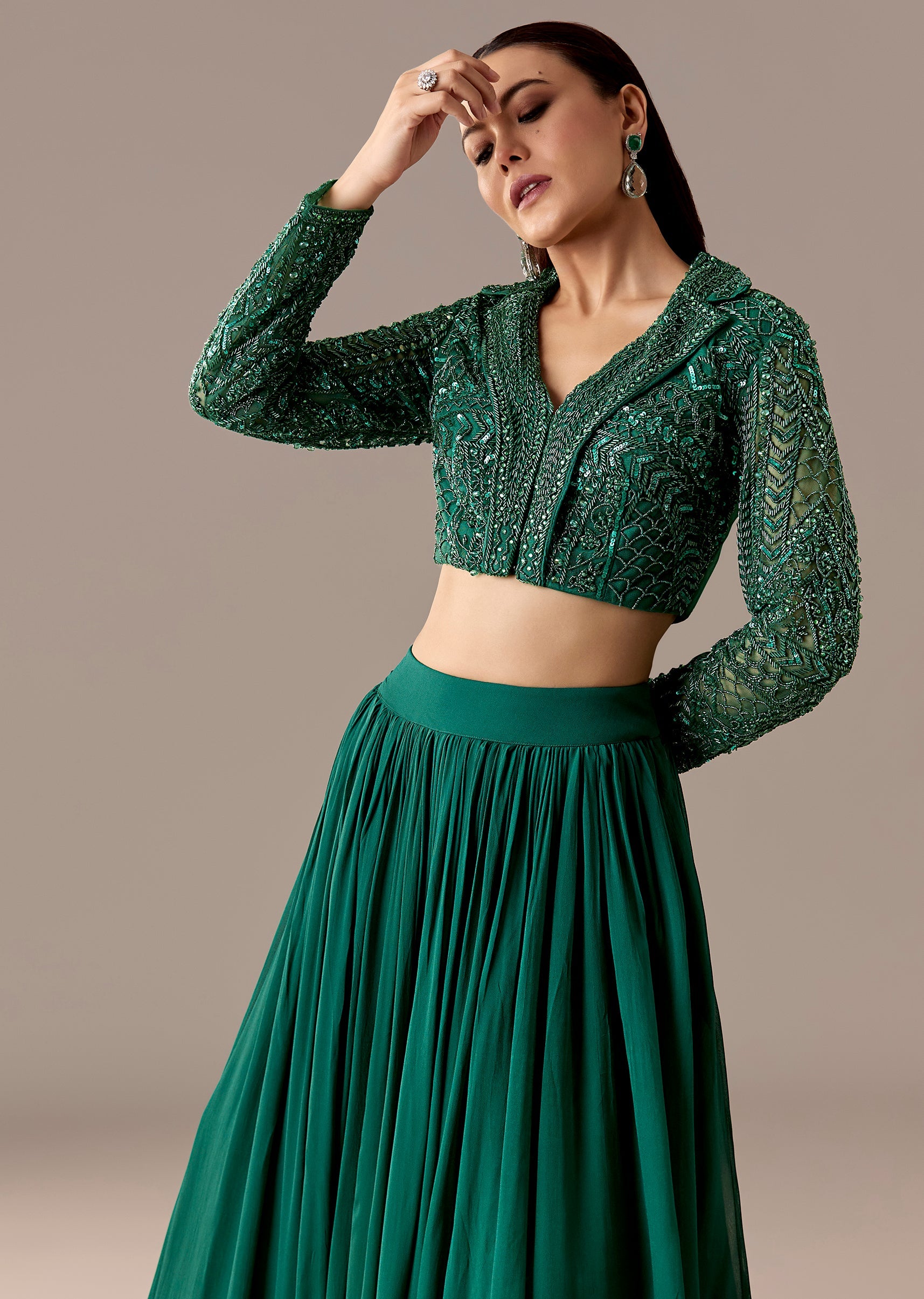 An emerald green lehenga set with a full-sleeve shirt-collar crop top embellished with cut-dana and beadwork. Paired with a flared lehenga—perfect for sangeet and reception as a bridesmaid standout.Awarded as the Most Trusted Brand, we're delivering styles you love, just as promised.