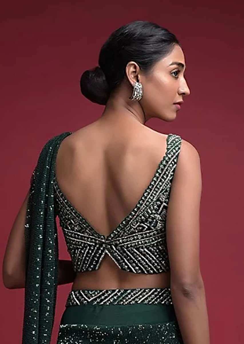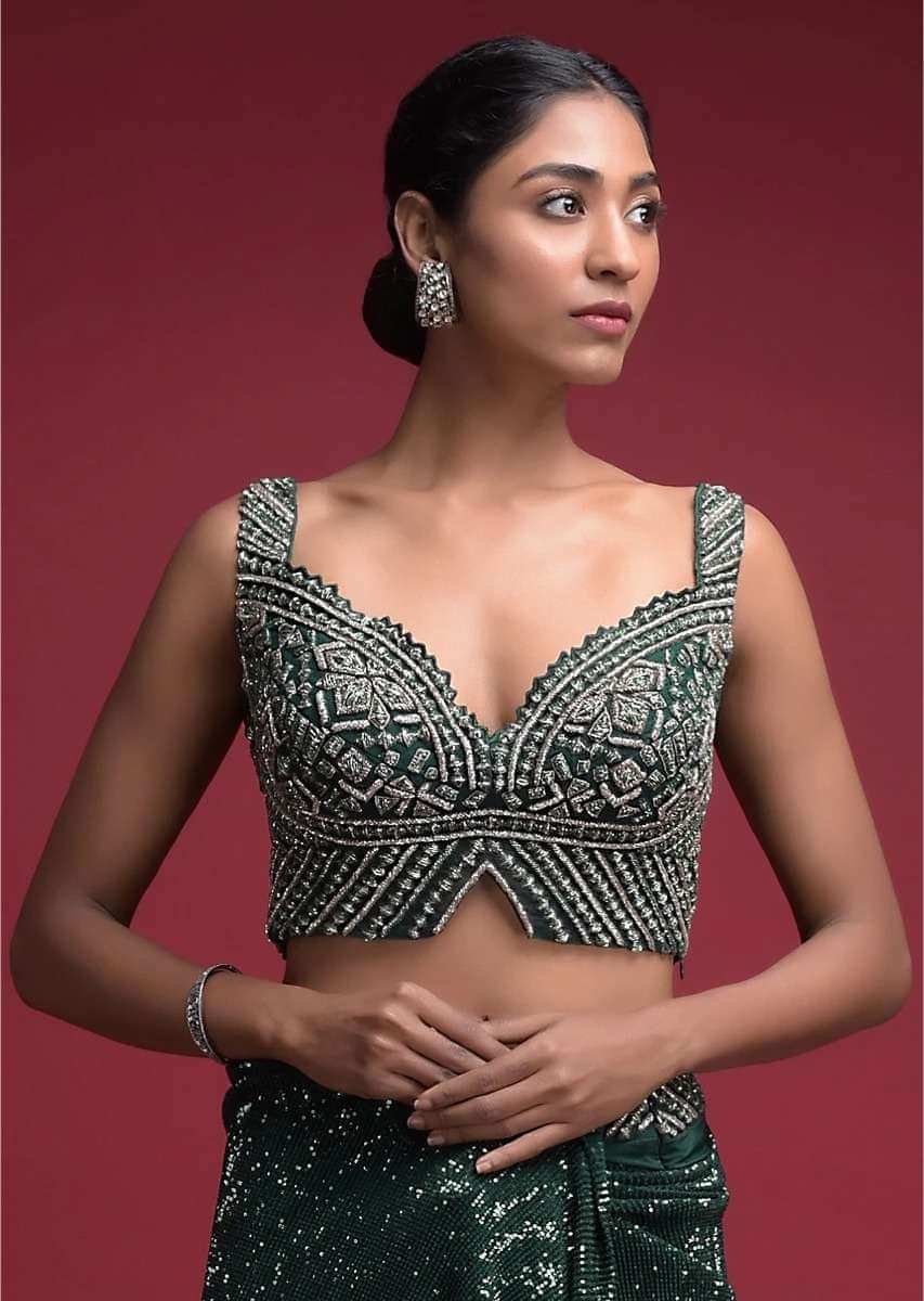 Emerald green crop top in net heavily embellished with cut dana work in geometric pattern.Constructed sleeveless with sweetheart neckline, V cut back and cut out hem.The length of the blouse is 13 inches. Awarded As The Most Trusted Brand We'Re Delivering Styles You Love Just As Promised.