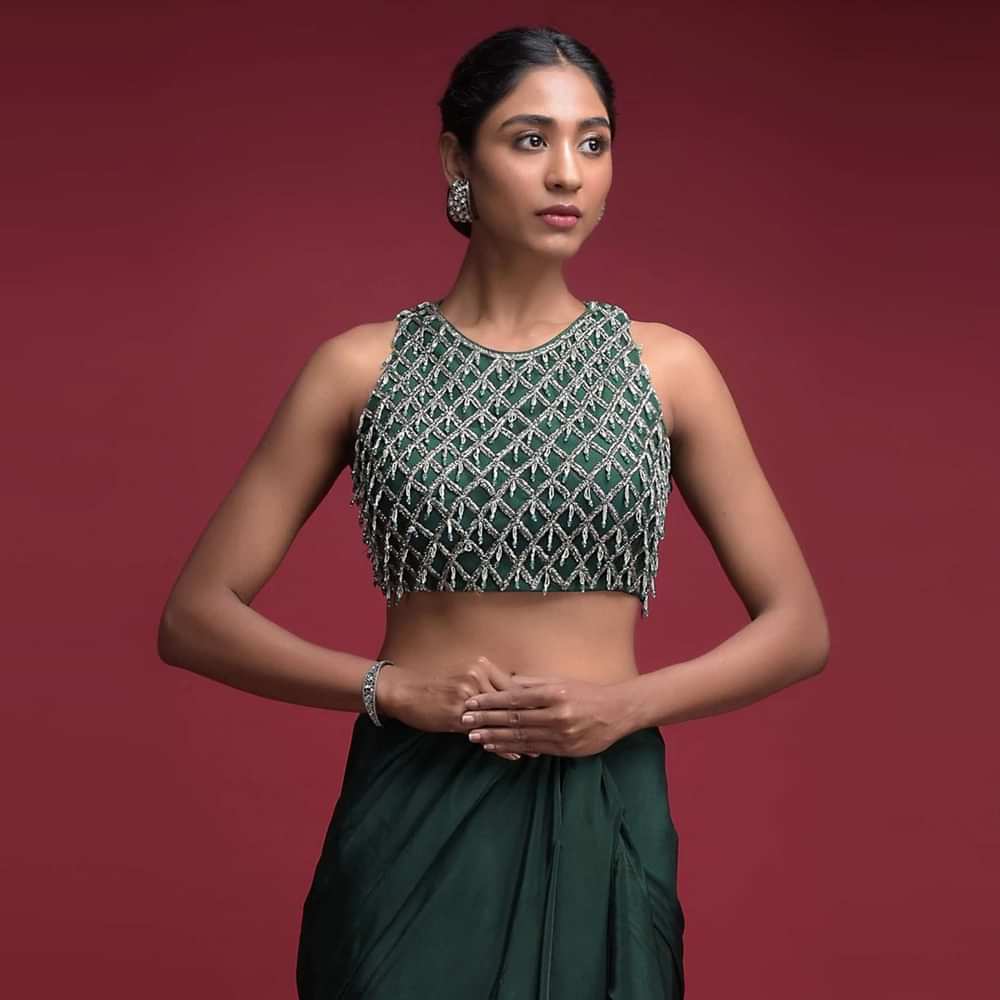 Emerald green crop top in net with cut dana embellished checks and bead tassels.Designed sleeveless with round neckline.The length of the blouse is 14 inches. Awarded As The Most Trusted Brand We'Re Delivering Styles You Love Just As Promised.