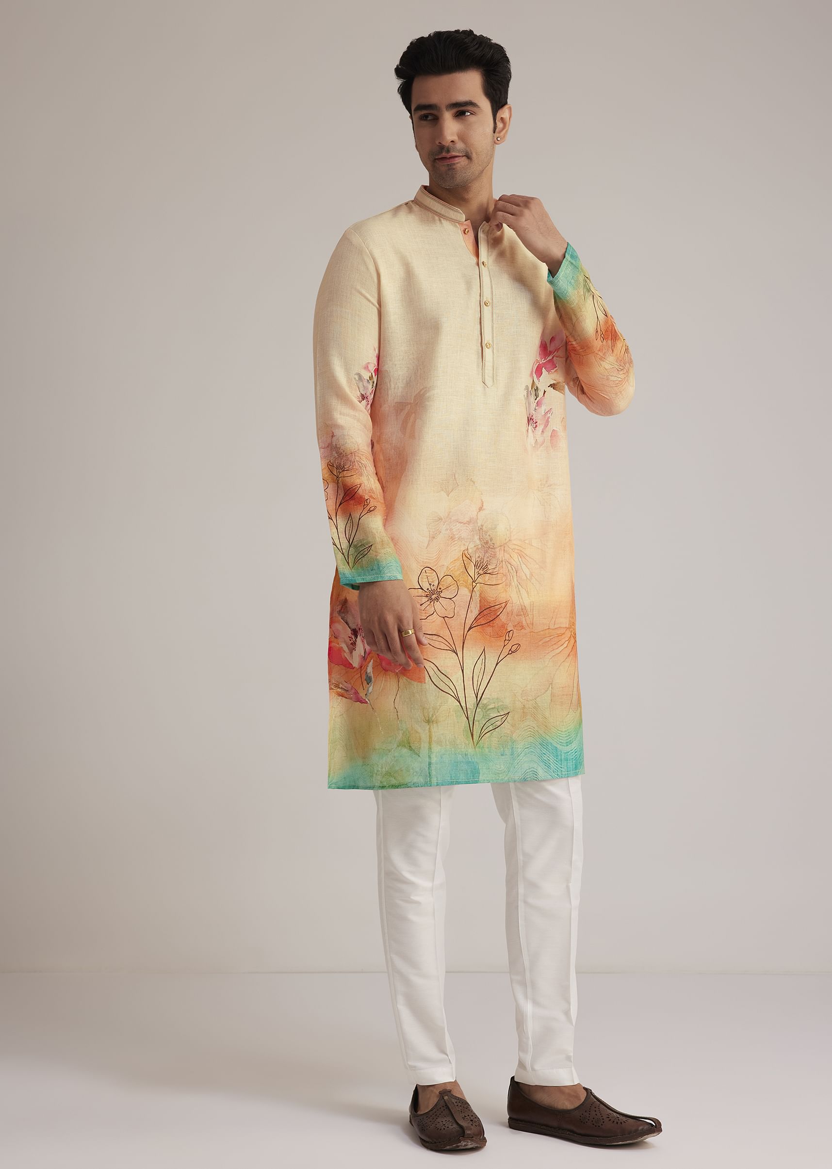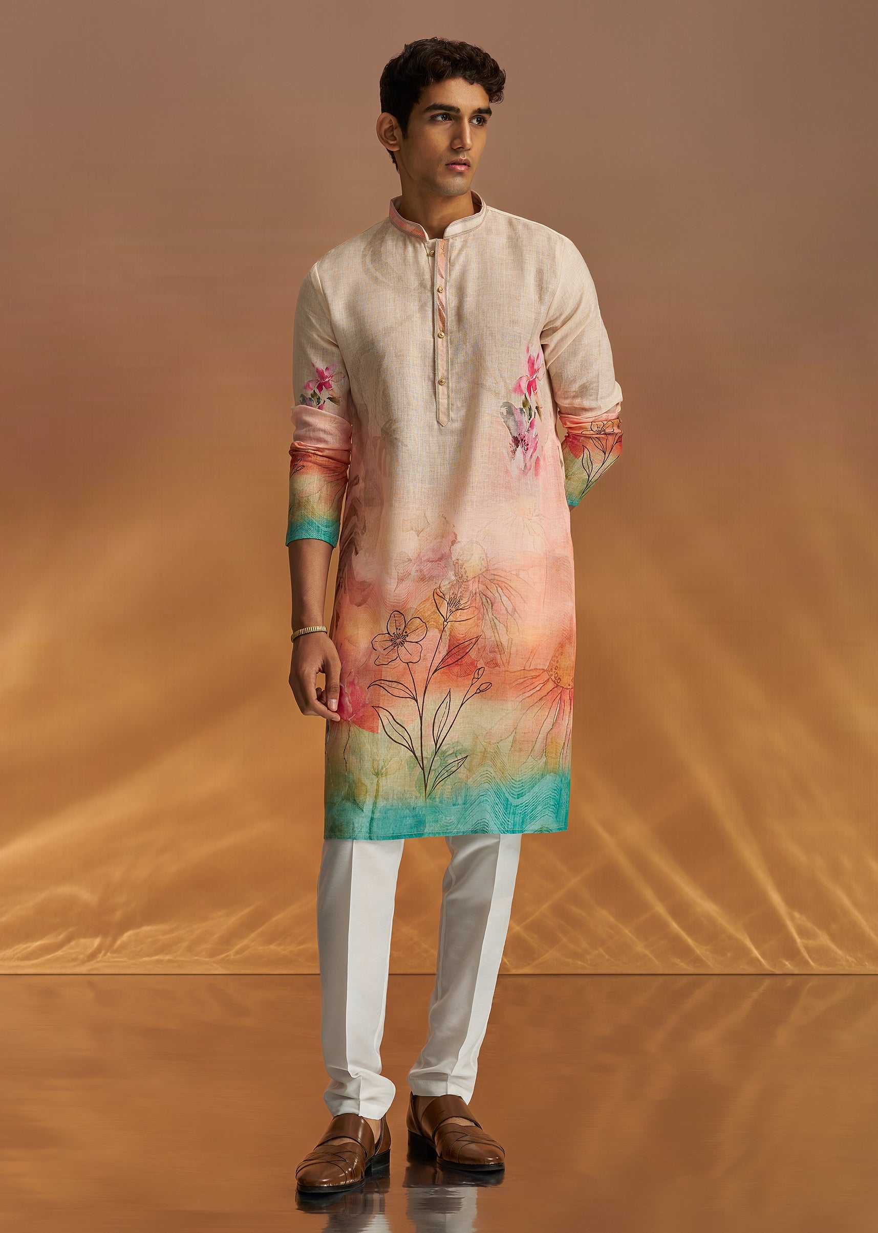 - Make A Statement With This Fawn Linen Kurta Featuring A Soothing Ombre Effect And Delicate Floral Print.