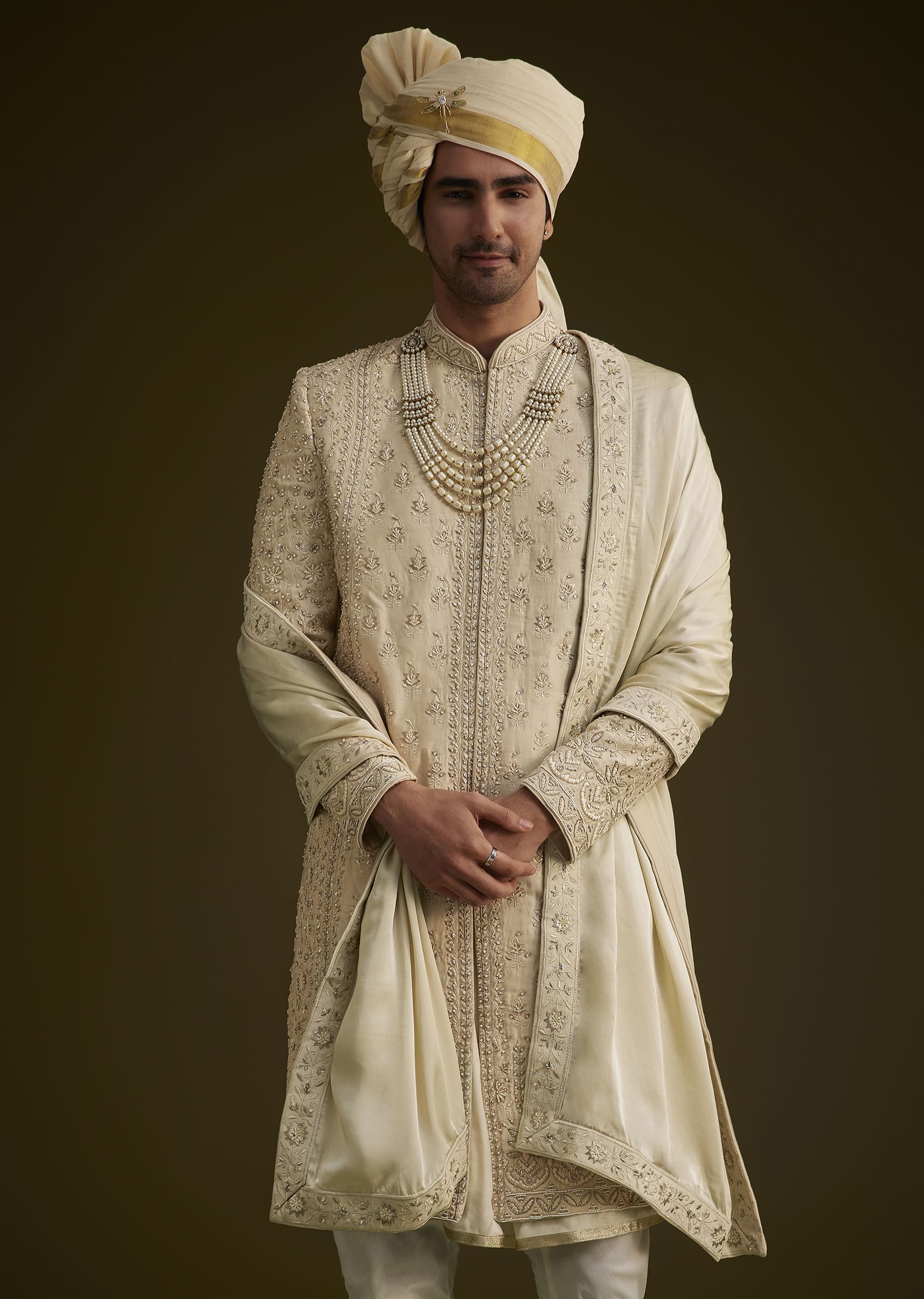 Enhance the grandeur of this sherwani by pairing it with a multilayered pearl necklace matching mojris and an intricately designed turban. For an added regal touch drape the dupatta elegantly over your shoulder and secure it with a statement brooch.