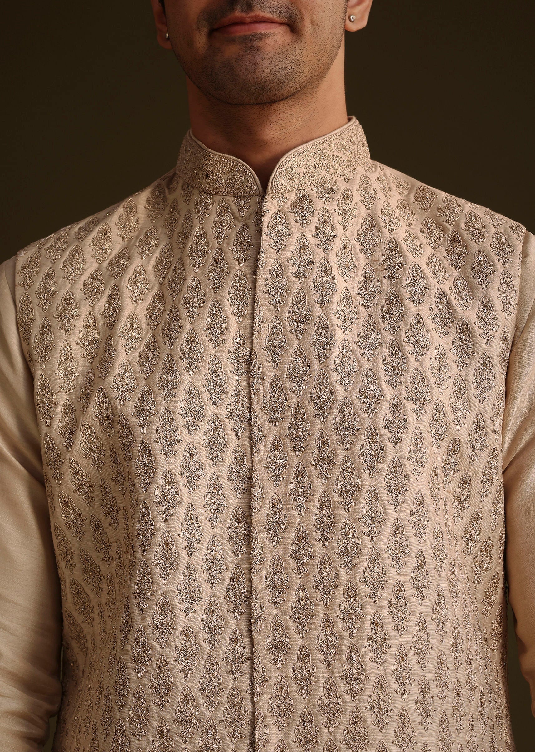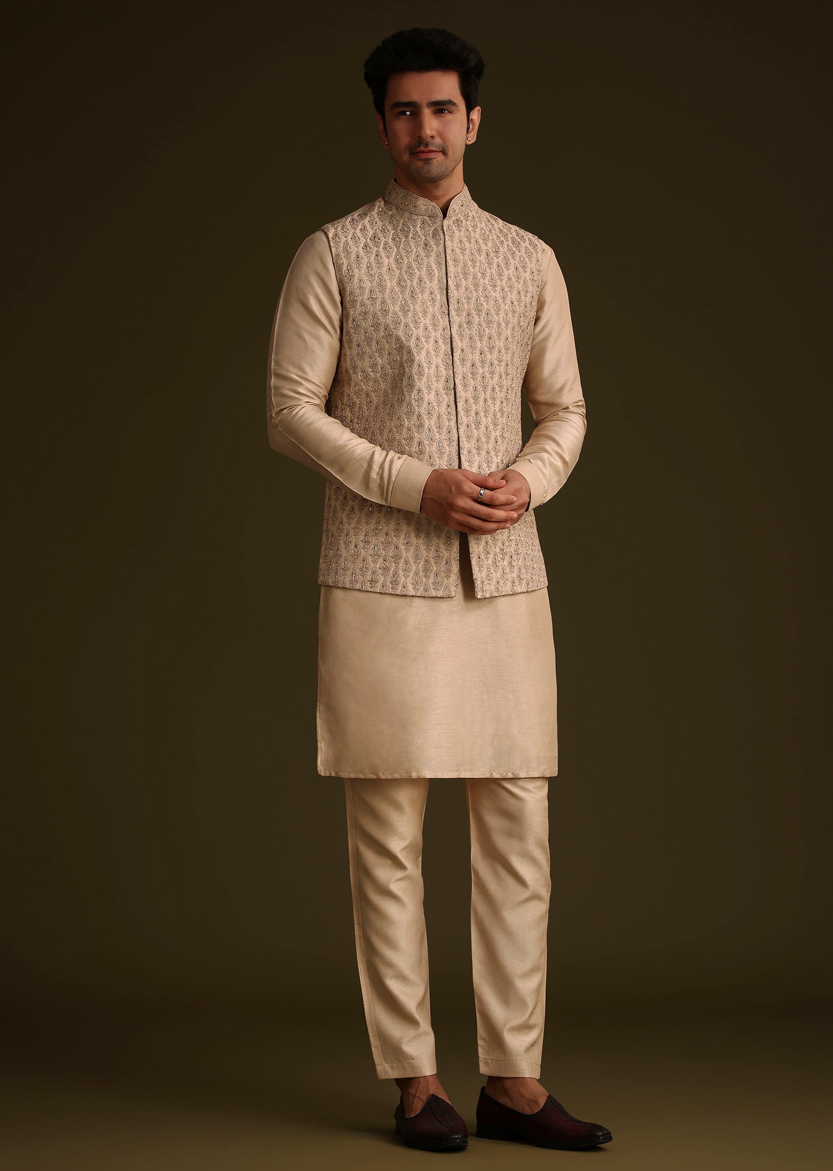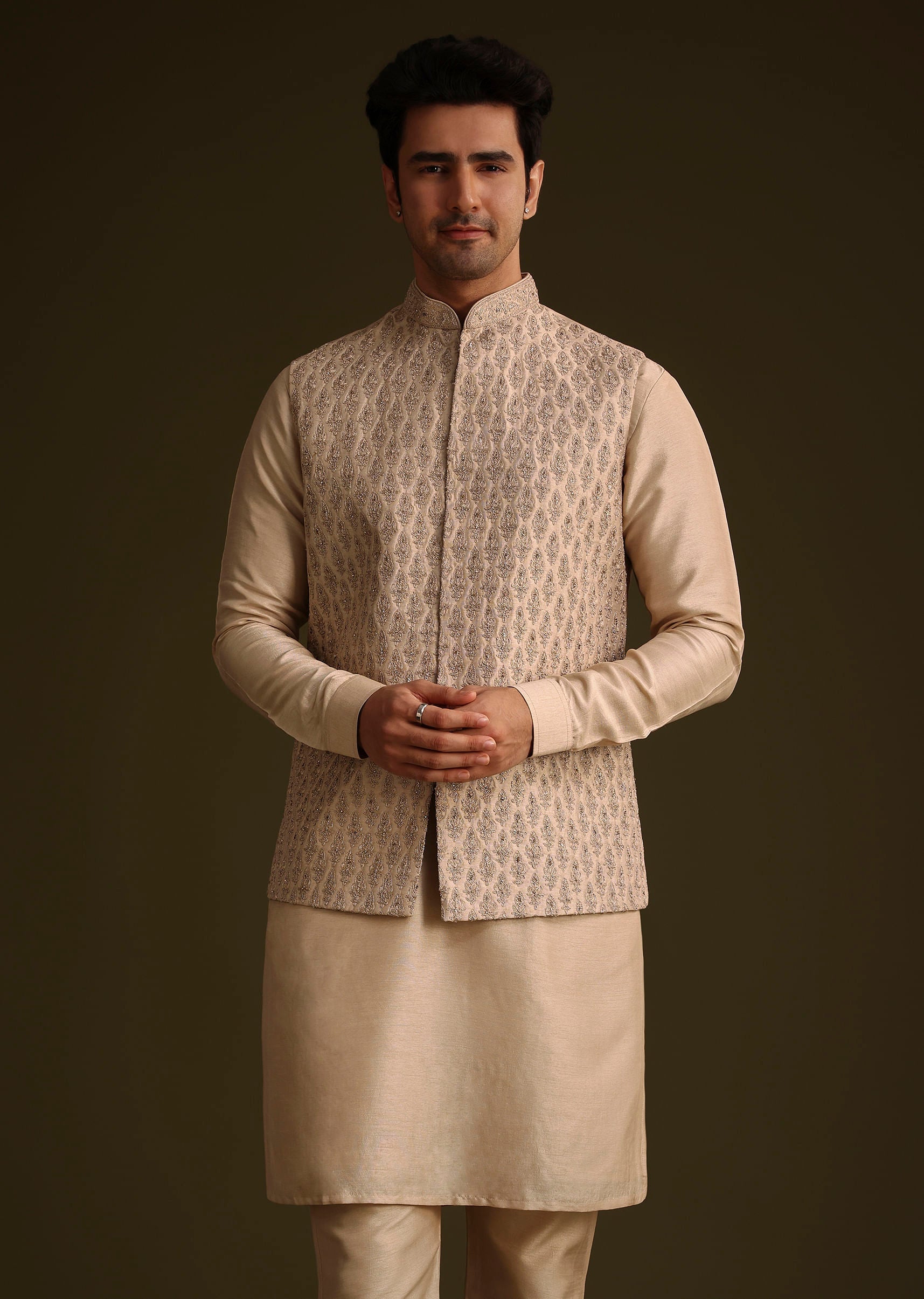 Embrace Subtle Sophistication With This Fawn Silk Jacket Set Featuring Delicate Thread And Dori Work That Adds A Touch Of Elegance. Paired With A Matching Kurta And Tailored Bottom This... More Product Details