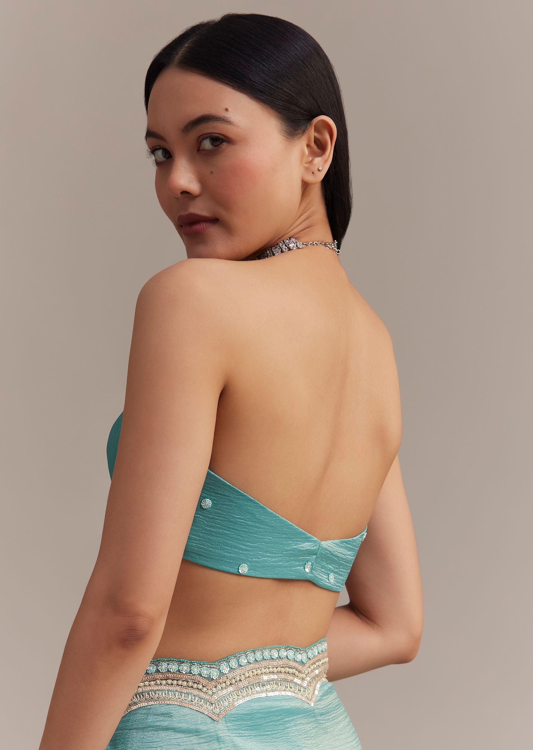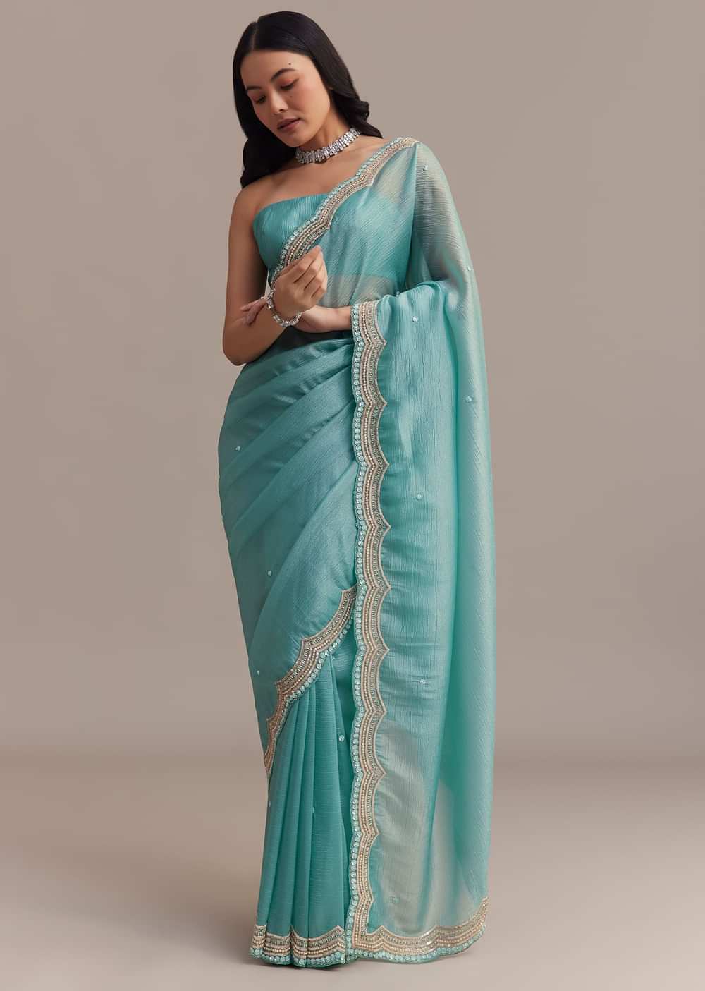 Firozi Blue Crushed Tissue Saree With Sequins Embellished Scallop Border
