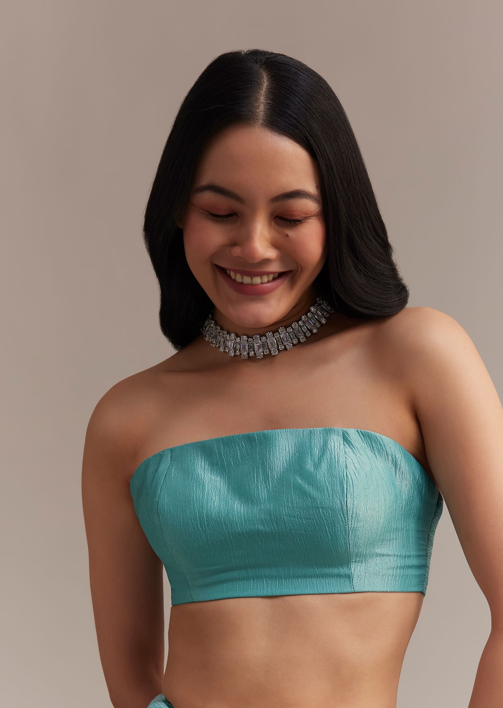 - Grace Meets Finesse In This Firozi Blue Crushed Tissue Saree Adorned With A Delicately Sequined Scallop Border That Shimmers With Every Movement.