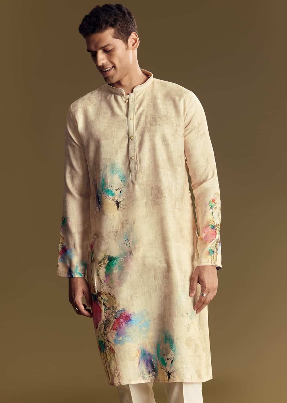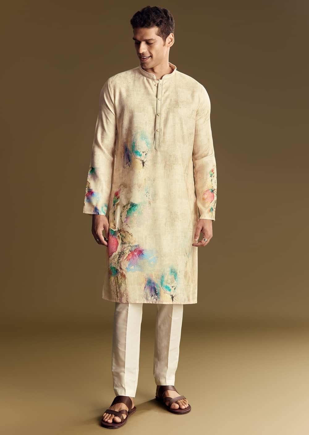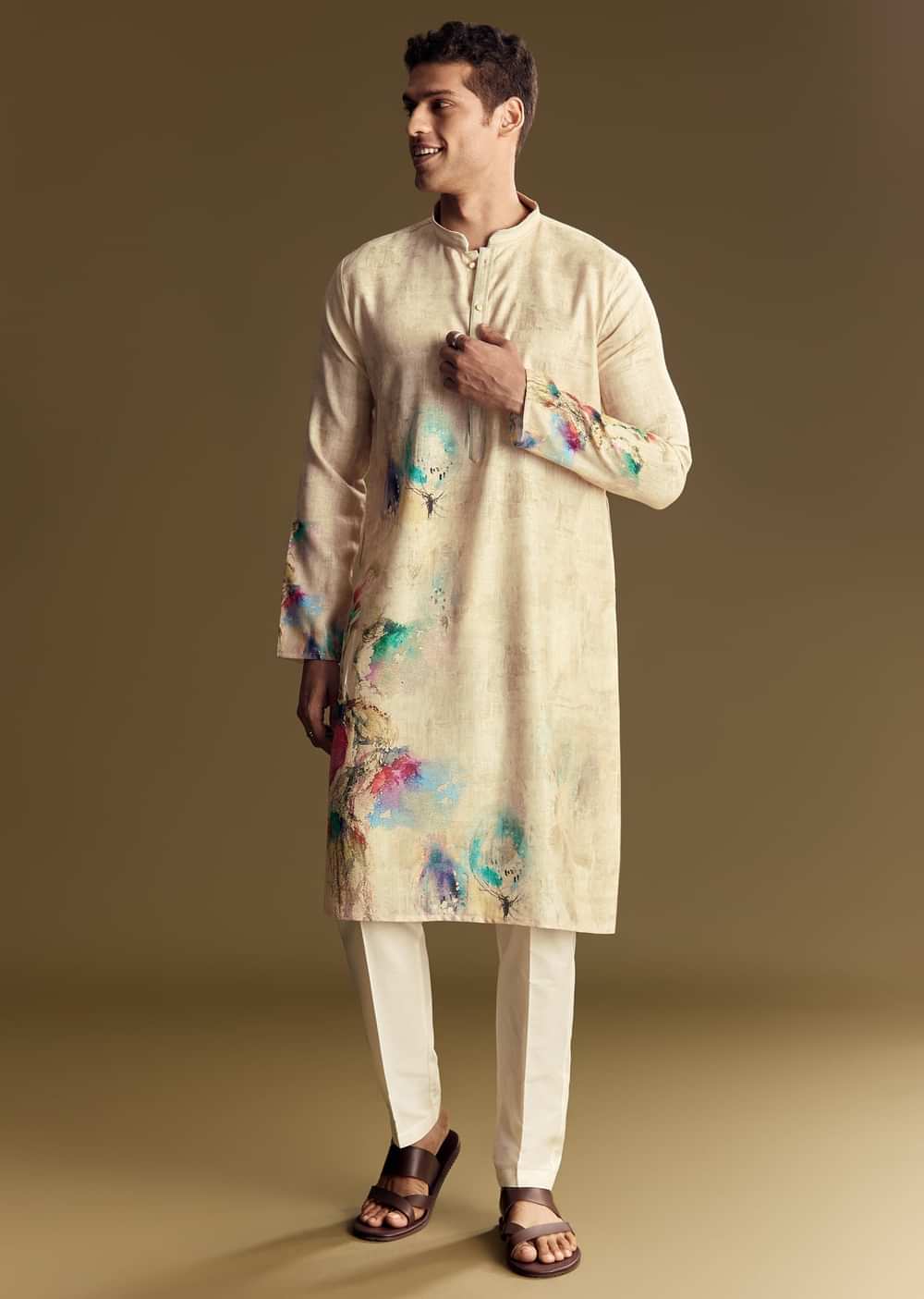 This minimal kurta set is crafted in breathable beige linen, featuring full sleeves and a mandarin collar. A go-to for casual occasions and poojas, it offers a clean, fuss-free silhouette... More Product Details