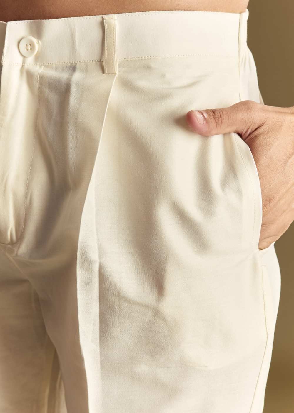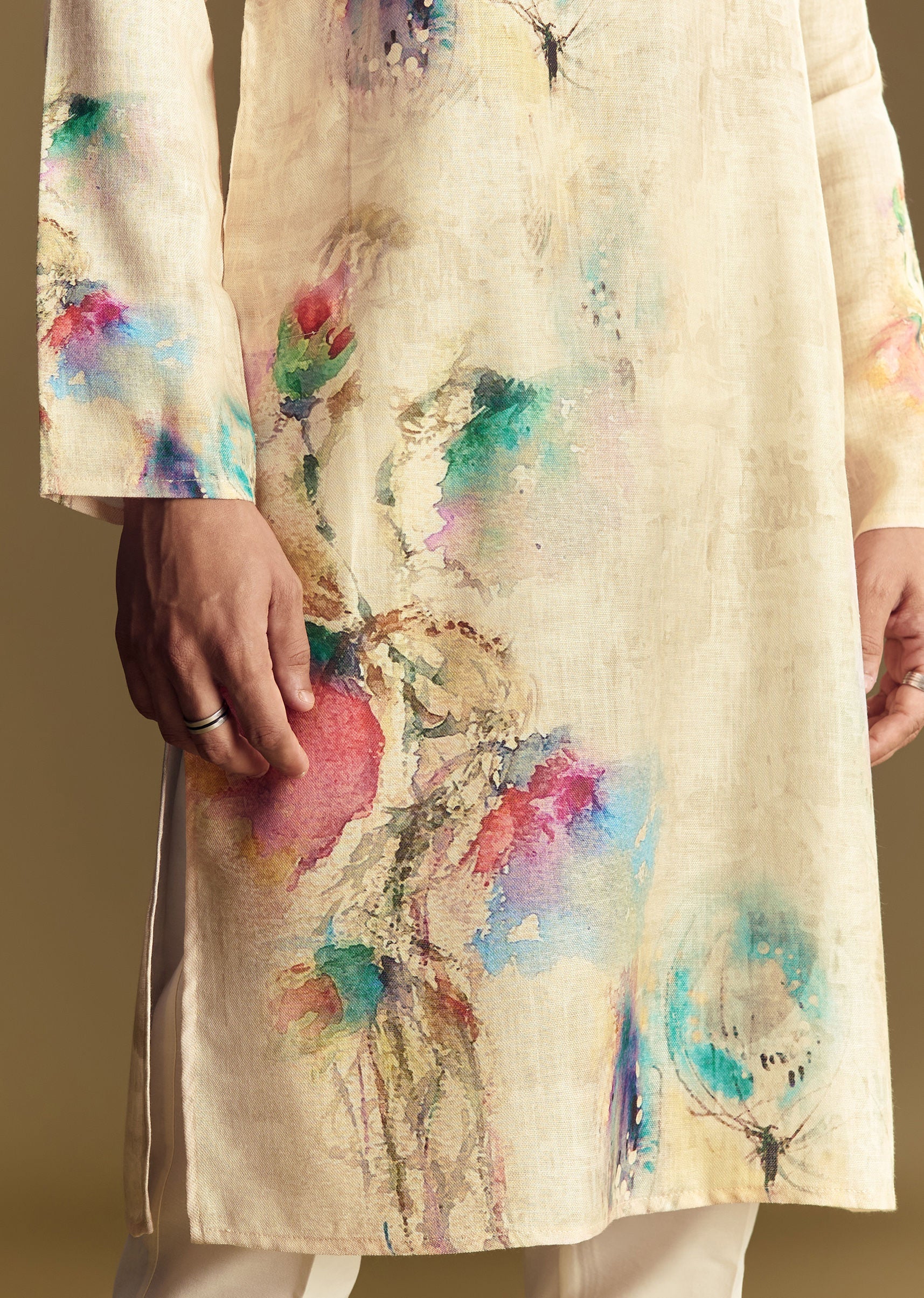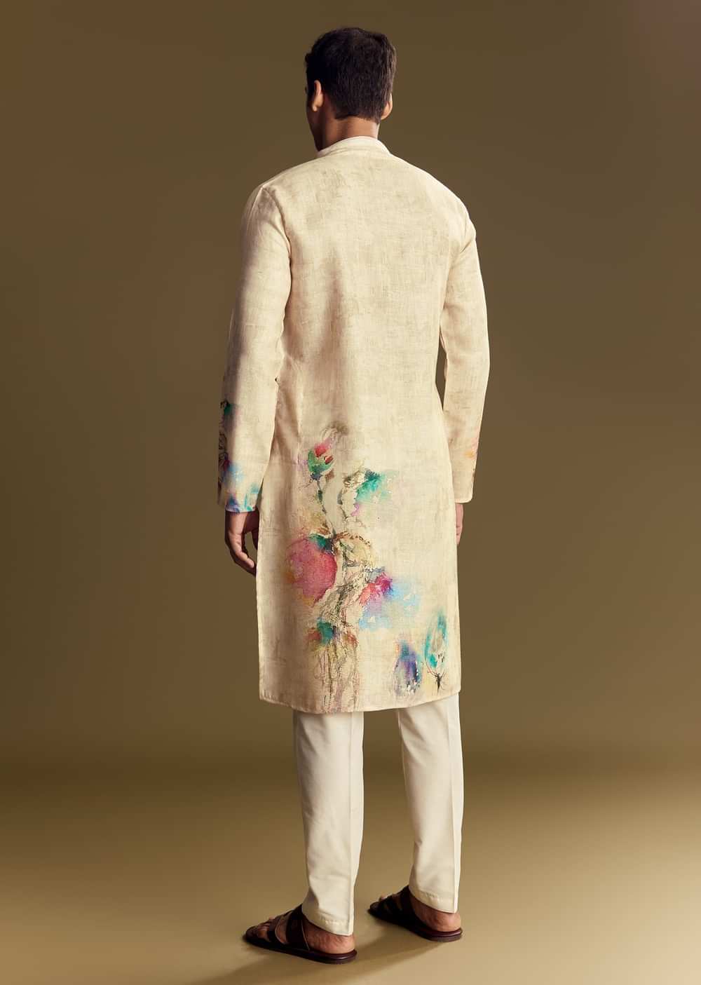 This minimal kurta set is crafted in breathable beige linen, featuring full sleeves and a mandarin collar. A go-to for casual occasions and poojas, it offers a clean, fuss-free silhouette... More Product Details