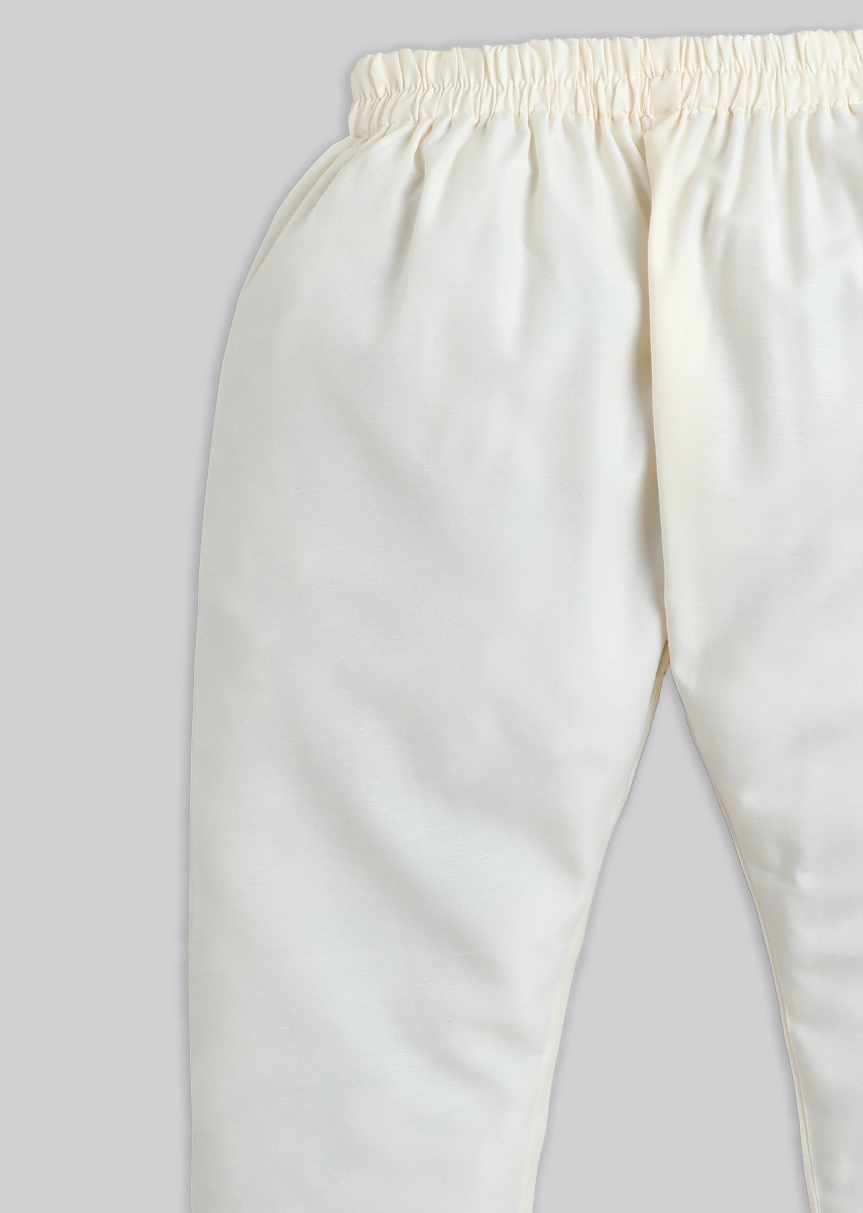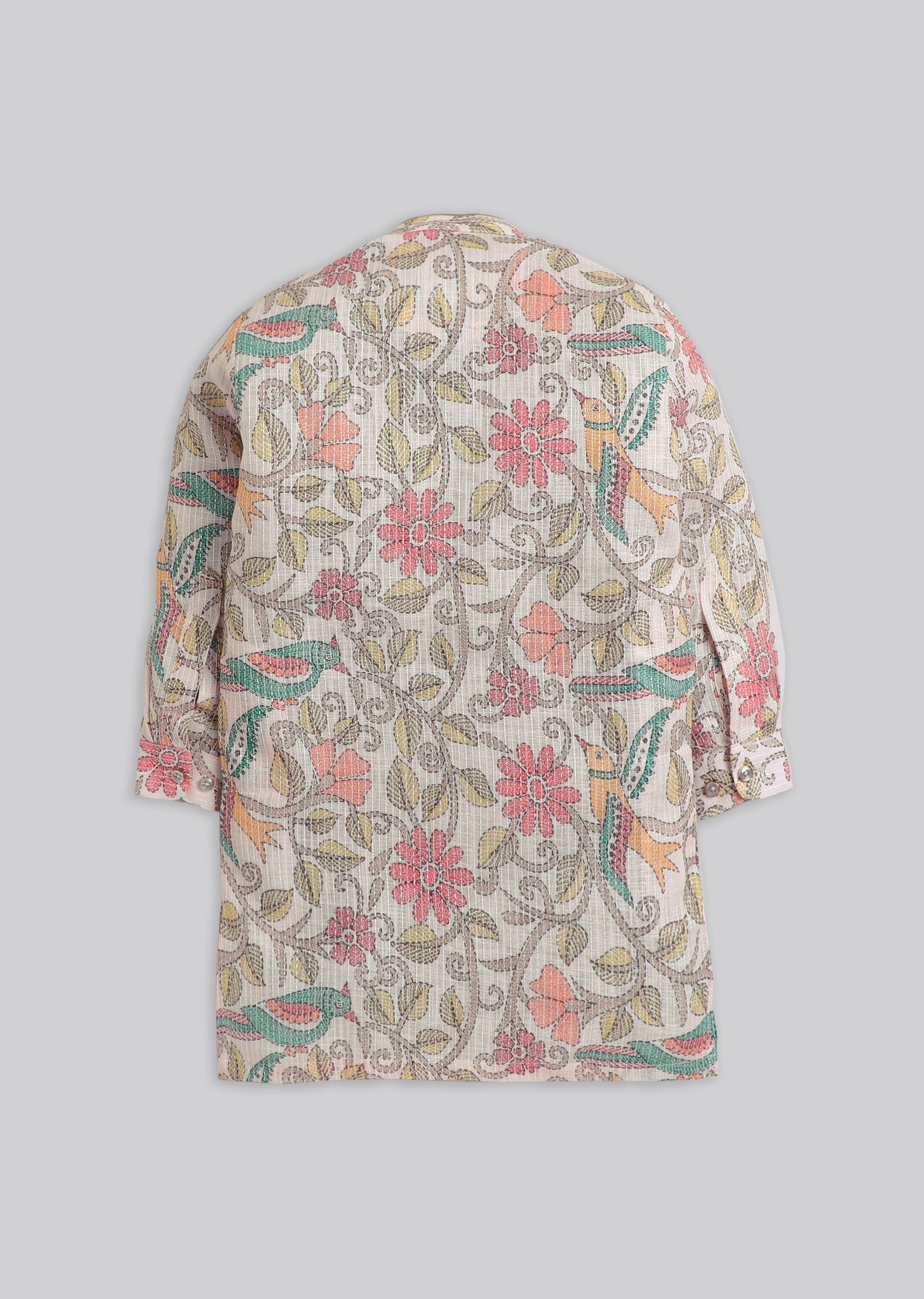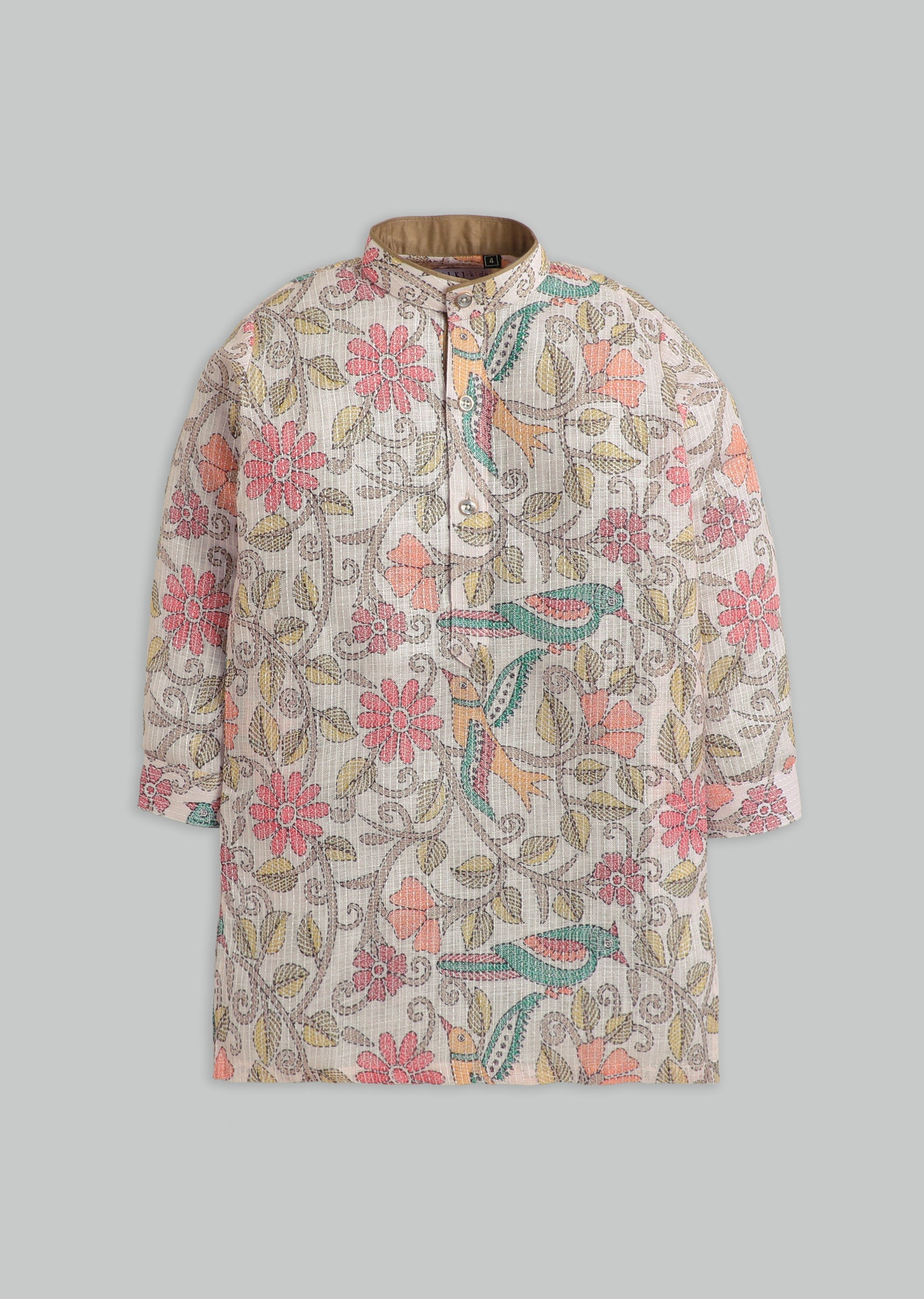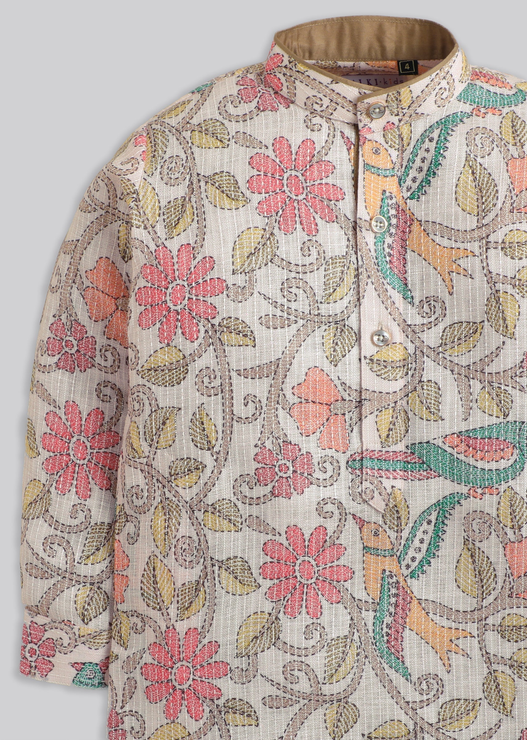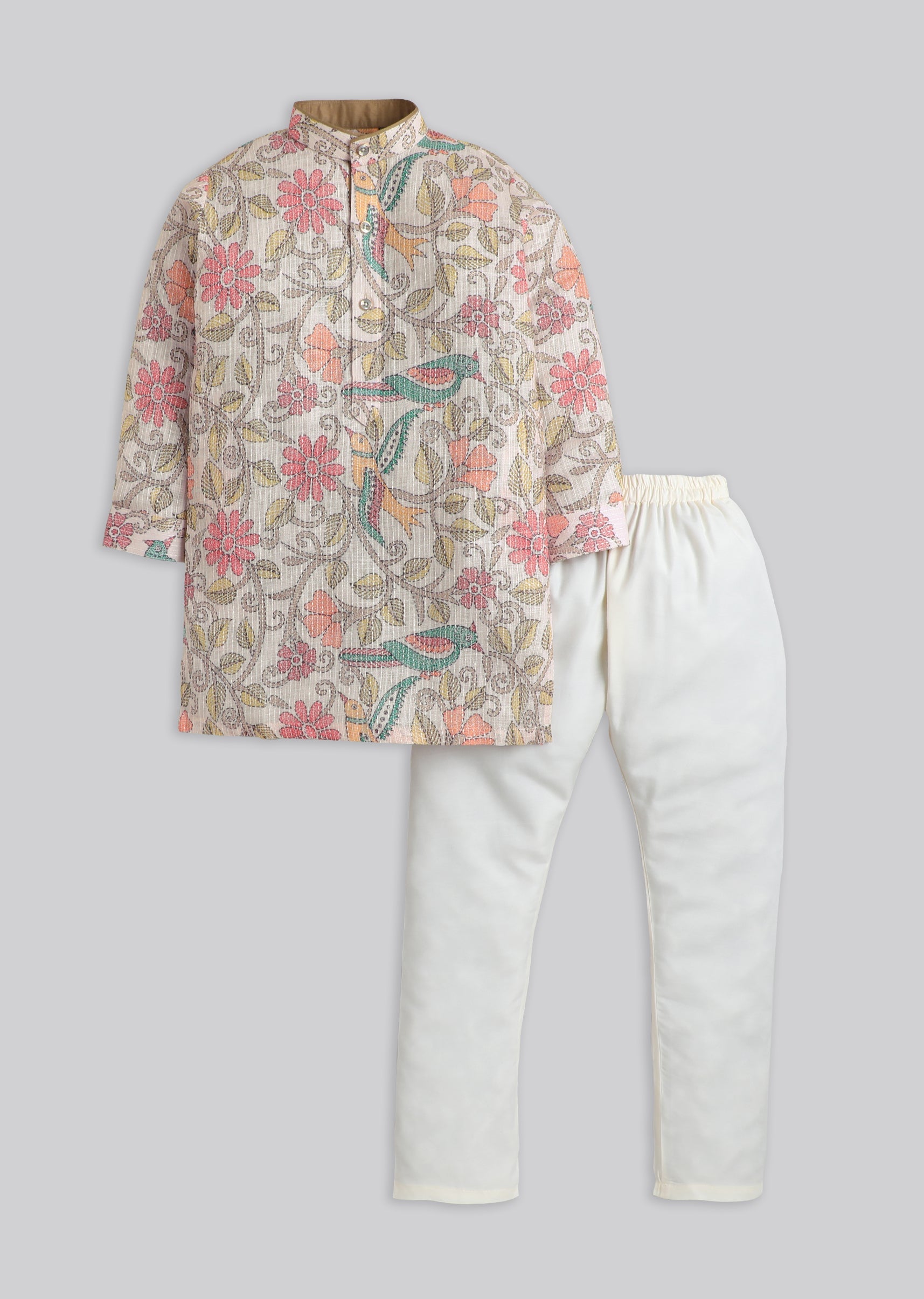 A pastel beige boys’ kurta set with floral print detailing, finished with a mandarin collar, 3/4th sleeves, and front buttons. Includes matching pants—perfect for festive mornings. Awarded as the Most... More Product Details