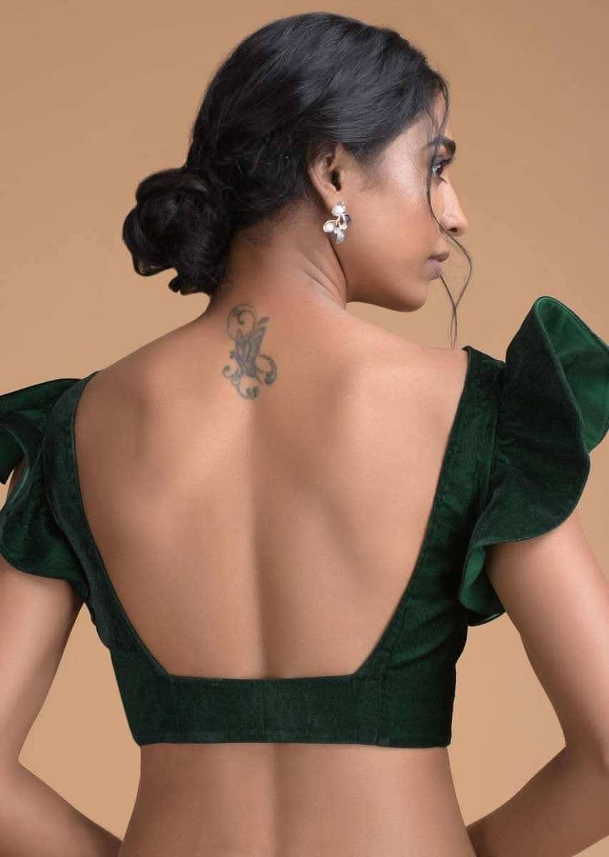 Forest Green Blouse In Velvet With Trapeze Neck And Ruffle Sleeves