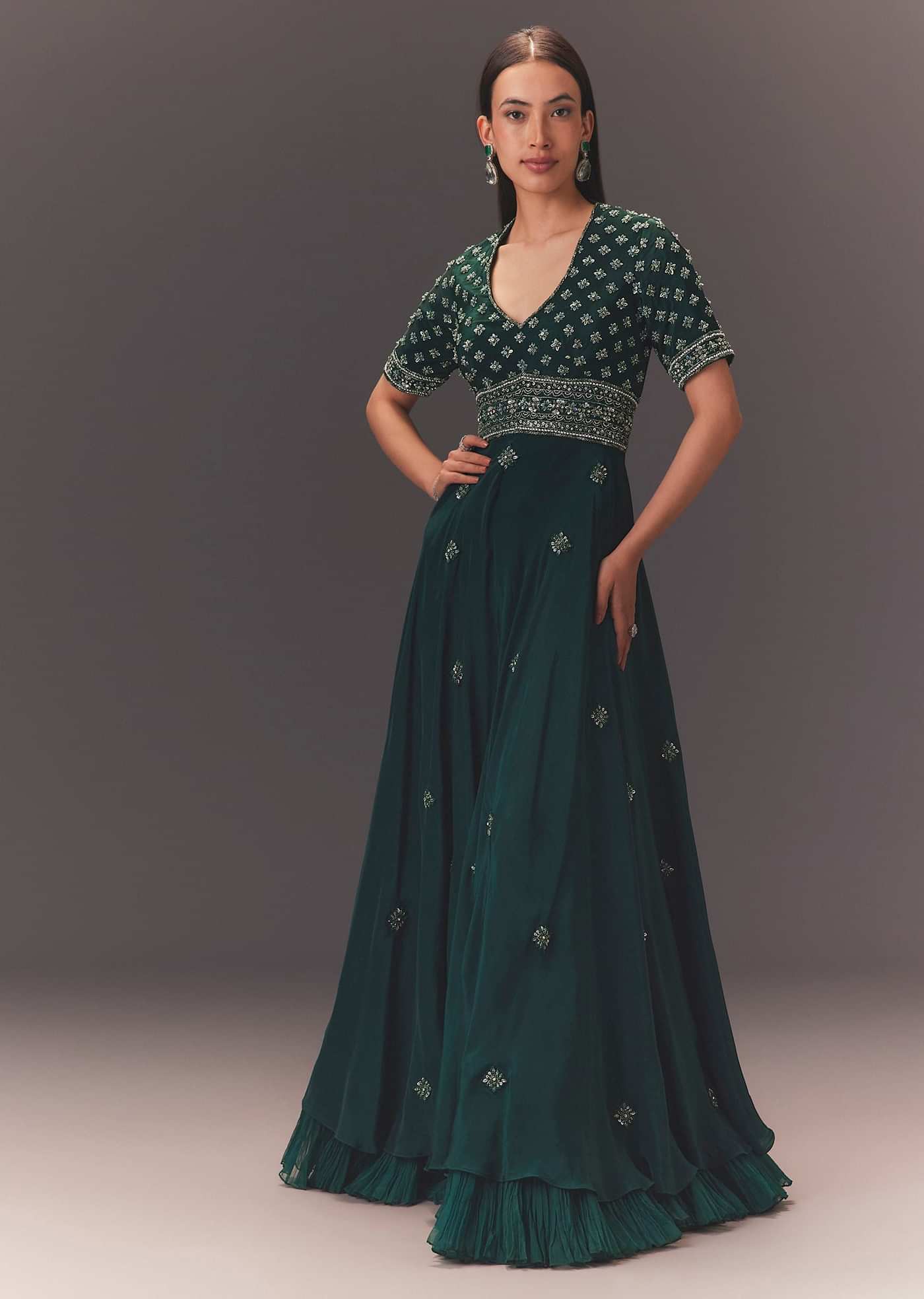 This forest green jumpsuit features a V neck blouse with a broad belt and sharara style pants.Butti accents add unique detailing while the layered design creates a flowy silhouette.Perfect for... More Product Details