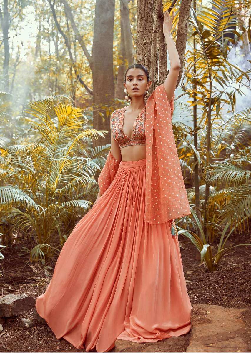 Fusion Coral Skirt In Crepe With Hand Embroidered Raw Silk Choli With Plunging Neckline