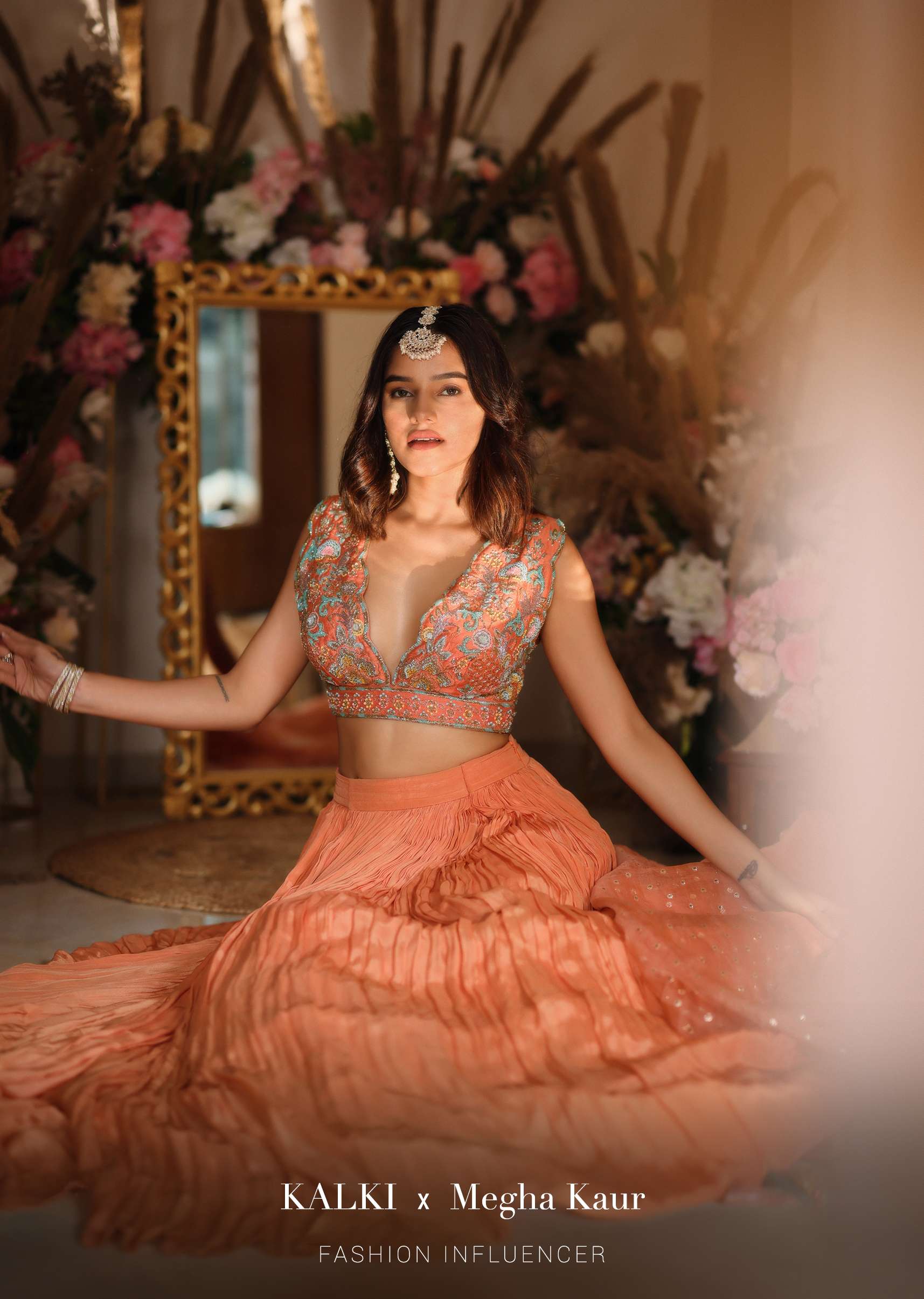 Fusion Coral skirt in crepe paired with a matching sleeveless crop top in raw silk. It is adorned with sequins, beads and cut dana embroidered floral design. The choli is crafted with plunging neckline. Topped with a matching organza dupatta with lurex buttis. The length of the blouse is 13 inches. This piece comes with cancan. Awarded As The Most Trusted Brand We'Re Delivering Styles You Love Just As Promised.