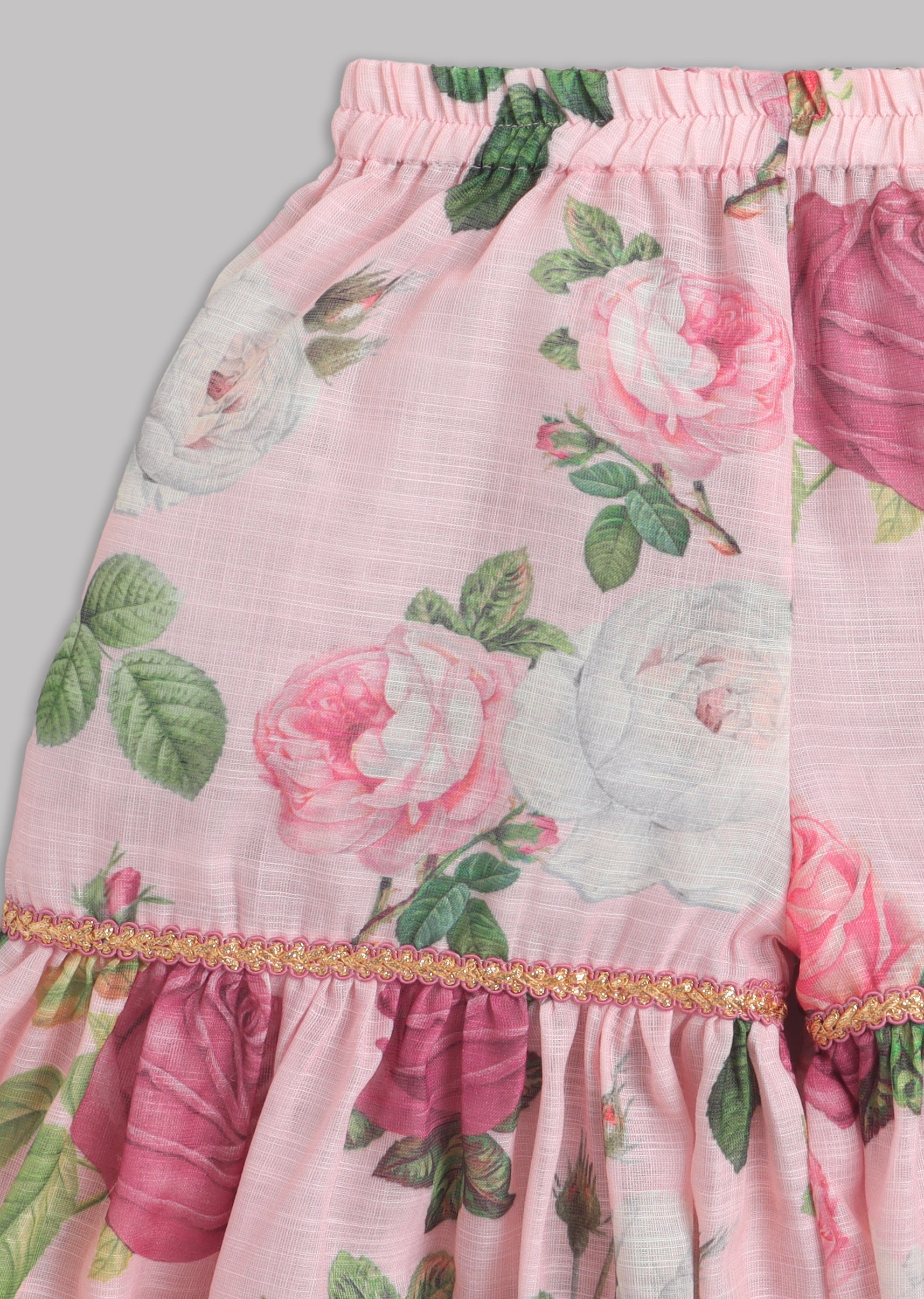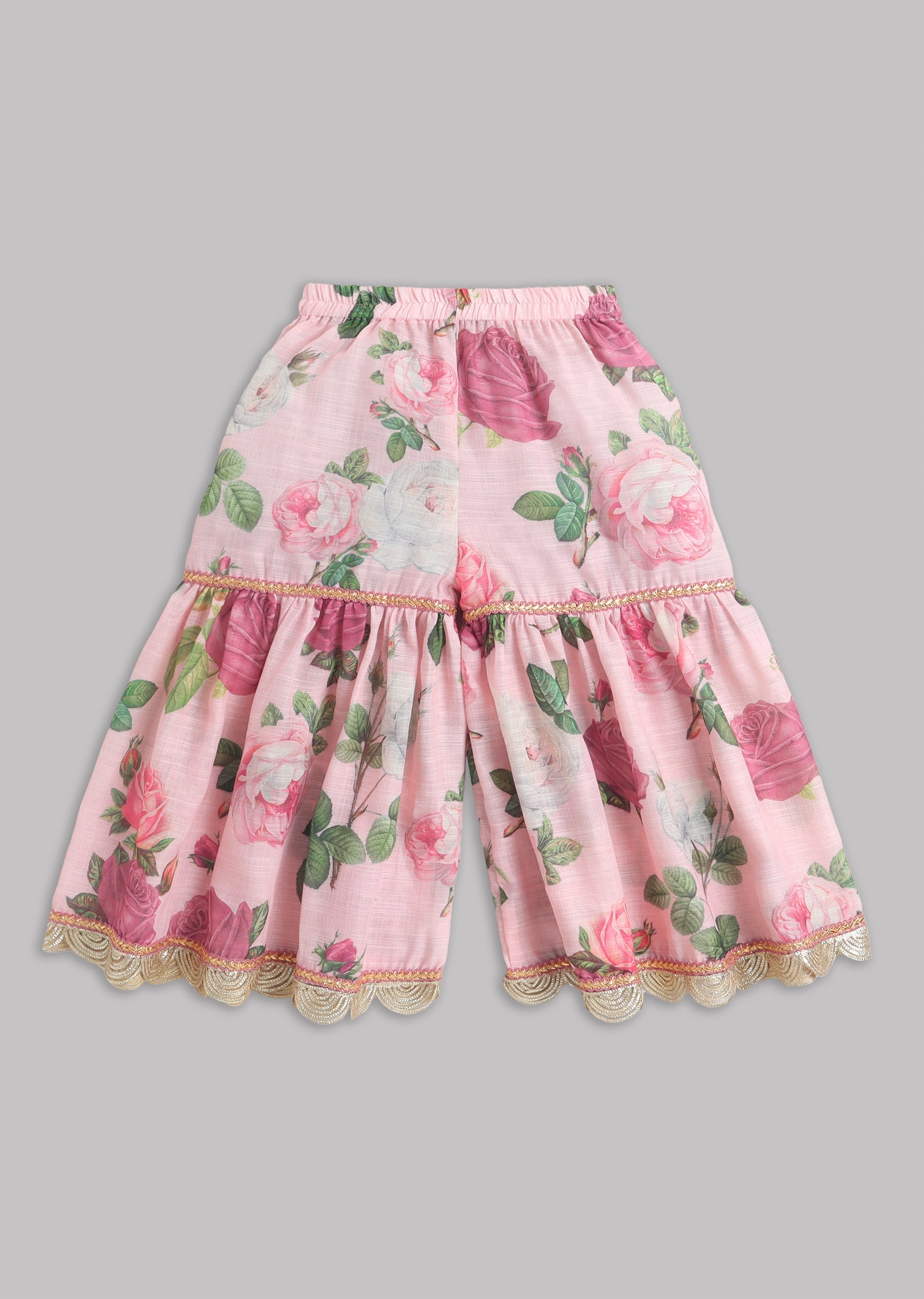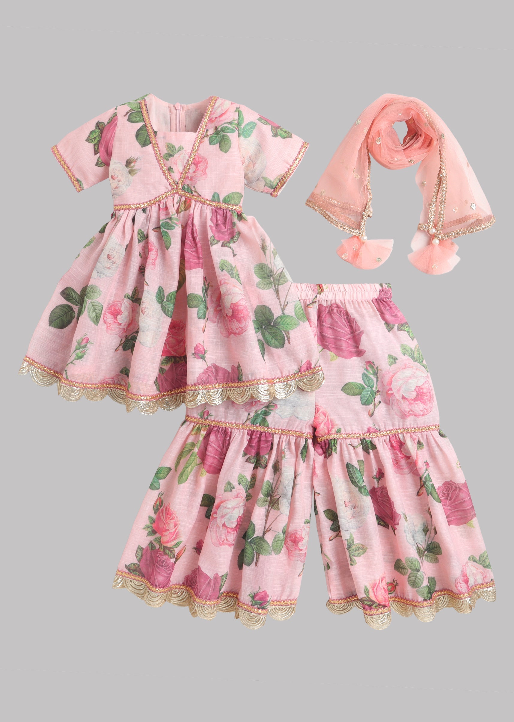 This baby pink salwar kameez set includes a printed kurti finished with delicate lace details, paired with a printed sharara accented with lace. The look is completed with a peach... More Product Details