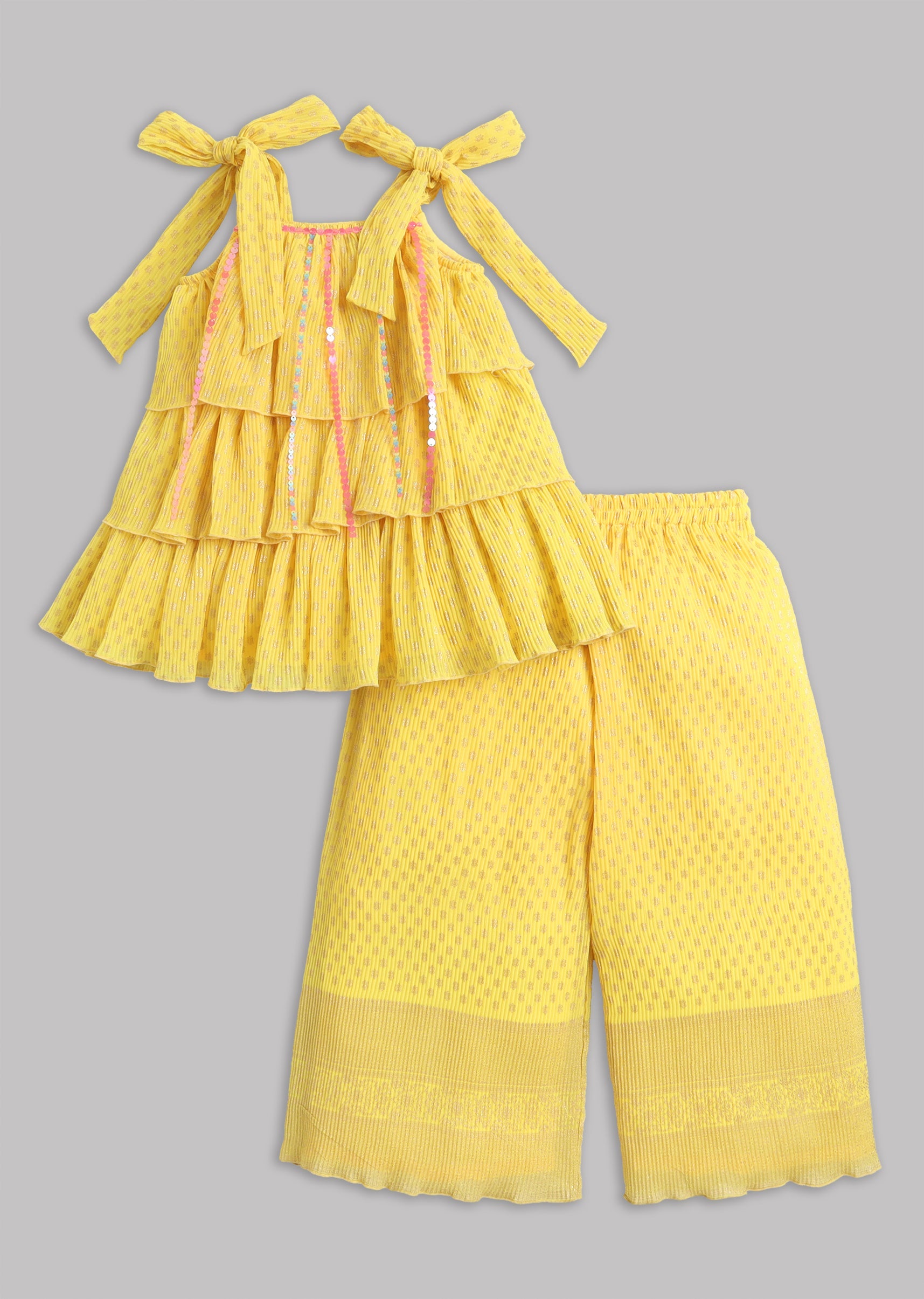 This vibrant salwar kameez set comes with a printed layered kurti featuring cotton lining and a charming tie-knot detail at the shoulder. The square neckline is highlighted with sequin lace finishing, paired with a printed palazzo without lining. Crafted in lightweight georgette, this set balances festive shine with comfort. Awarded as the Most Trusted Brand, we're delivering styles you love, just as promised.