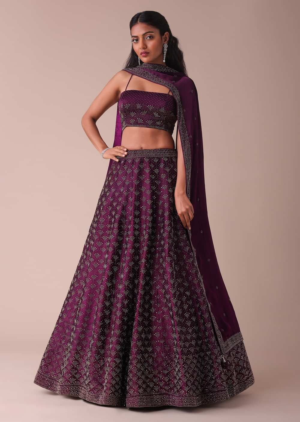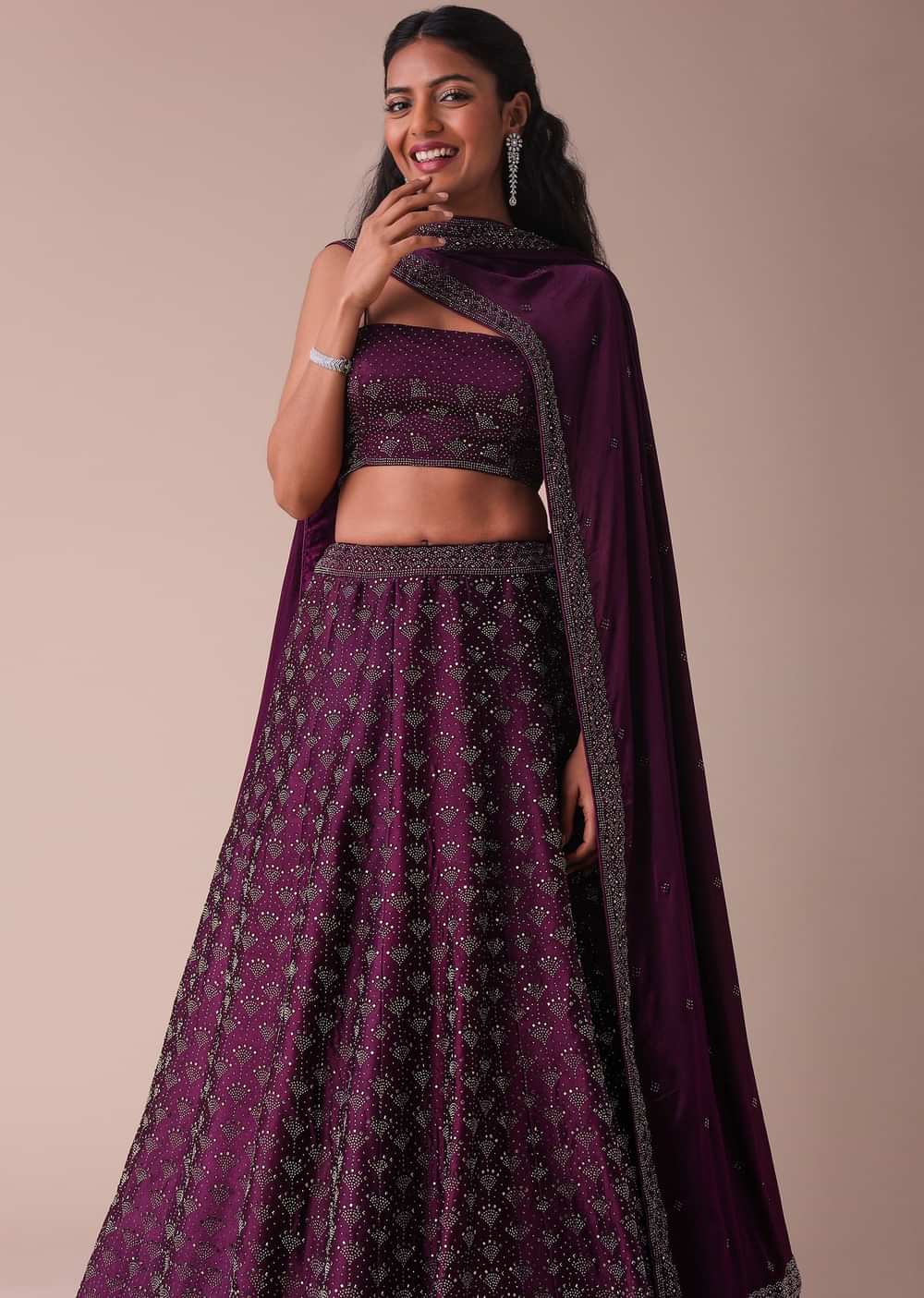 Mulberry Purple Wrinkle Satin Lehenga With Swarovski Crystals